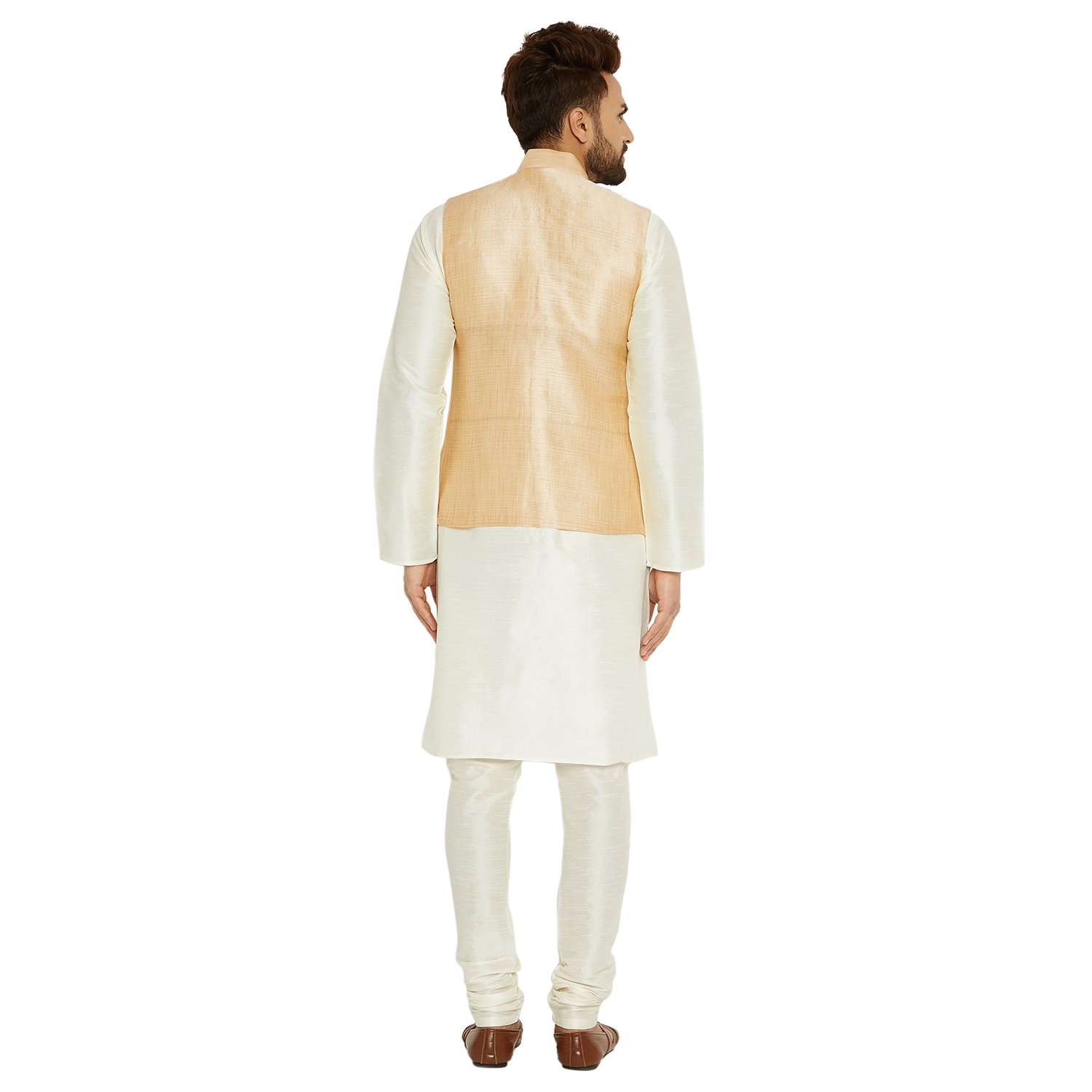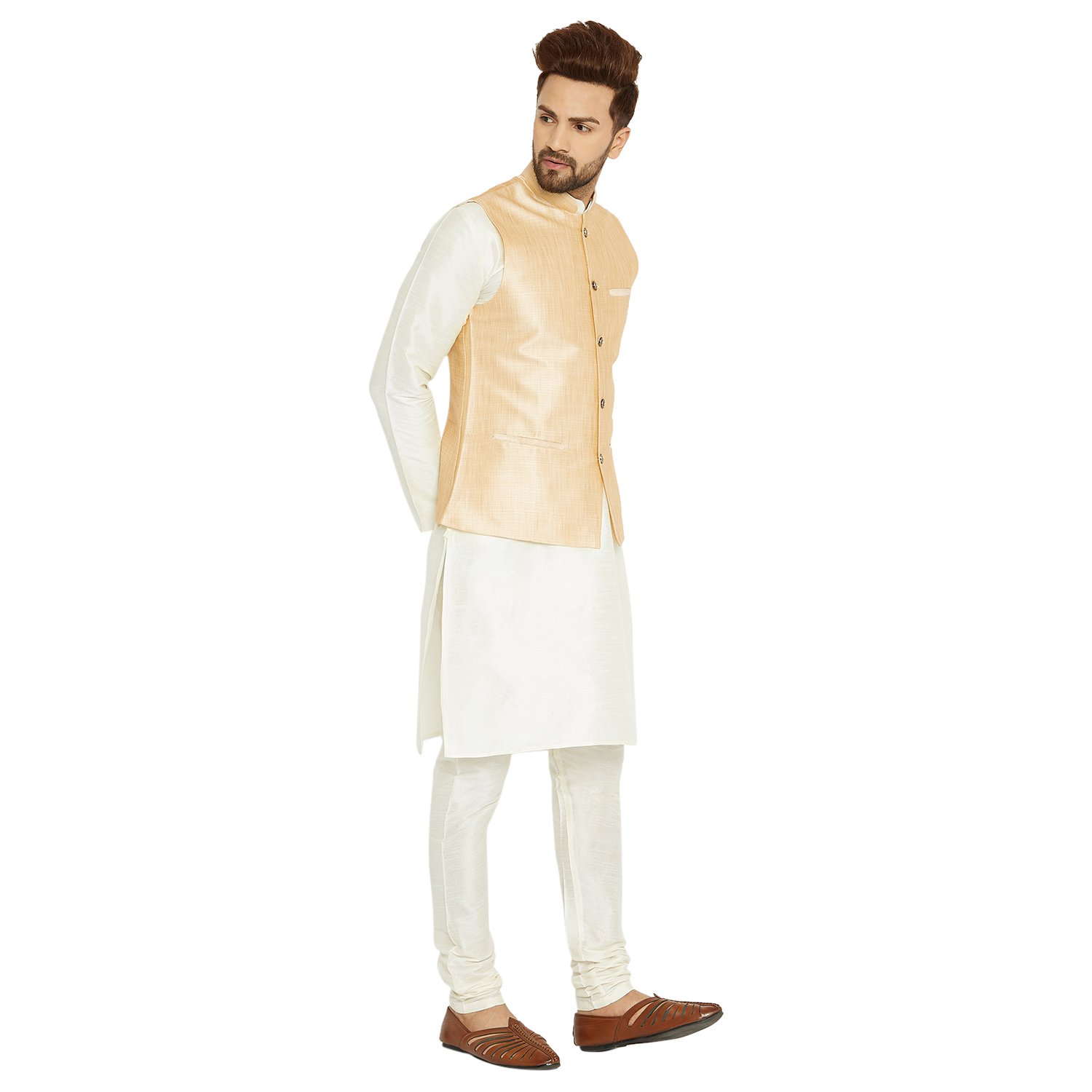 SOJANYA as a brand brings you quality and affordability. In market since 1958, we take pride in our commitment to maintain quality standards in each piece manufactured by us. A true epitome of class, this kurta Pyjama and Nehru Jacket Combo will surely reflect your impeccable taste in fashion. Made from banarsi dupion silk fabric, this set will surely make you the cynosure of all eyes. Team this Kurta Pyjama Nehru jacket set with a pair of mojris or kolhapuri chappals to give a classy touch to your ethnic look. The Kurta Pyjama is made of Cream Color Dupion Silk fabric. Nehru Jacket is made up of Gold Color Dupion Silk. |
