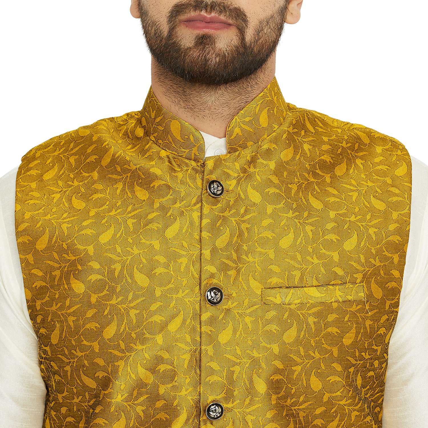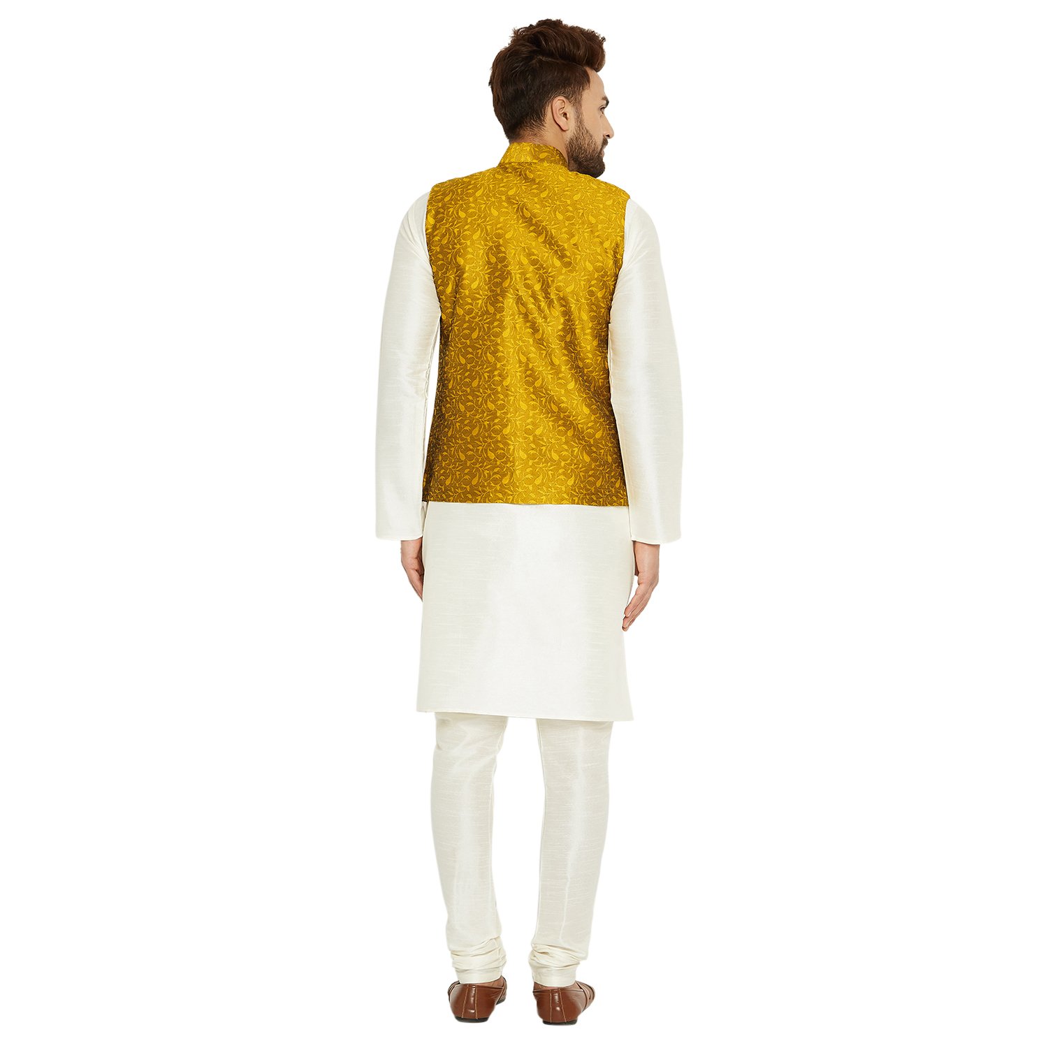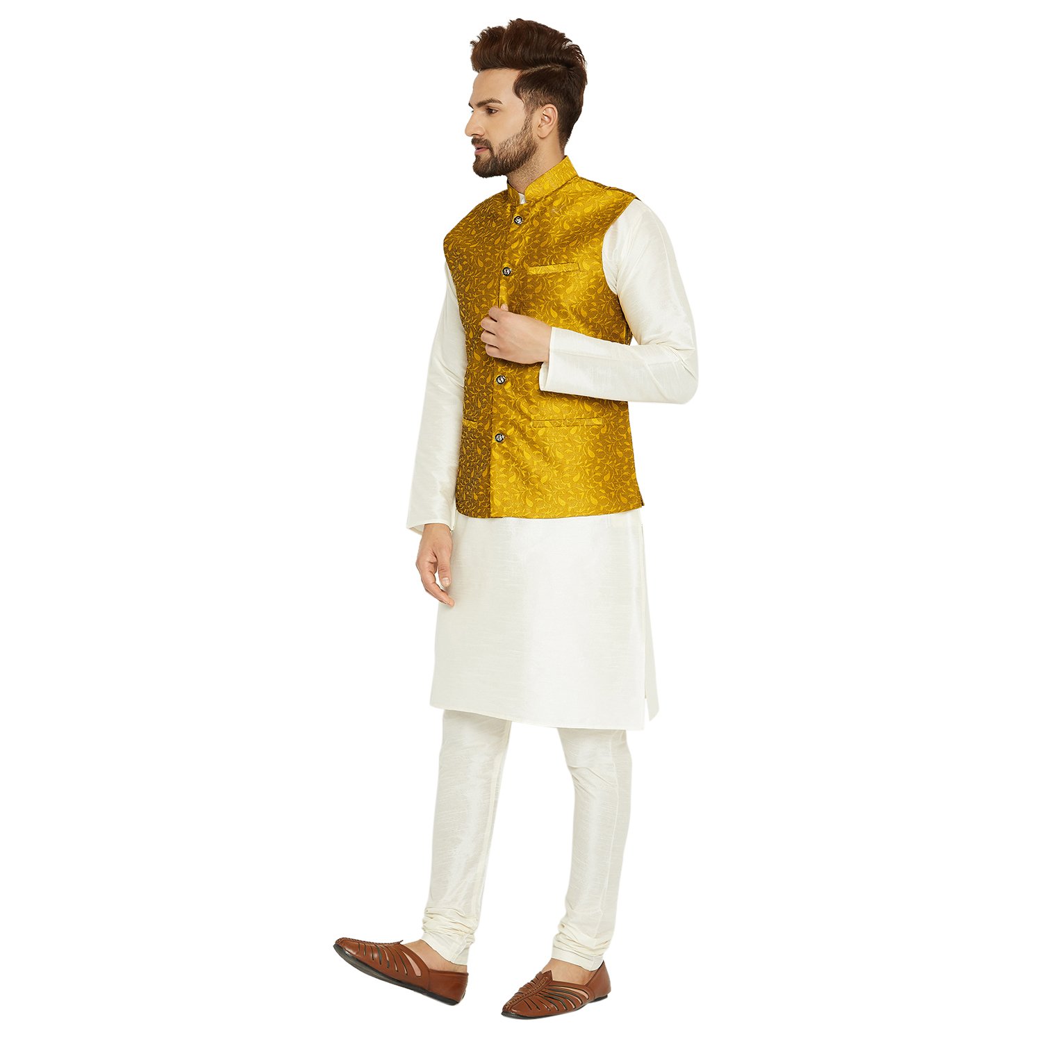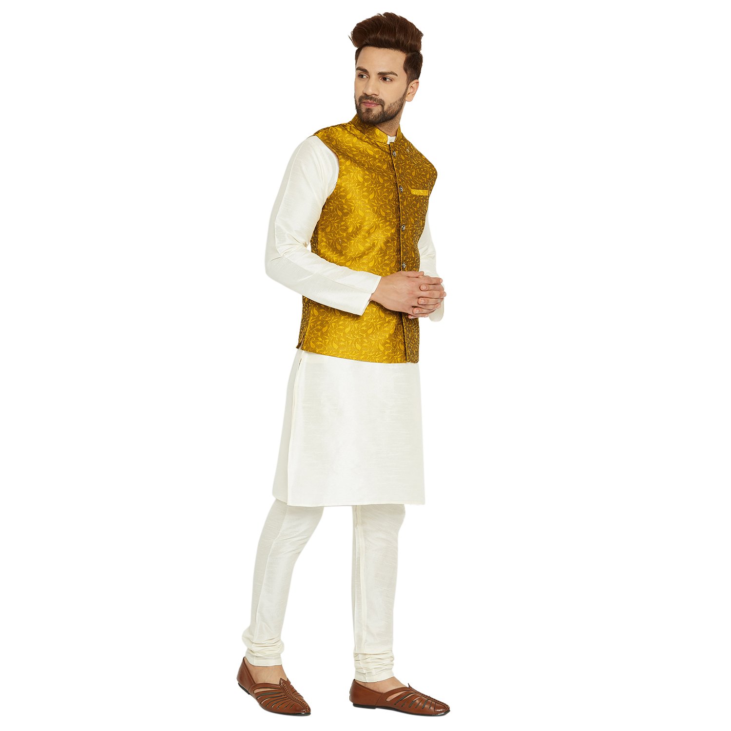 SOJANYA as a brand brings you quality and affordability. In market since 1958, we take pride in our commitment to maintain quality standards in each piece manufactured by us. A true epitome of class, this kurta Pyjama and designer Nehru Jacket Combo will surely reflect your impeccable taste in fashion. Made from banarsi dupion silk fabric, this set will surely make you the cynosure of all eyes. Team this Kurta Pyjama Nehru jacket set with a pair of mojris or kolhapuri chappals to give a classy touch to your ethnic look. The Kurta Pyjama is made of Cream Color Dupion Silk fabric. Nehru Jacket is made up of Mustard Color Dupion Silk. |
