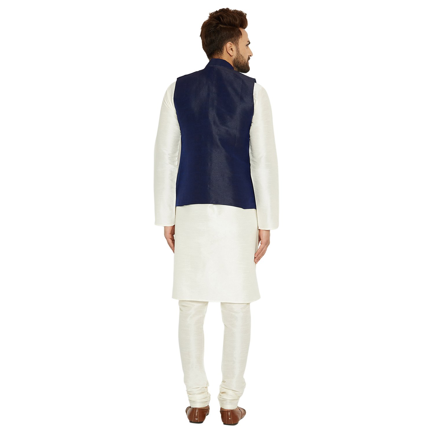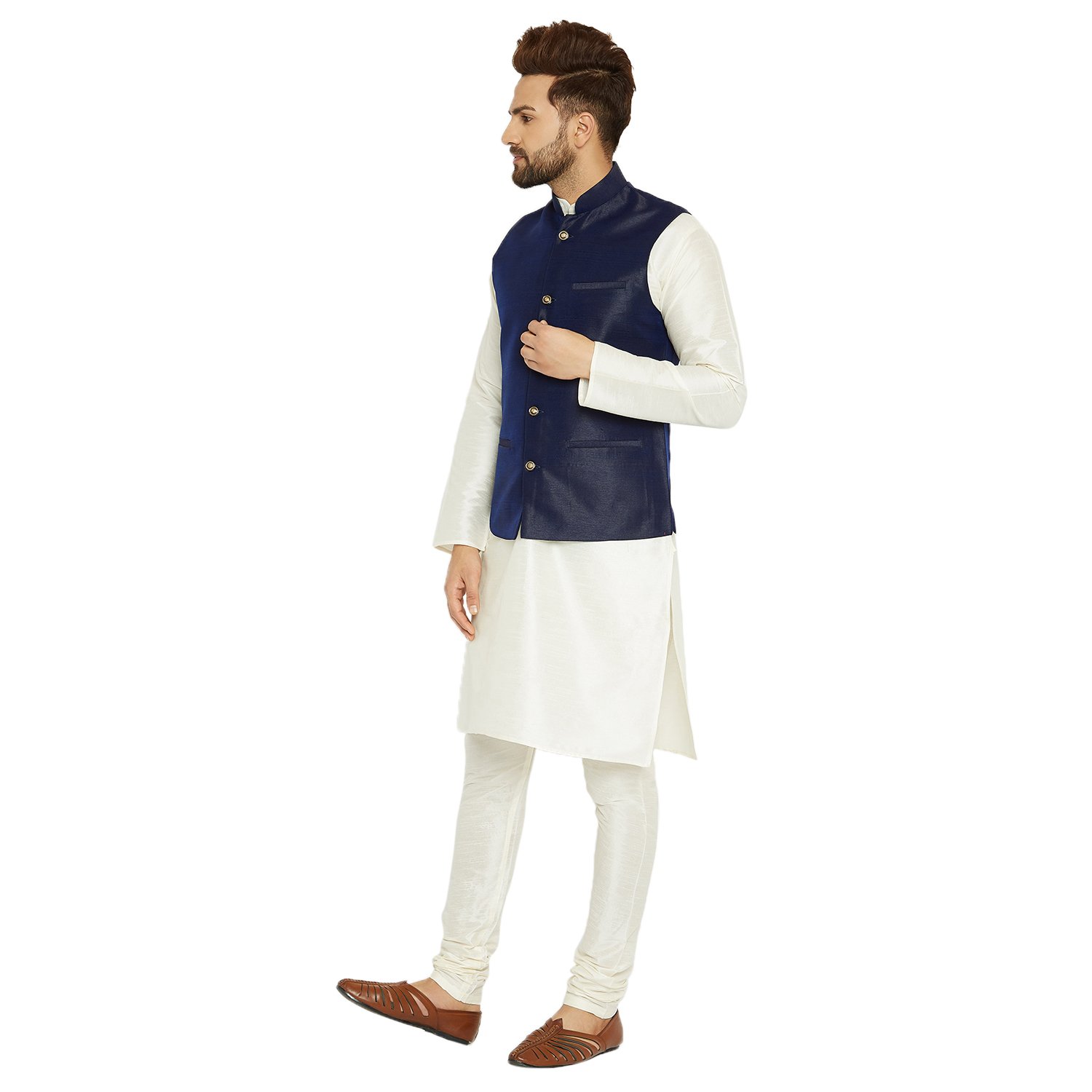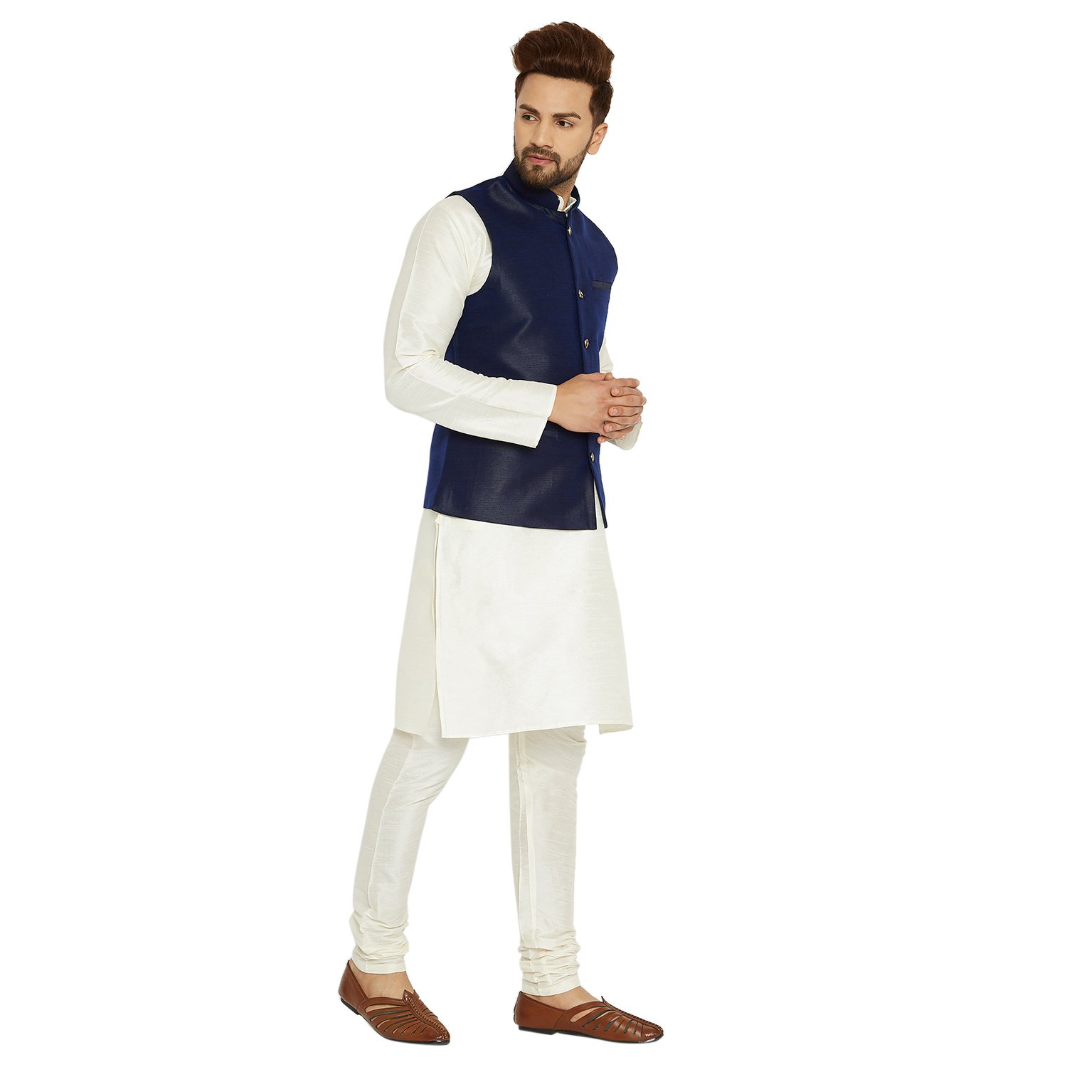 SOJANYA as a brand brings you quality and affordability. In market since 1958, we take pride in our commitment to maintain quality standards in each piece manufactured by us. A true epitome of class, this kurta Pyjama and Nehru Jacket Combo will surely reflect your impeccable taste in fashion. Made from banarsi dupion silk fabric, this set will surely make you the cynosure of all eyes. Team this Kurta Pyjama Nehru jacket set with a pair of mojris or kolhapuri chappals to give a classy touch to your ethnic look. The Kurta Pyjama is made of Cream Color Dupion Silk fabric. Nehru Jacket is made up of Navy Blue Color Dupion Silk. |