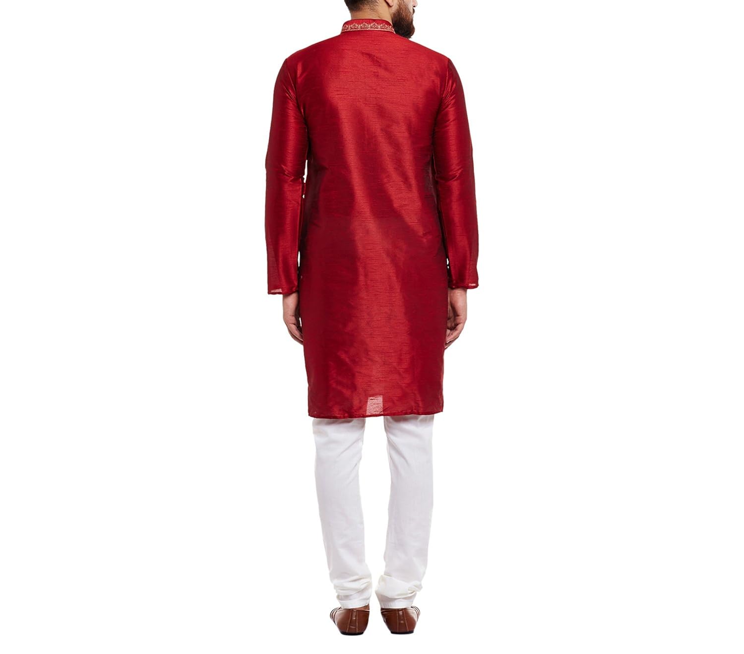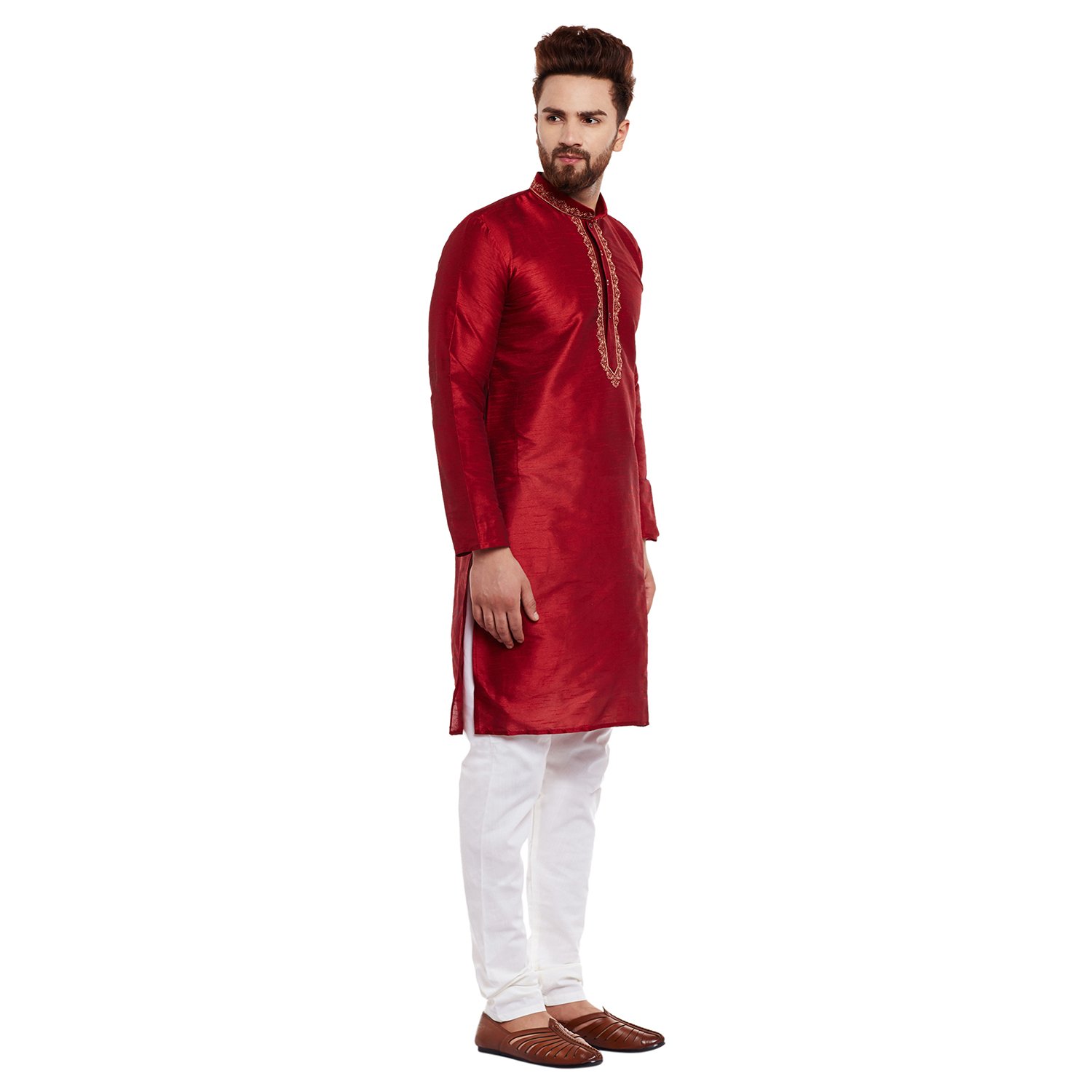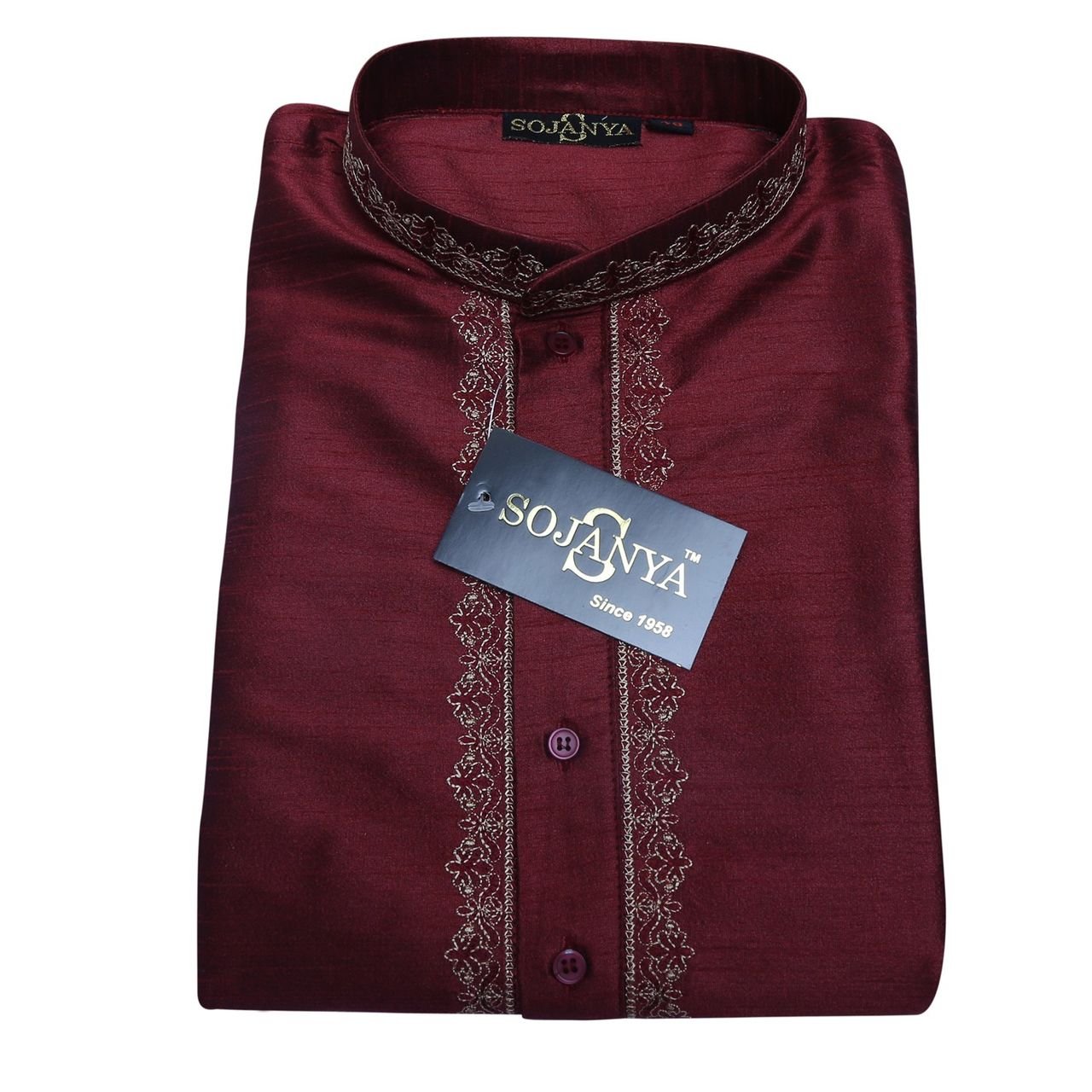 SOJANYA as a brand brings you quality and affordability. In market since 1958, we take pride in our commitment to maintain quality standards in each piece manufactured by us. Look your ethnic best wearing this kurta and White pyjama . Made of Banarsi Dupion Silk, this regular-fit kurta pyjama set comprises a full-sleeved kurta with embroidery on neck and pyjama. Team this outifit with embroidered mojris and look apart on special occasions. |
