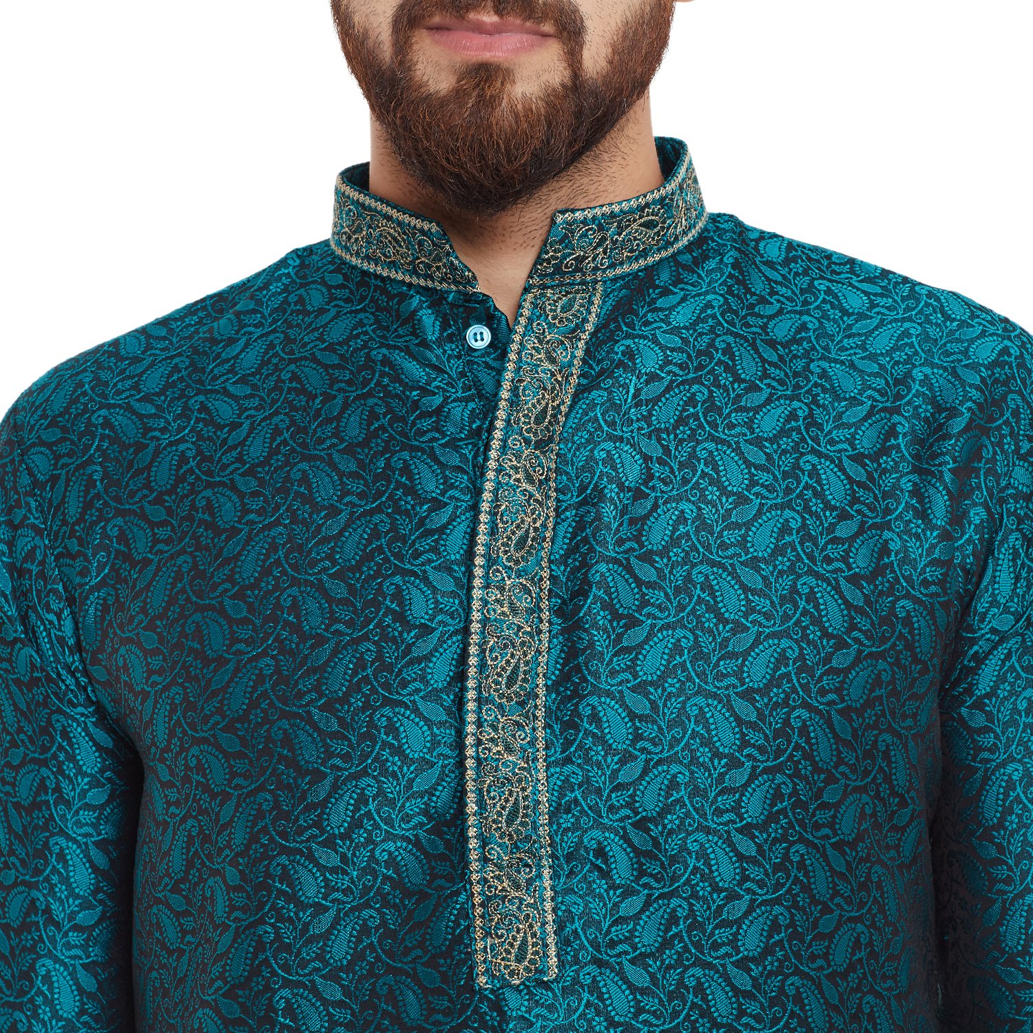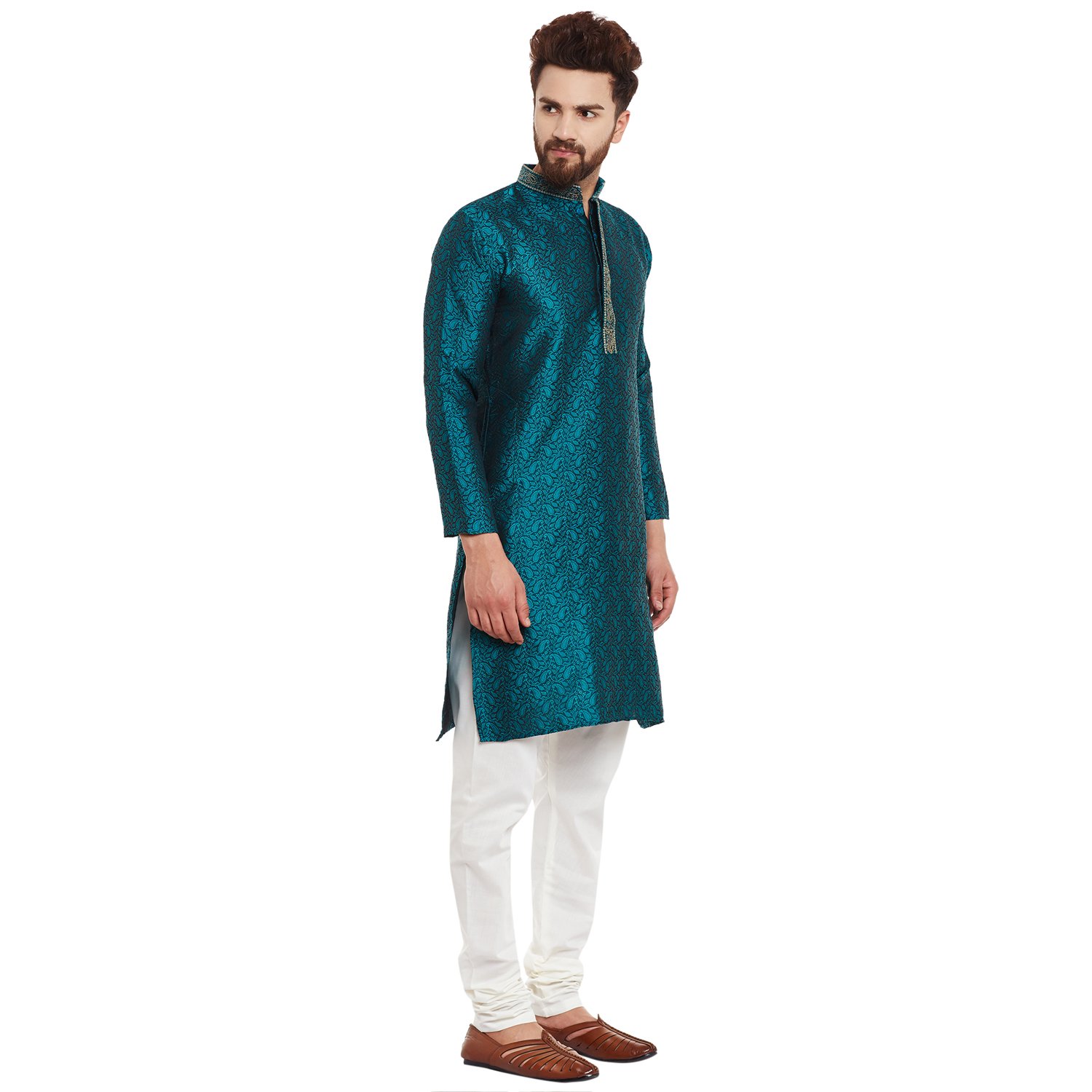 SOJANYA as a brand brings you quality and affordability. In market since 1958, we take pride in our commitment to maintain quality standards in each piece manufactured by us. Look your ethnic best wearing this Emerald Green kurta and White pyjama . Made of Jacquard silk, this regular-fit kurta pyjama set comprises a full-sleeved kurta with self design & embroidery on neck and a pajama. Team this outifit with mojris and look apart on special occasions. |