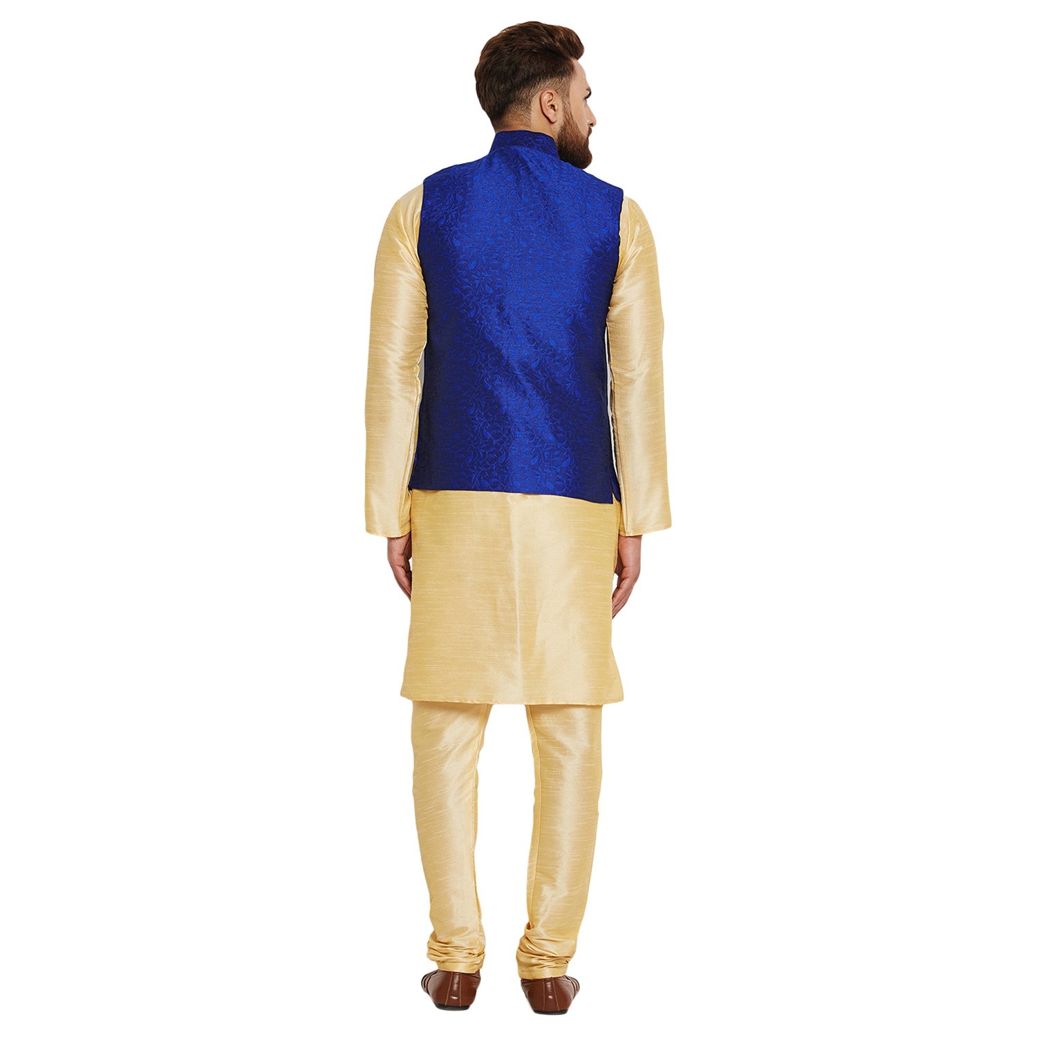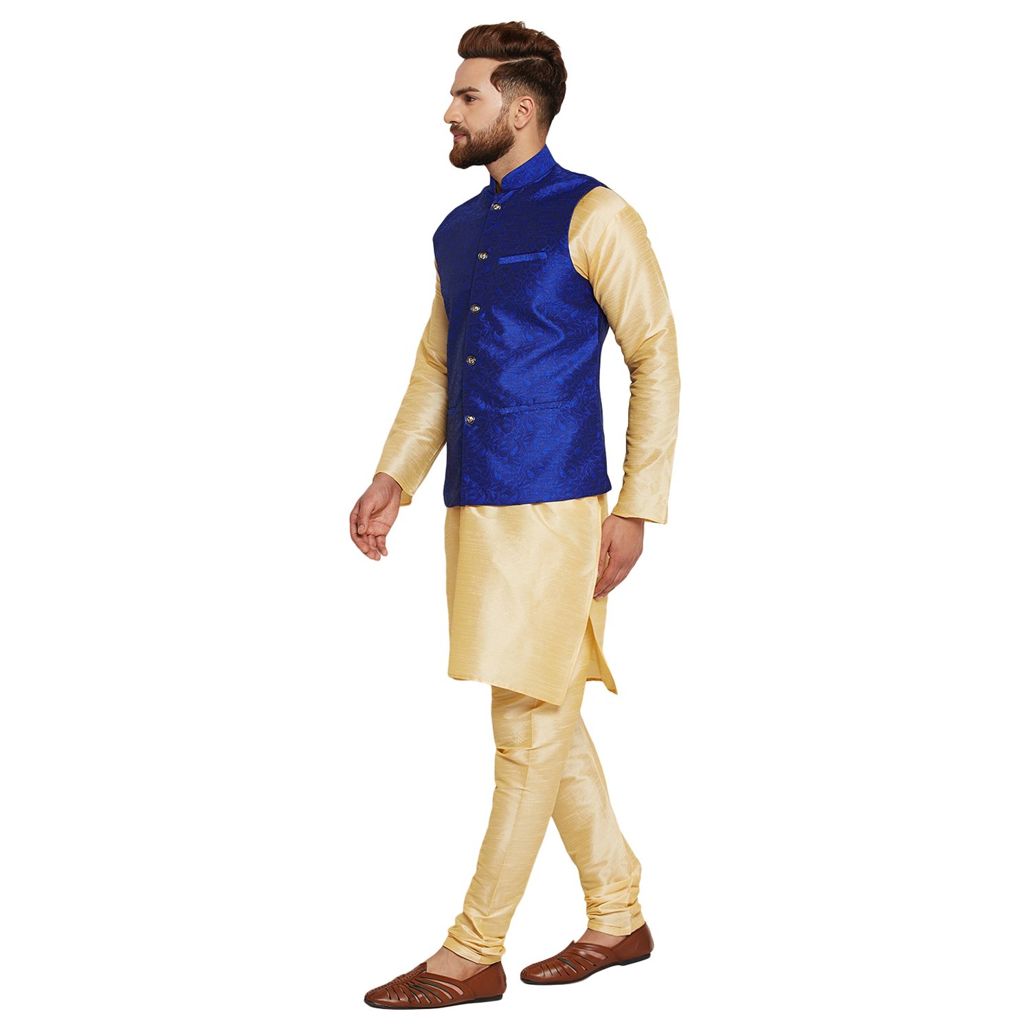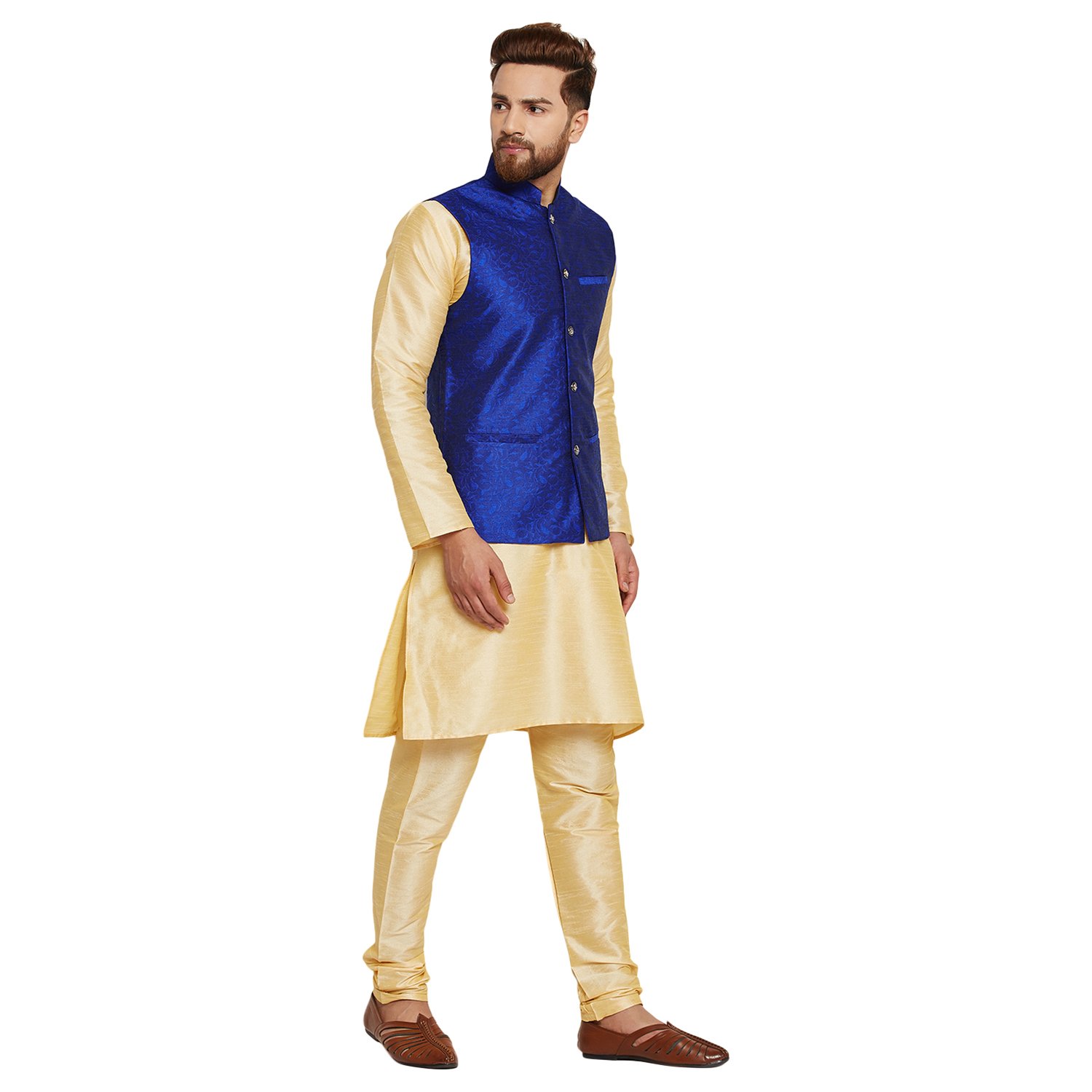 SOJANYA as a brand brings you quality and affordability. In market since 1958, we take pride in our commitment to maintain quality standards in each piece manufactured by us. A true epitome of class, this kurta Pyjama and Nehru Jacket Combo will surely reflect your impeccable taste in fashion. Made from banarsi dupion silk fabric, this set will surely make you the cynosure of all eyes. Team this Kurta Pyjama Nehru jacket set with a pair of mojris or kolhapuri chappals to give a classy touch to your ethnic look. The Kurta Pyjama is made of Gold Color Dupion Silk fabric and With Blue Color Jacquard Nehru Jacket Set. |