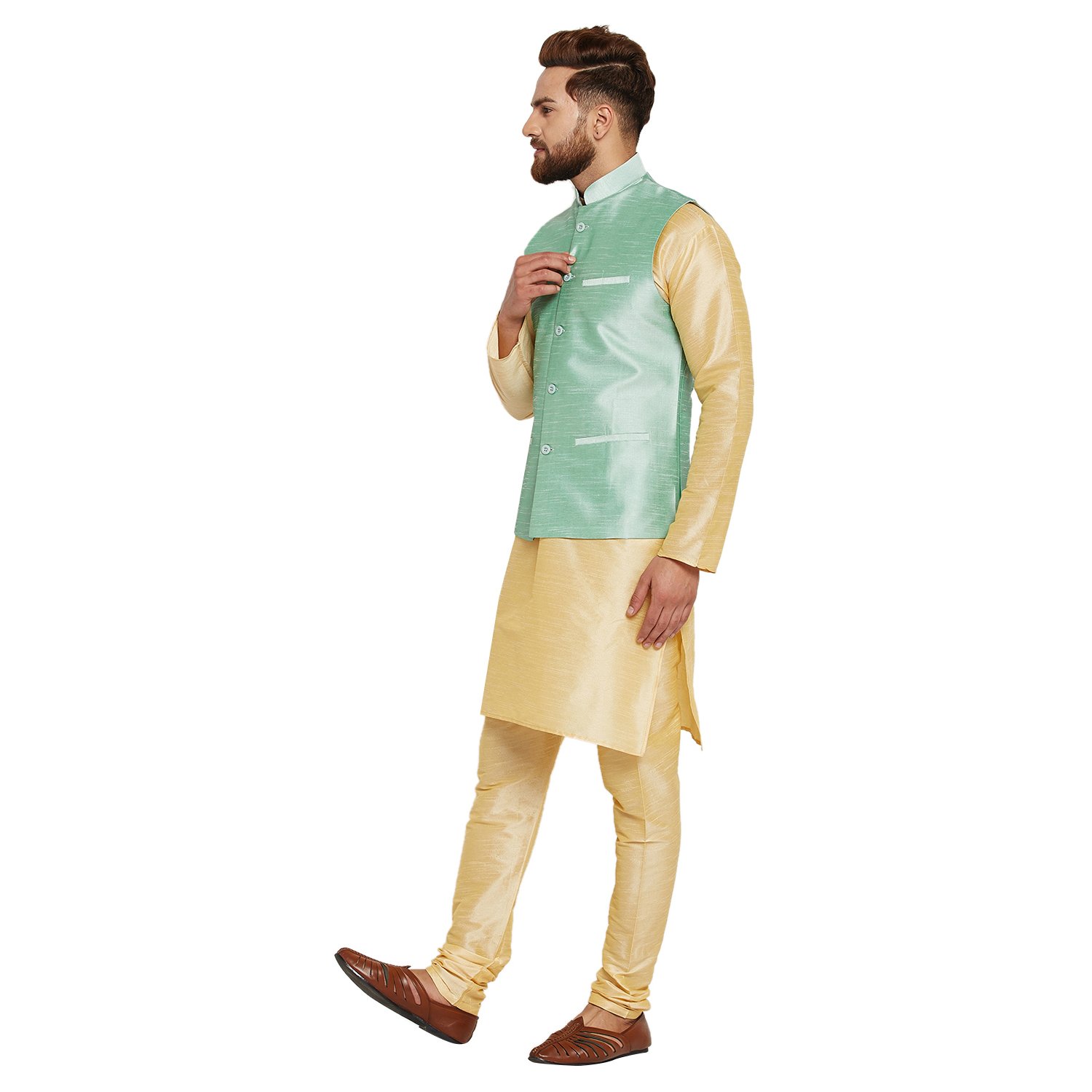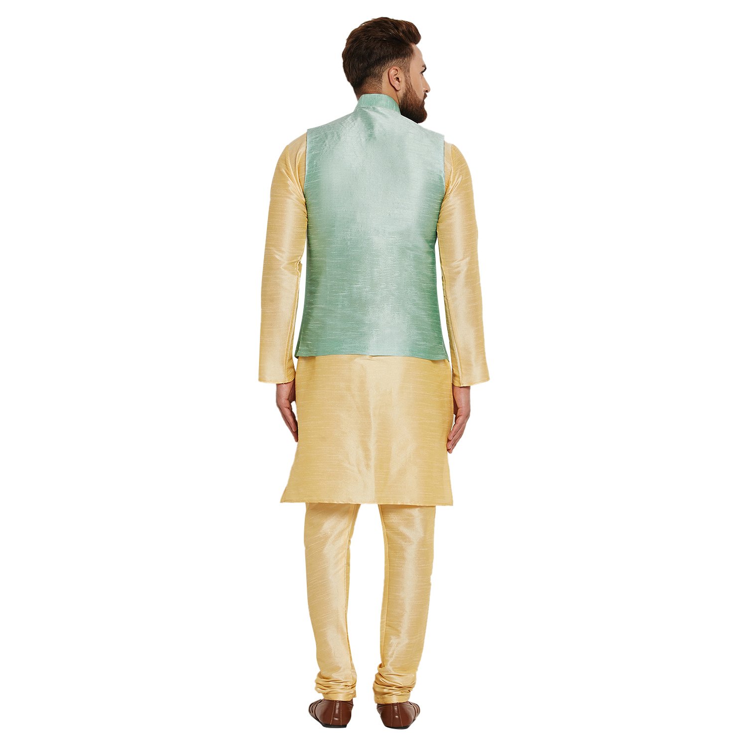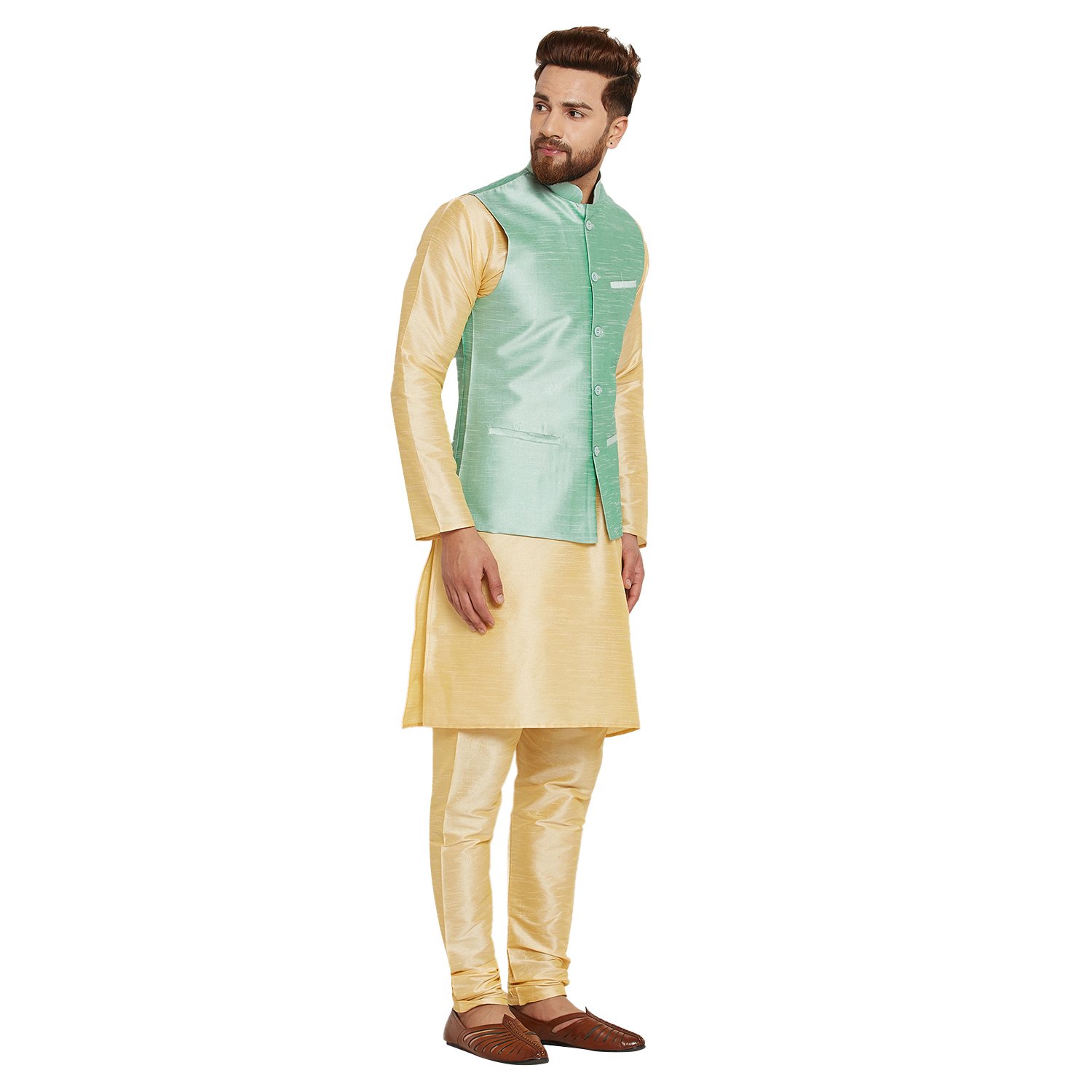 SOJANYA as a brand brings you quality and affordability. In market since 1958, we take pride in our commitment to maintain quality standards in each piece manufactured by us. A true epitome of class, this kurta Pyjama and Nehru Jacket Combo will surely reflect your impeccable taste in fashion. Made from banarsi dupion silk fabric, this set will surely make you the cynosure of all eyes. Team this Kurta Pyjama Nehru jacket set with a pair of mojris or kolhapuri chappals to give a classy touch to your ethnic look. The Kurta Pyjama is made of Gold Color Dupion Silk fabric and With Blue Color Dupion Silk Nehru Jacket Set. |