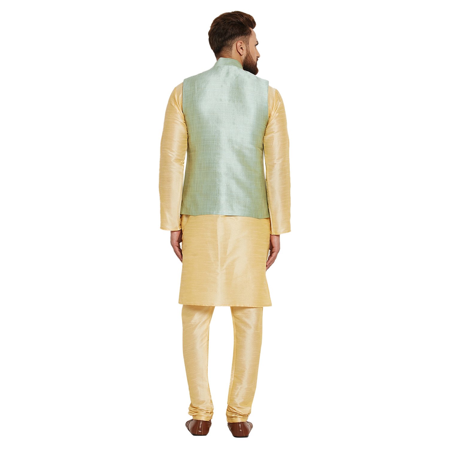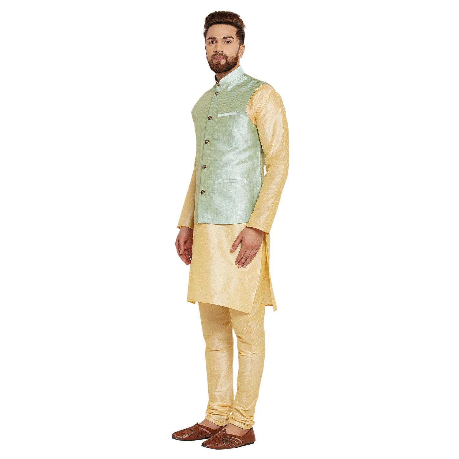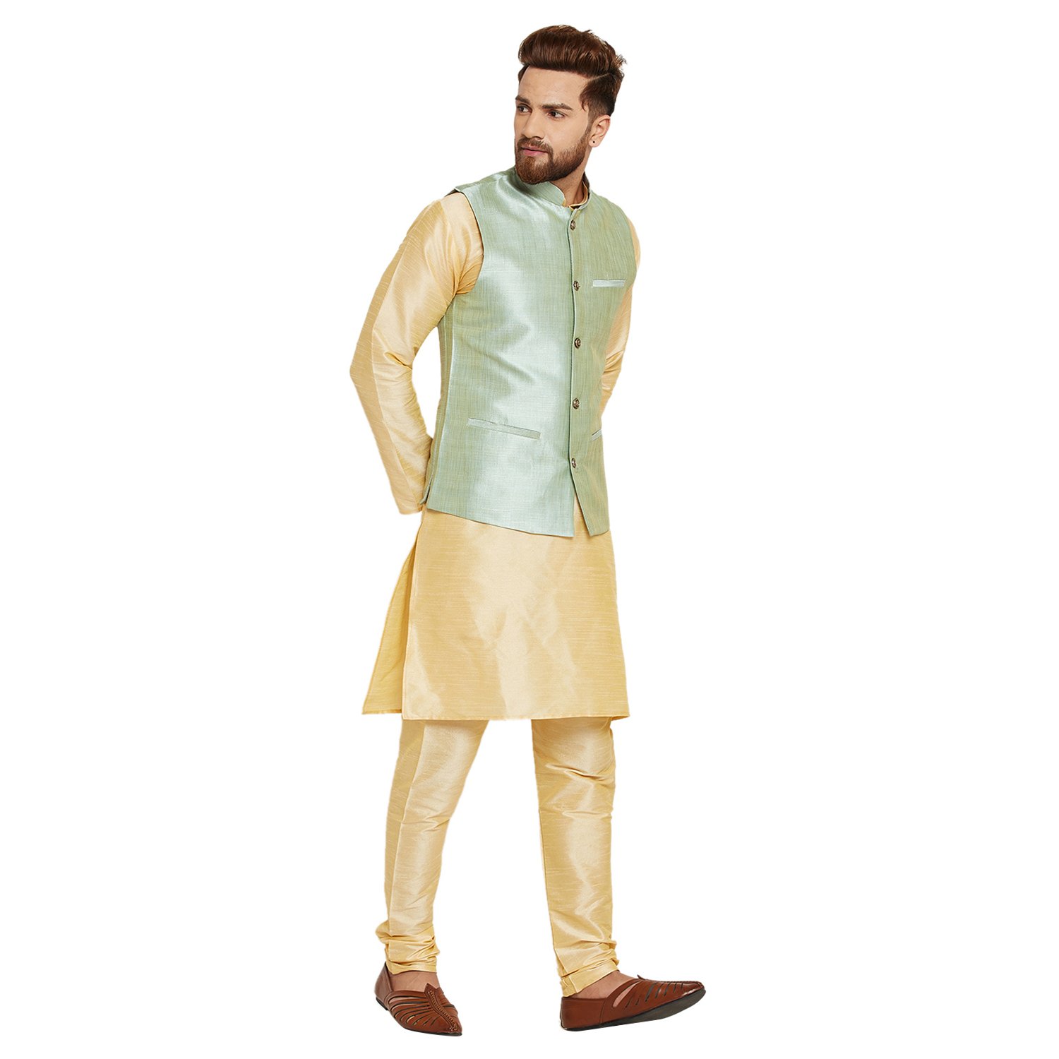 SOJANYA as a brand brings you quality and affordability. In market since 1958, we take pride in our commitment to maintain quality standards in each piece manufactured by us. A true epitome of class, this kurta Pyjama and Nehru Jacket Combo will surely reflect your impeccable taste in fashion. Made from banarsi dupion silk fabric, this set will surely make you the cynosure of all eyes. Team this Kurta Pyjama Nehru jacket set with a pair of mojris or kolhapuri chappals to give a classy touch to your ethnic look. The Kurta Pyjama is made of Gold Color Dupion Silk fabric and With Green Color Dupion Silk Nehru Jacket Set. |