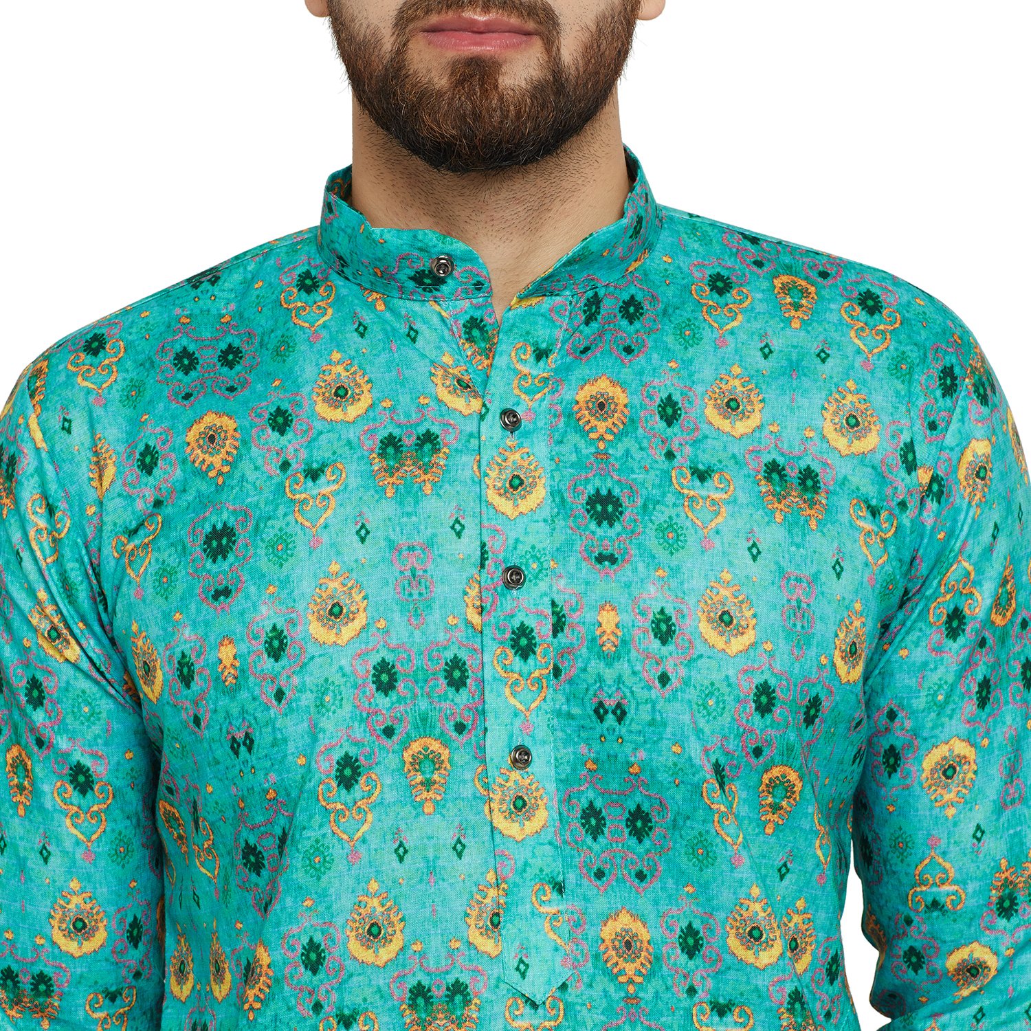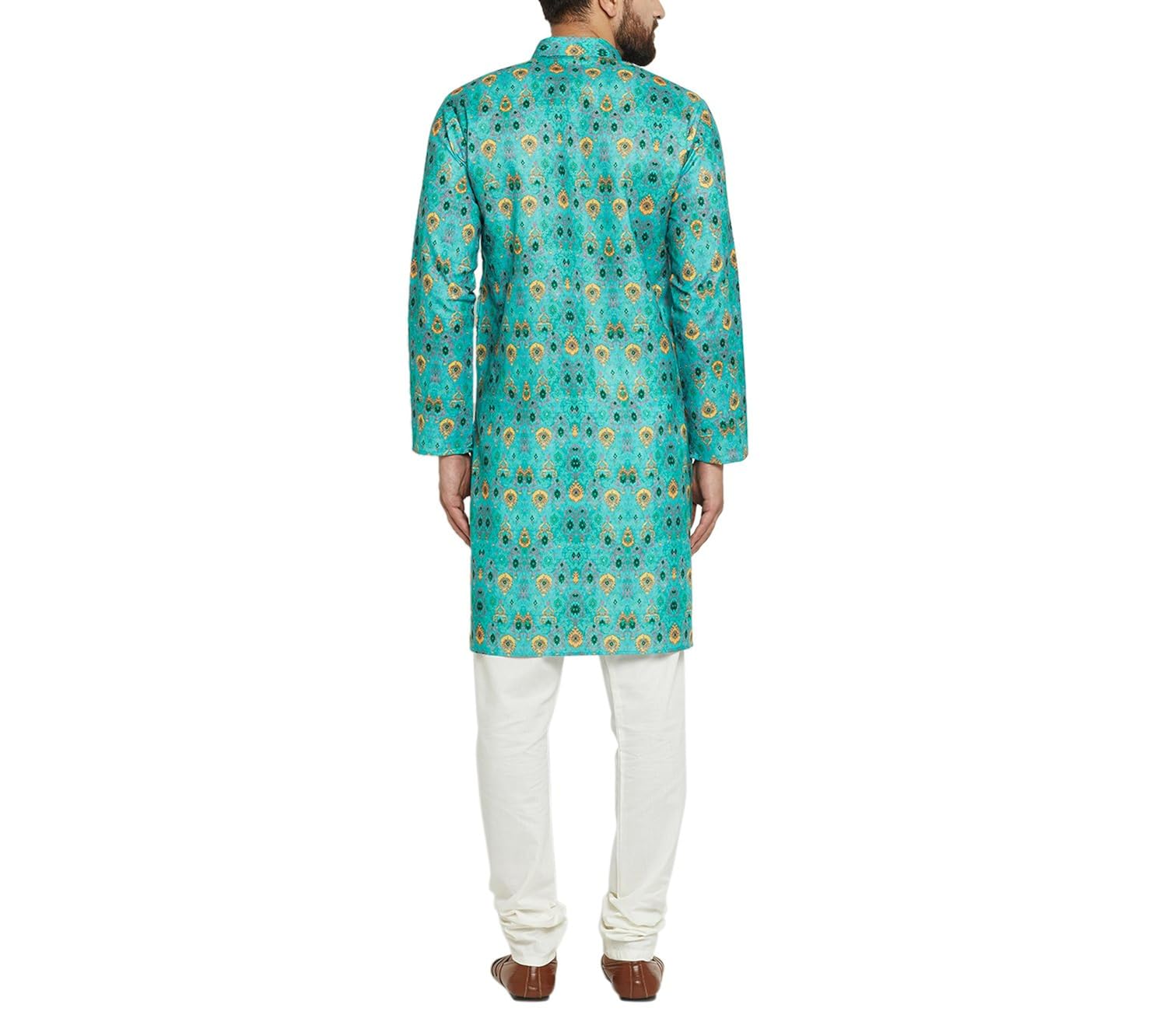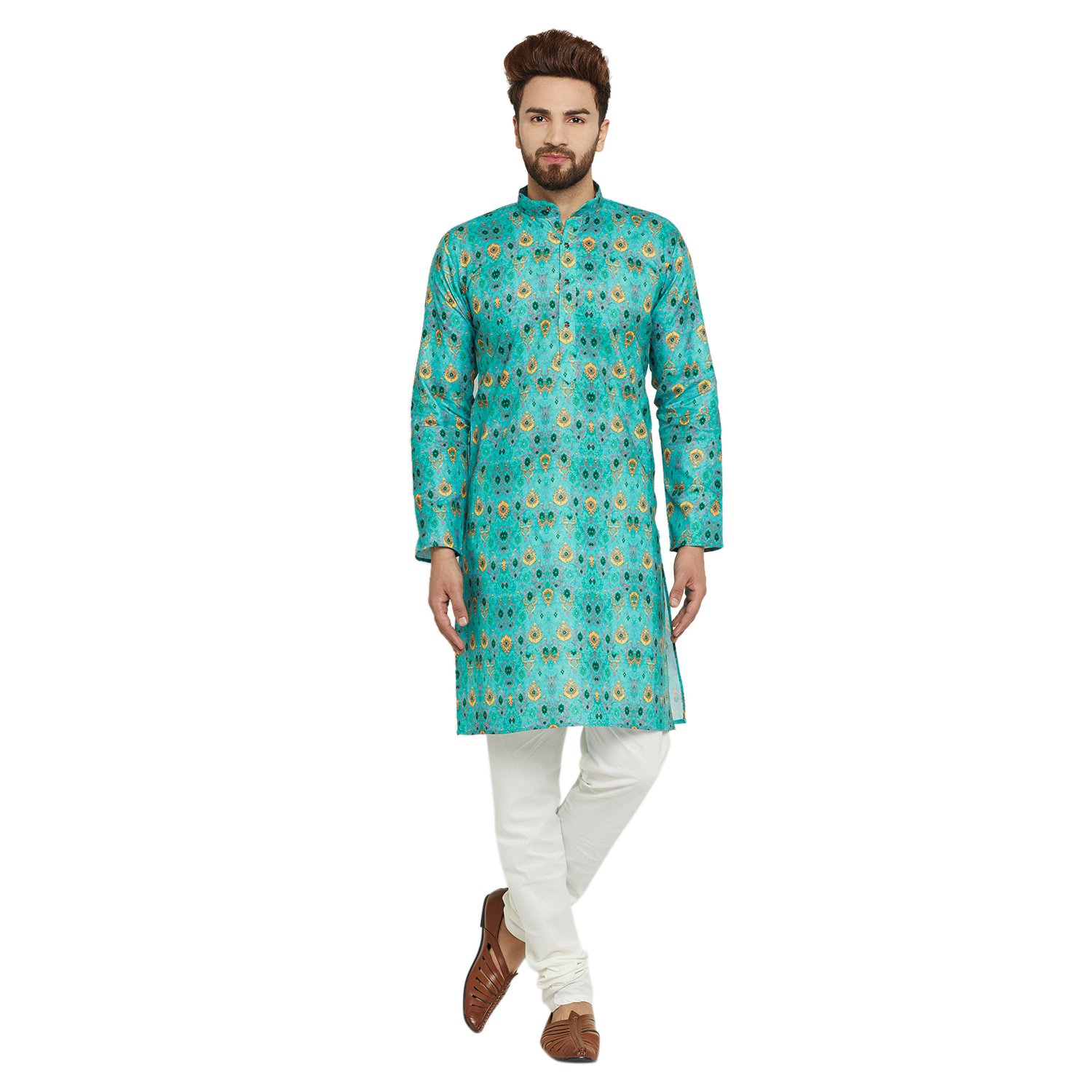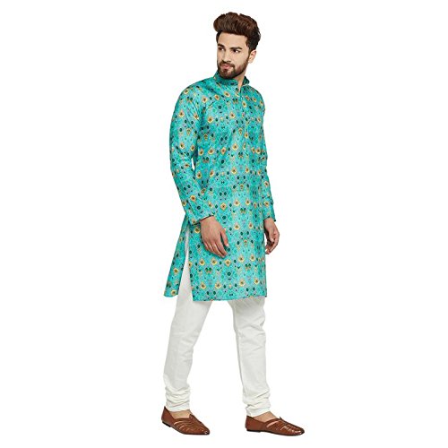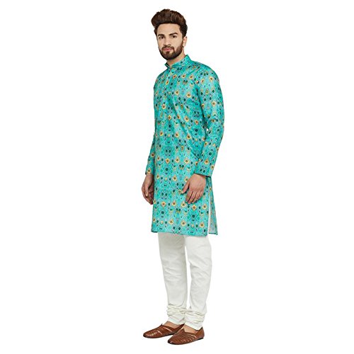 SOJANYA as a brand brings you quality and affordability. In market since 1958, we take pride in our commitment to maintain quality standards in each piece manufactured by us. Look your ethnic best wearing this Green colored Kurta Pyjama set. Made of cotton, this regular-fit kurta pyjama set comprises a full-sleeved Green colored kurta with smart digital print on it and Off-White churidaar pyjama. Team this outifit with mojris and look apart on special occasions. |