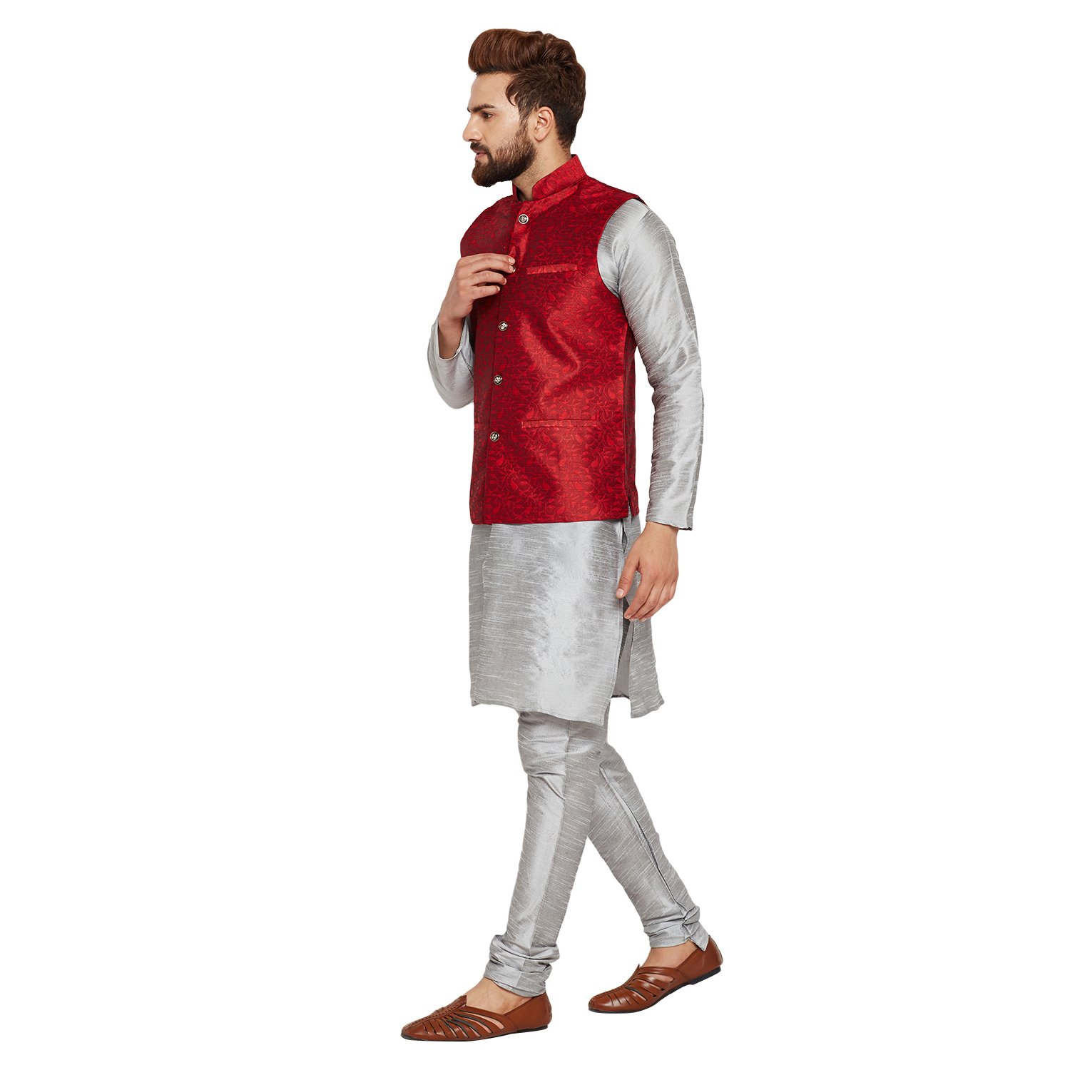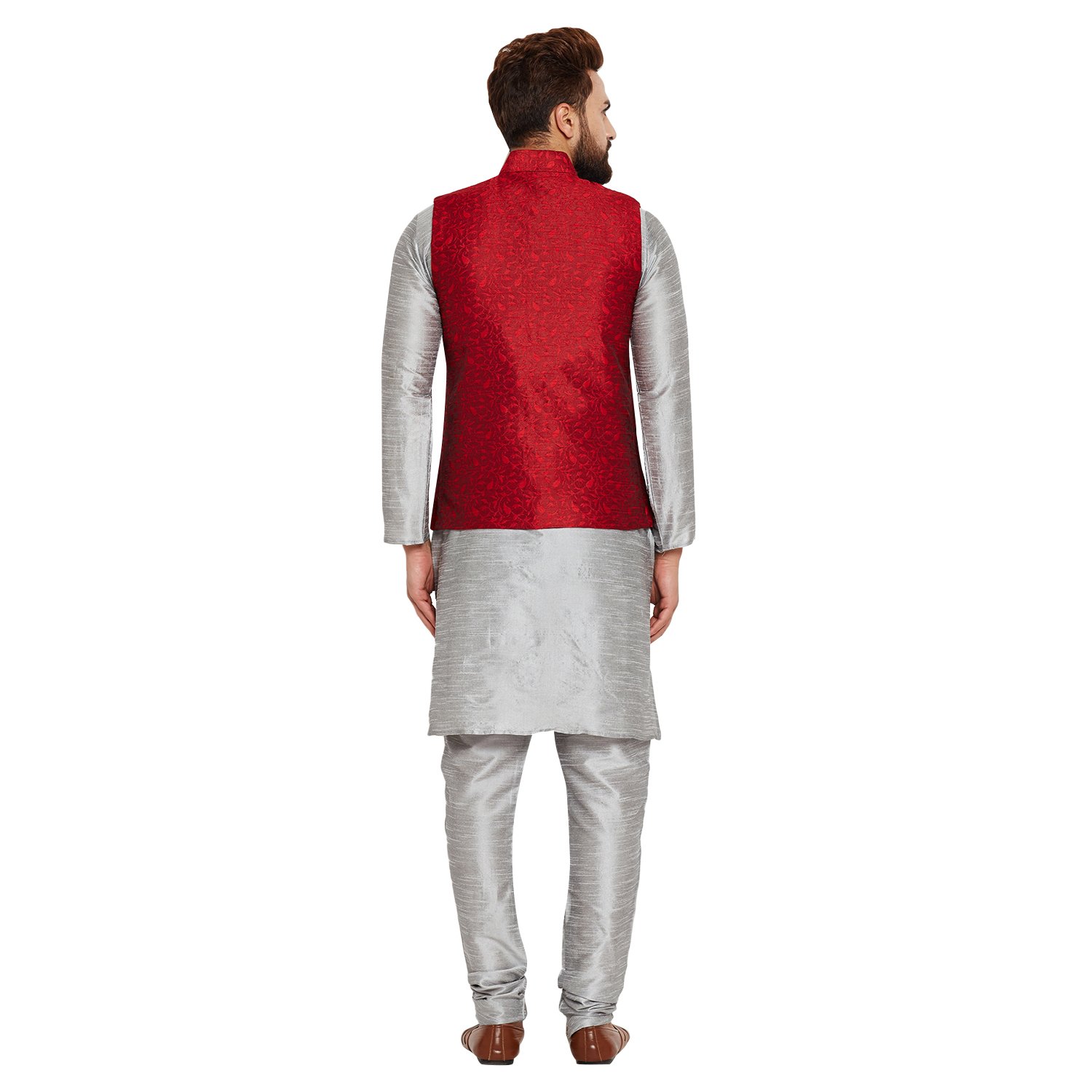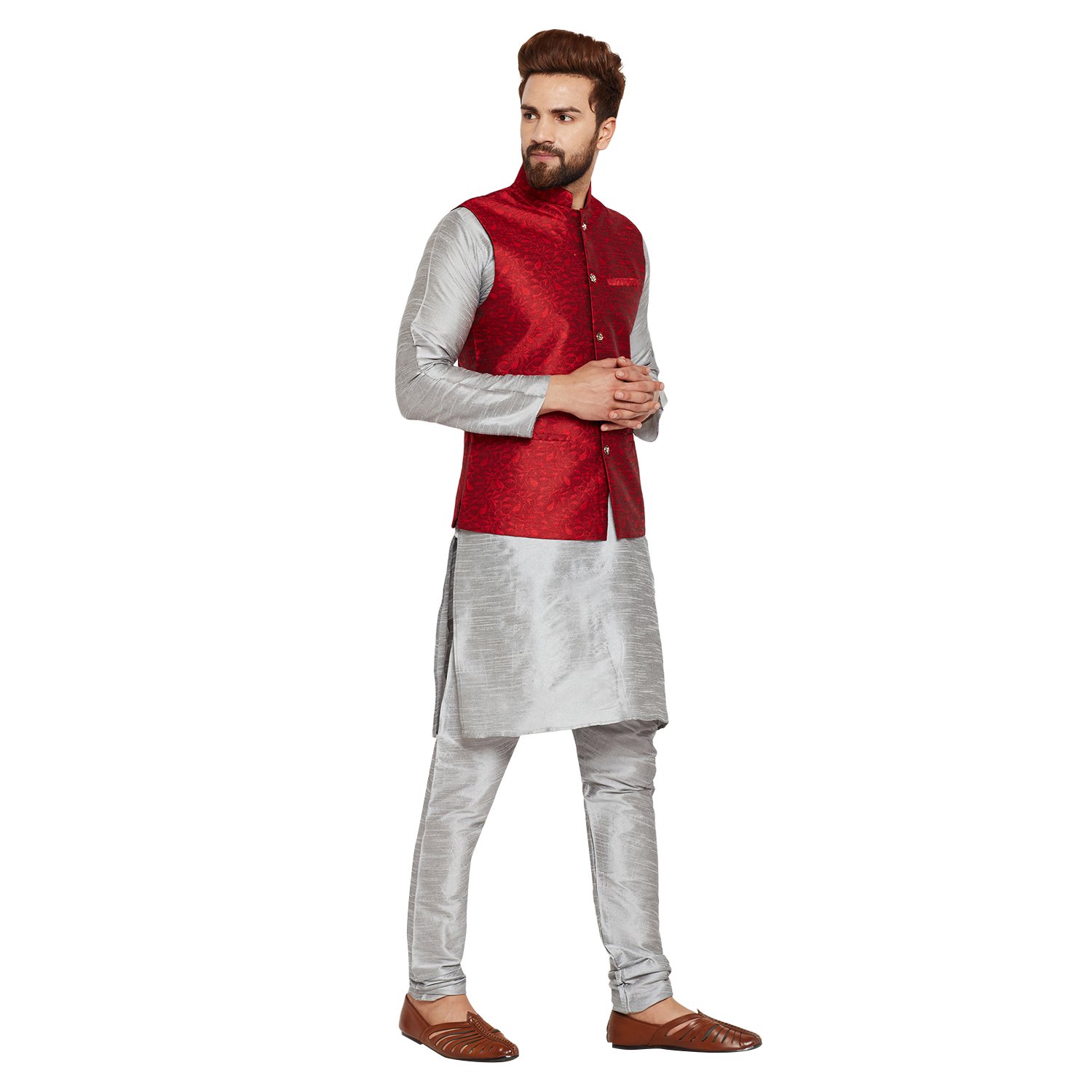 SOJANYA as a brand brings you quality and affordability. In market since 1958, we take pride in our commitment to maintain quality standards in each piece manufactured by us. A true epitome of class, this kurta Pyjama and Nehru Jacket Combo will surely reflect your impeccable taste in fashion. Made from banarsi dupion silk fabric, this set will surely make you the cynosure of all eyes. Team this Kurta Pyjama Nehru jacket set with a pair of mojris or kolhapuri chappals to give a classy touch to your ethnic look. The Kurta Pyjama is made of Grey Color Dupion Silk fabric and With Maroon Color Jacquard Nehru Jacket Set. |