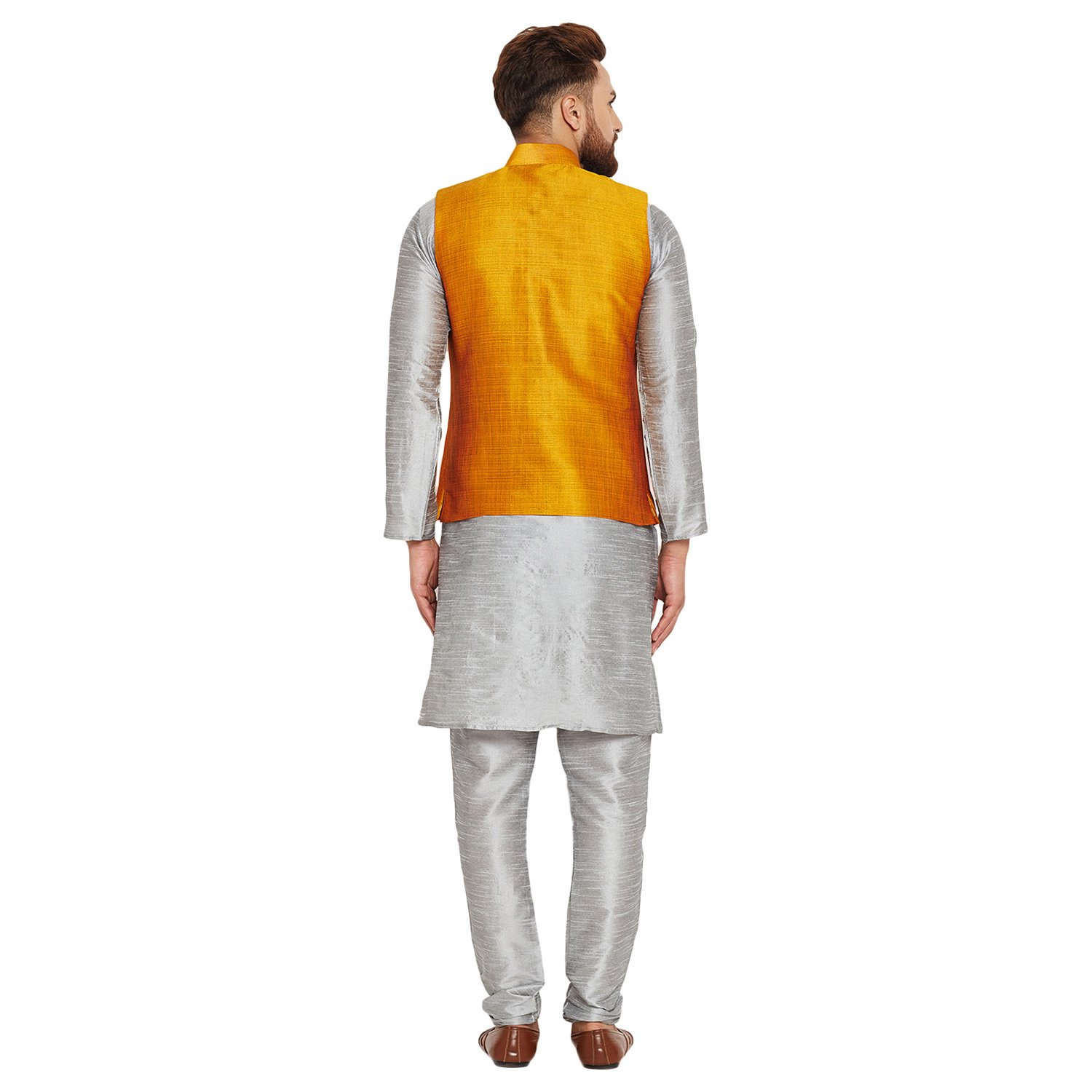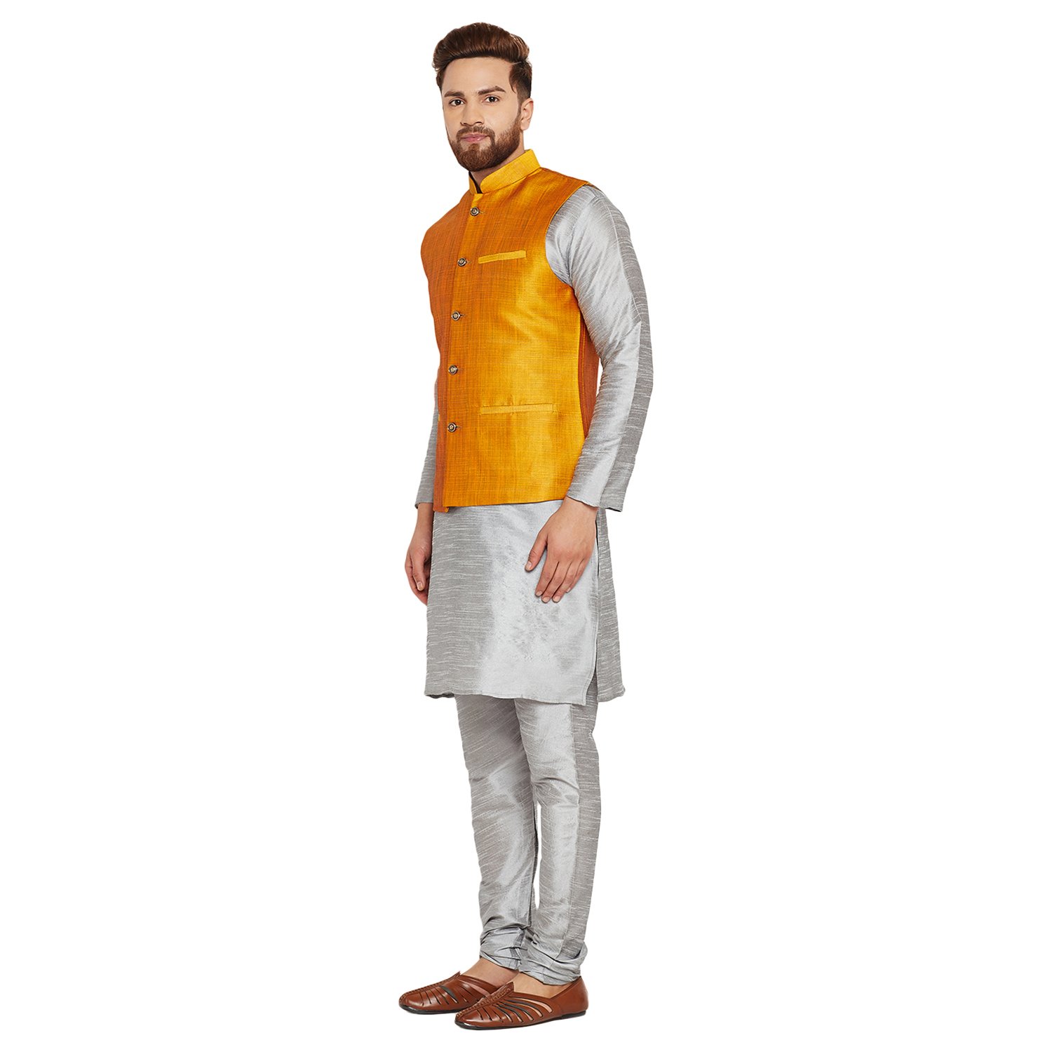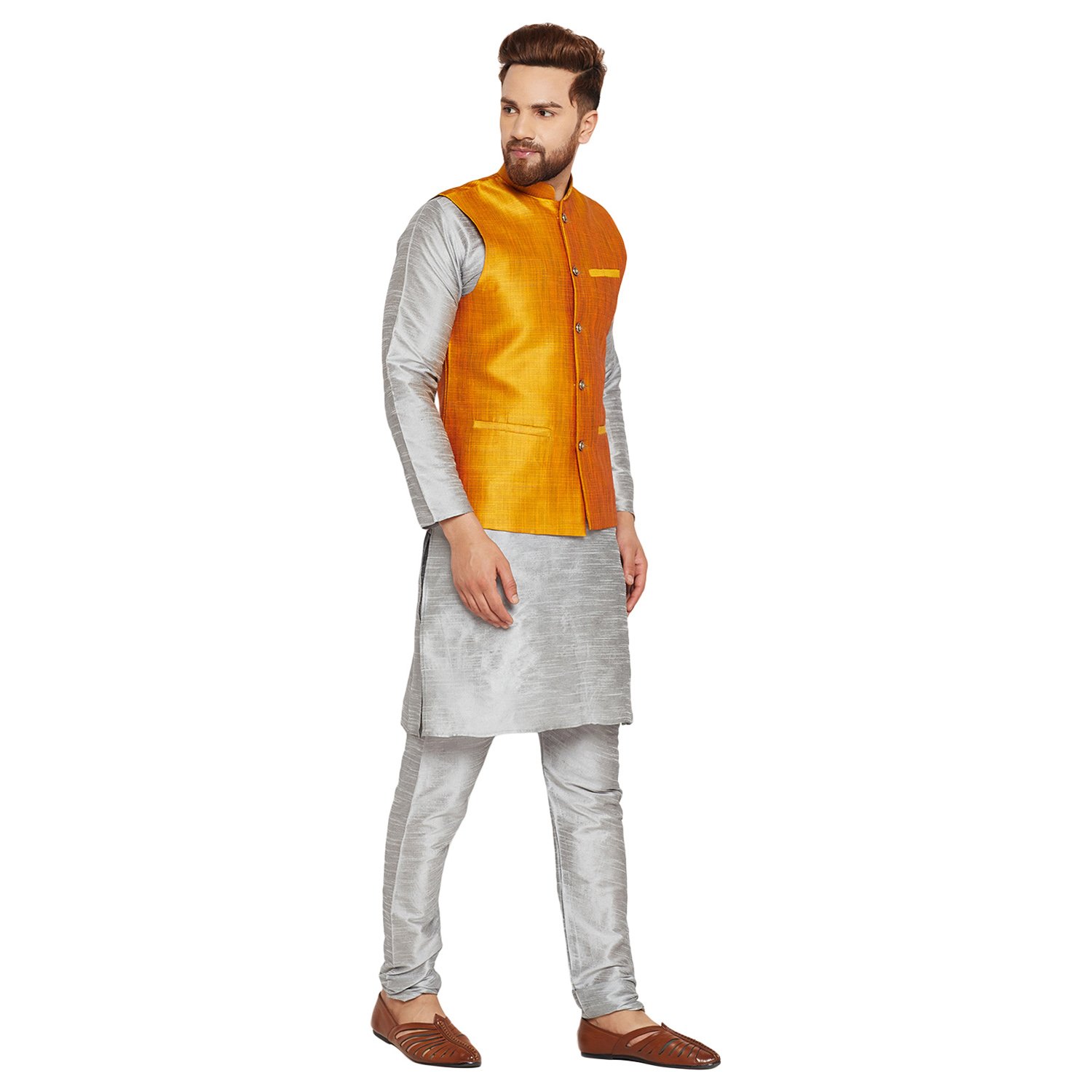 SOJANYA as a brand brings you quality and affordability. In market since 1958, we take pride in our commitment to maintain quality standards in each piece manufactured by us. A true epitome of class, this kurta Pyjama and Nehru Jacket Combo will surely reflect your impeccable taste in fashion. Made from banarsi dupion silk fabric, this set will surely make you the cynosure of all eyes. Team this Kurta Pyjama Nehru jacket set with a pair of mojris or kolhapuri chappals to give a classy touch to your ethnic look. The Kurta Pyjama is made of Grey Color Dupion Silk fabric and With Mustard Color Dupion Silk Nehru Jacket Set. |