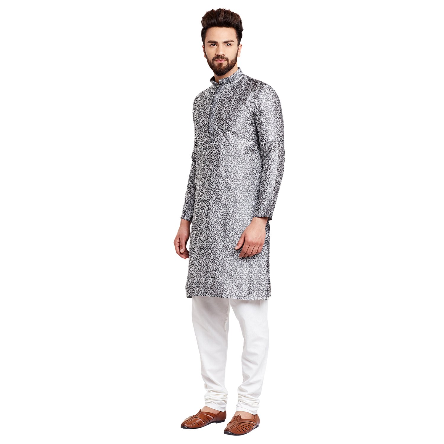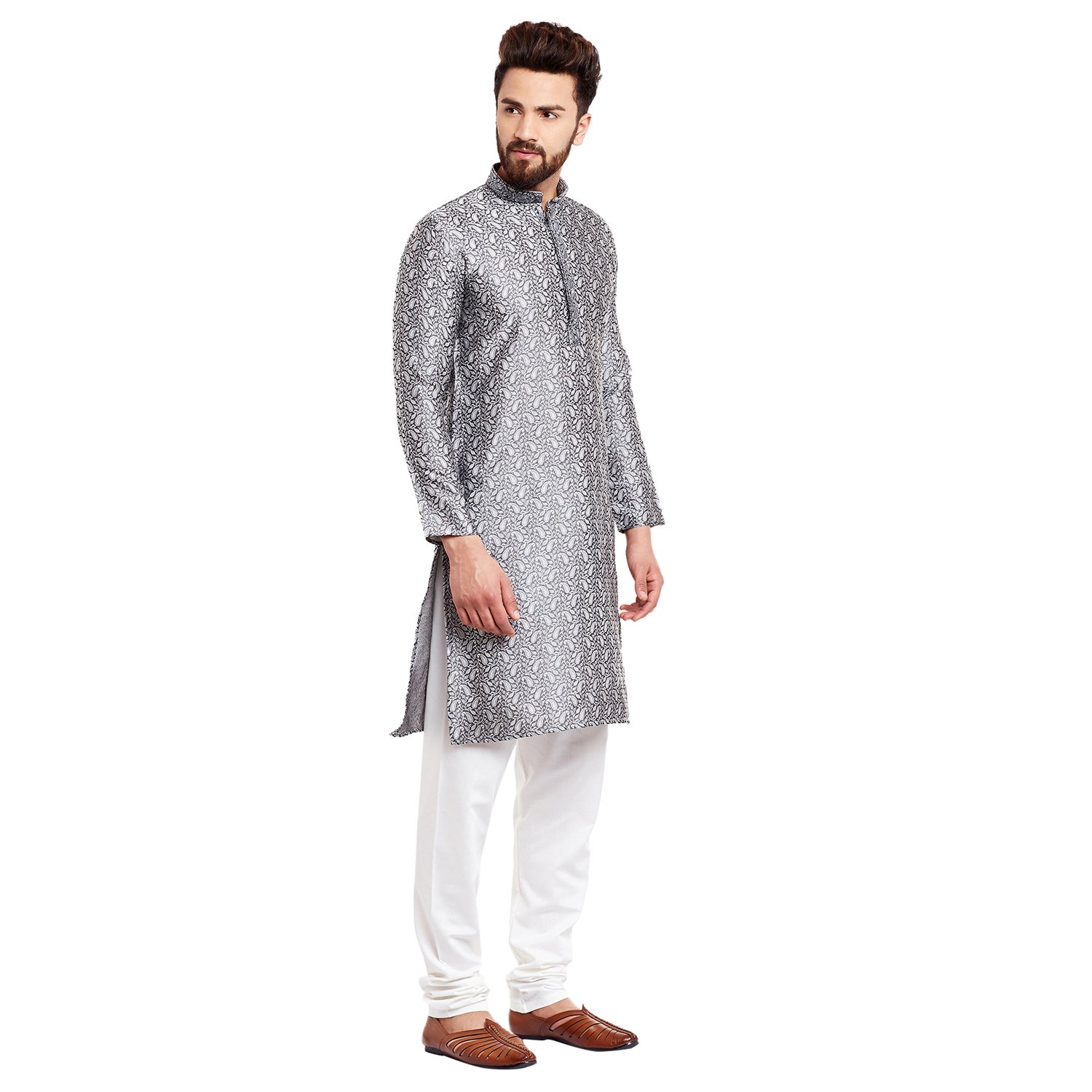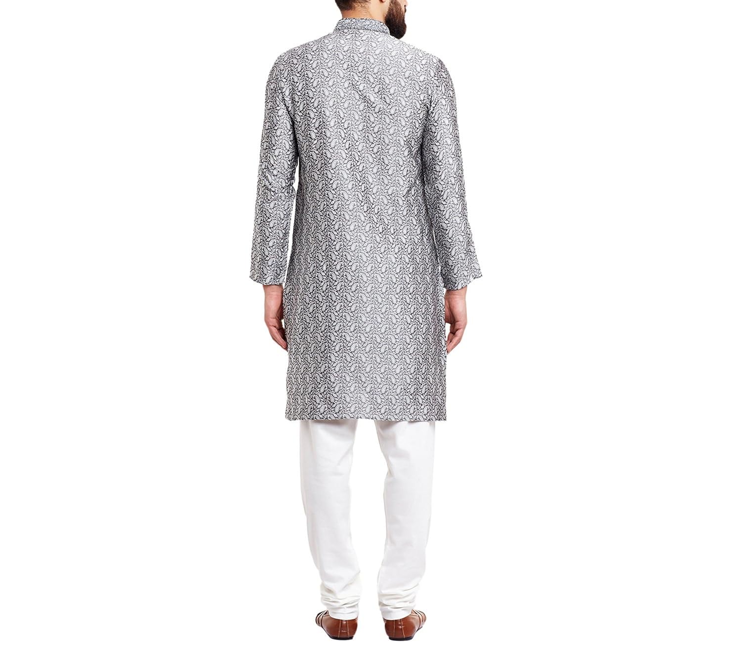 SOJANYA as a brand brings you quality and affordability. In market since 1958, we take pride in our commitment to maintain quality standards in each piece manufactured by us. Look your ethnic best wearing this Grey kurta and White pyjama . Made of Jacquard silk, this regular-fit kurta pyjama set comprises a full-sleeved kurta with self design & embroidery on neck and a pajama. Team this outifit with mojris and look apart on special occasions. |