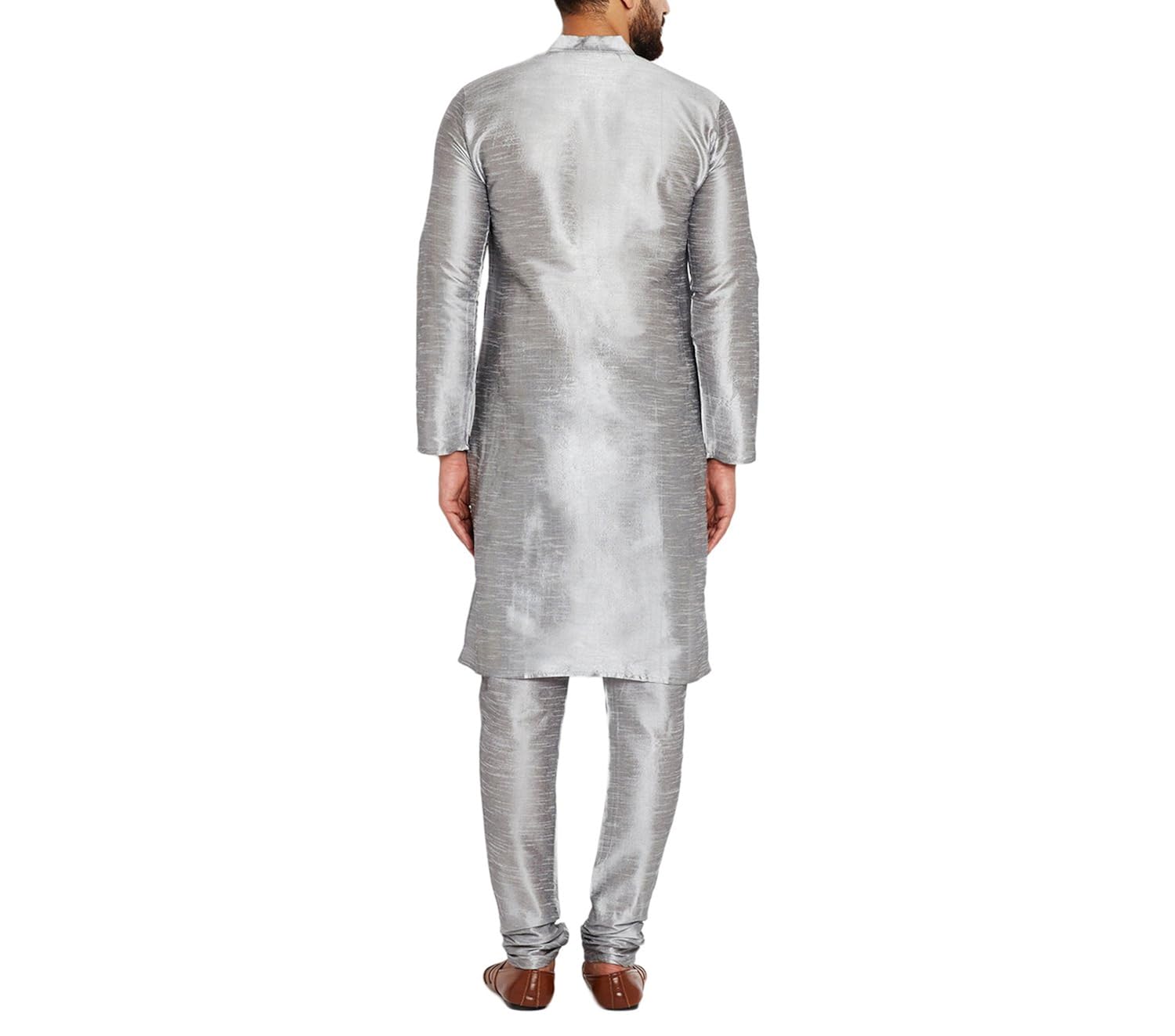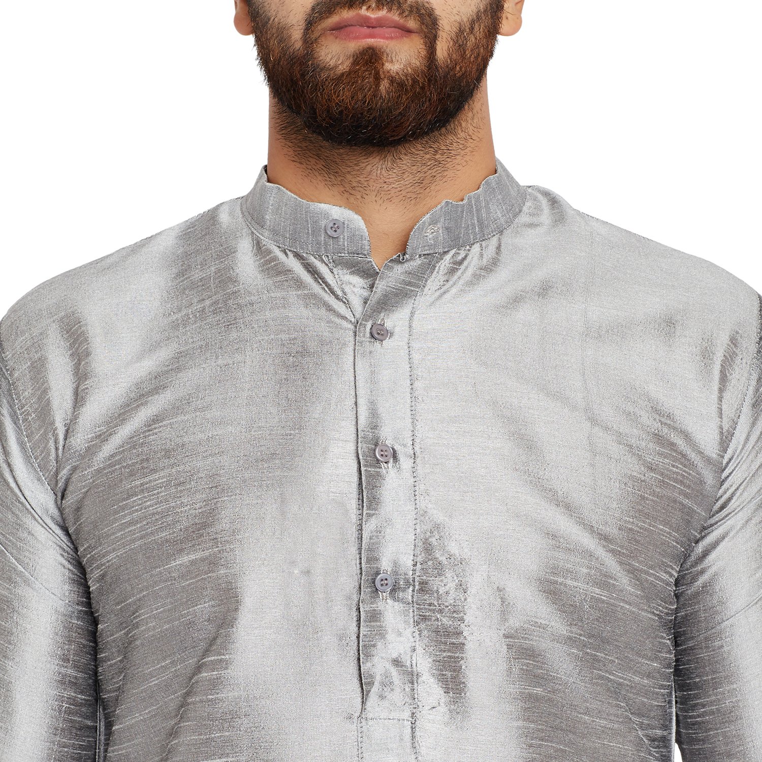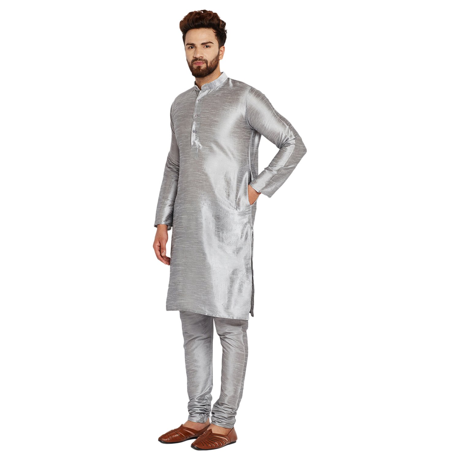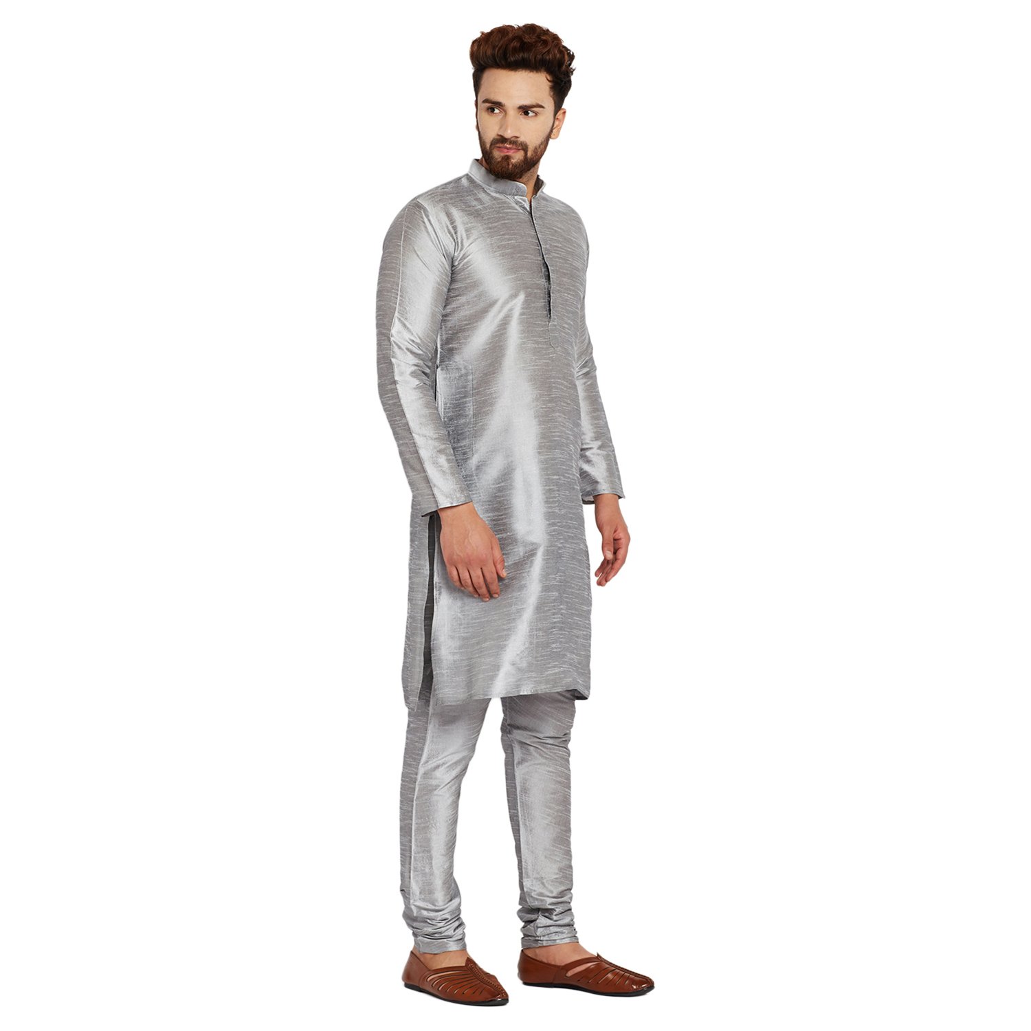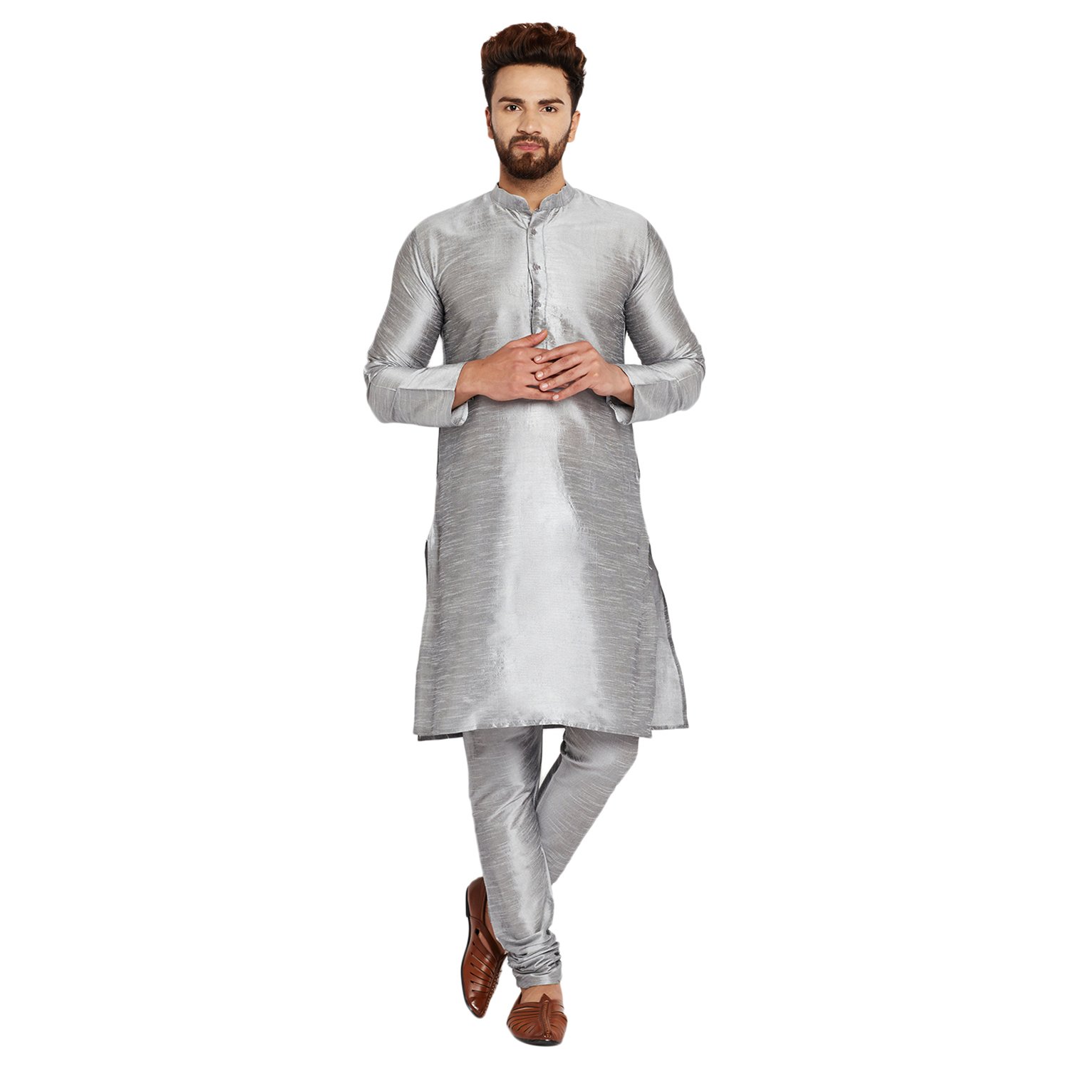 SOJANYA as a brand brings you quality and affordability. In market since 1958, we take pride in our commitment to maintain quality standards in each piece manufactured by us. Look your ethnic best wearing this Grey coloured kurta pyjama set for men from the fashion house of Sojanya. Made from dupion silk, this regular-fit kurta pyjama set comprises a full-sleeved kurta and pyjama to complete your look. Team this outfit with embroidered mojris and rock the party that you attend. |