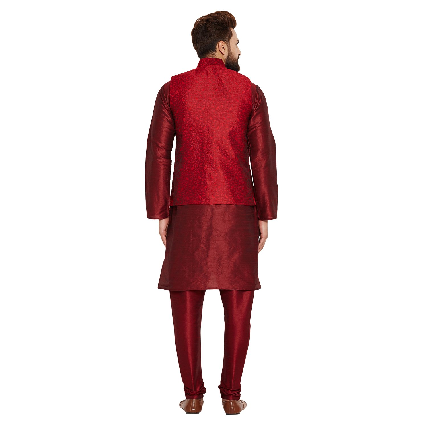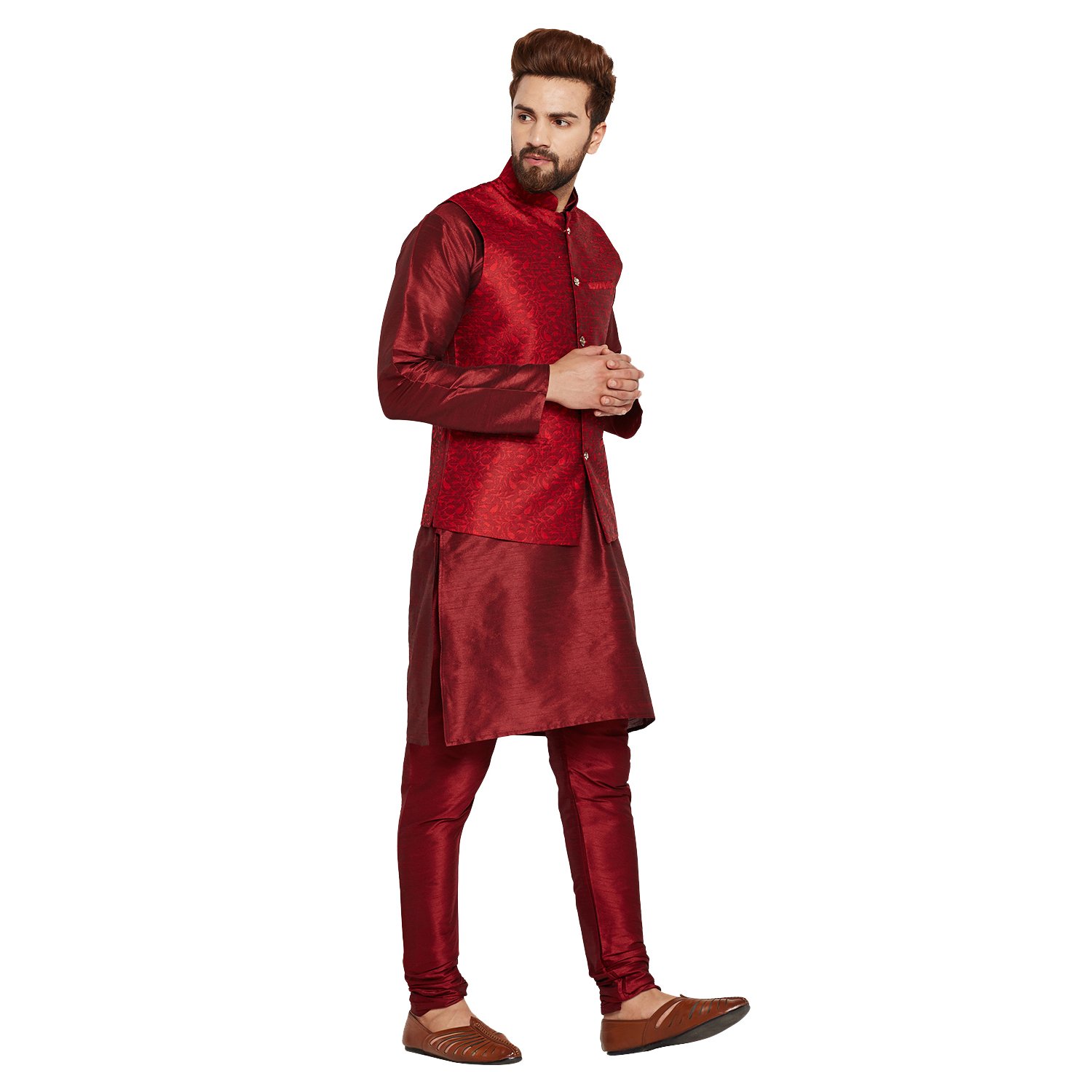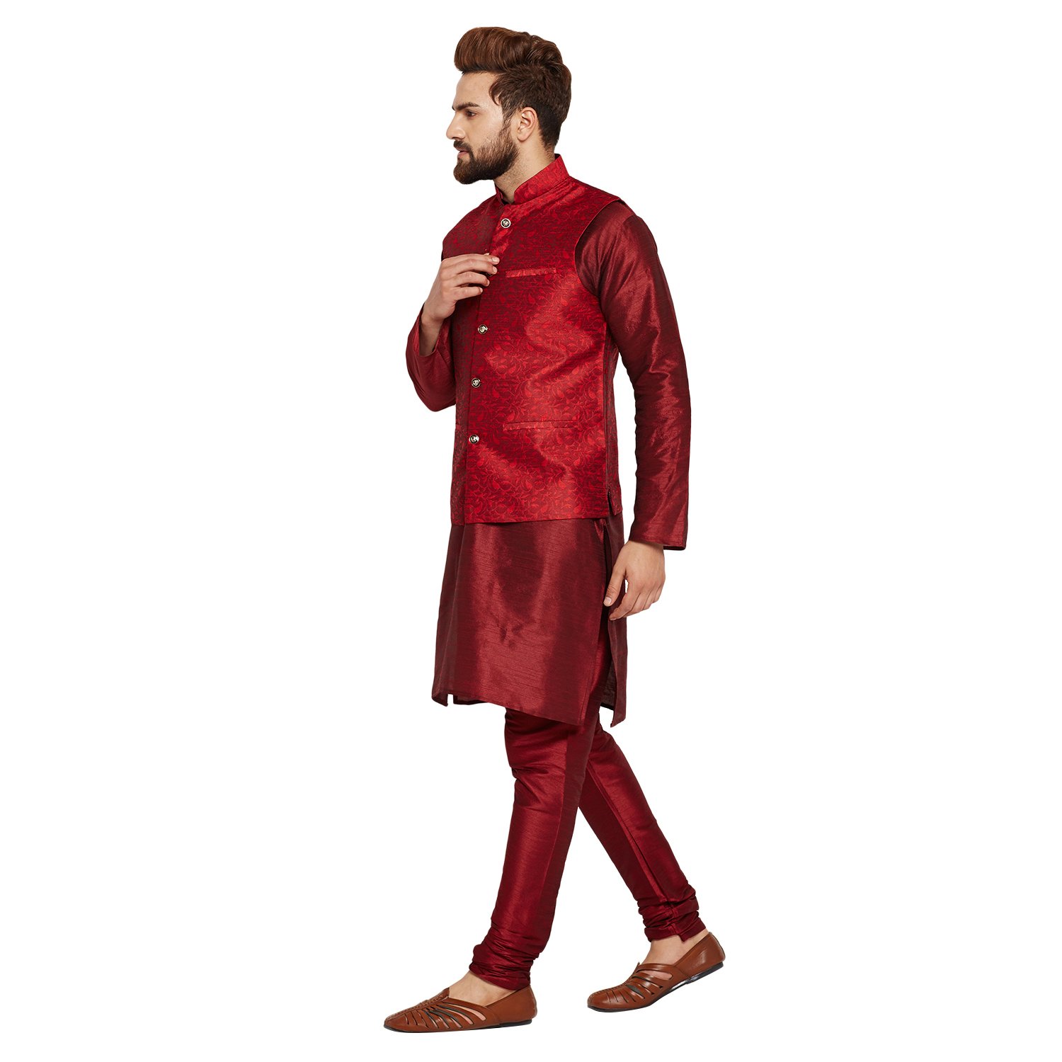 SOJANYA as a brand brings you quality and affordability. In market since 1958, we take pride in our commitment to maintain quality standards in each piece manufactured by us. A true epitome of class, this kurta Pyjama and Nehru Jacket Combo will surely reflect your impeccable taste in fashion. Made from banarsi dupion silk fabric, this set will surely make you the cynosure of all eyes. Team this Kurta Pyjama Nehru jacket set with a pair of mojris or kolhapuri chappals to give a classy touch to your ethnic look. The Kurta Pyjama is made of Maroon Color Dupion Silk fabric and With Maroon Color Jacquard Nehru Jacket Set. |