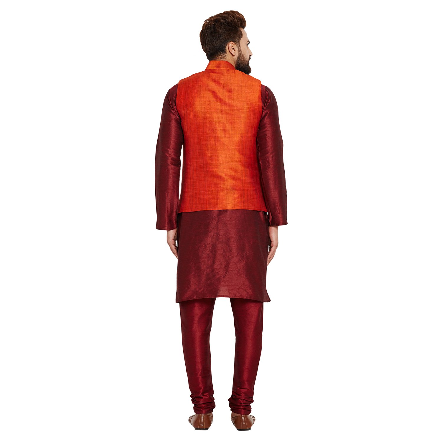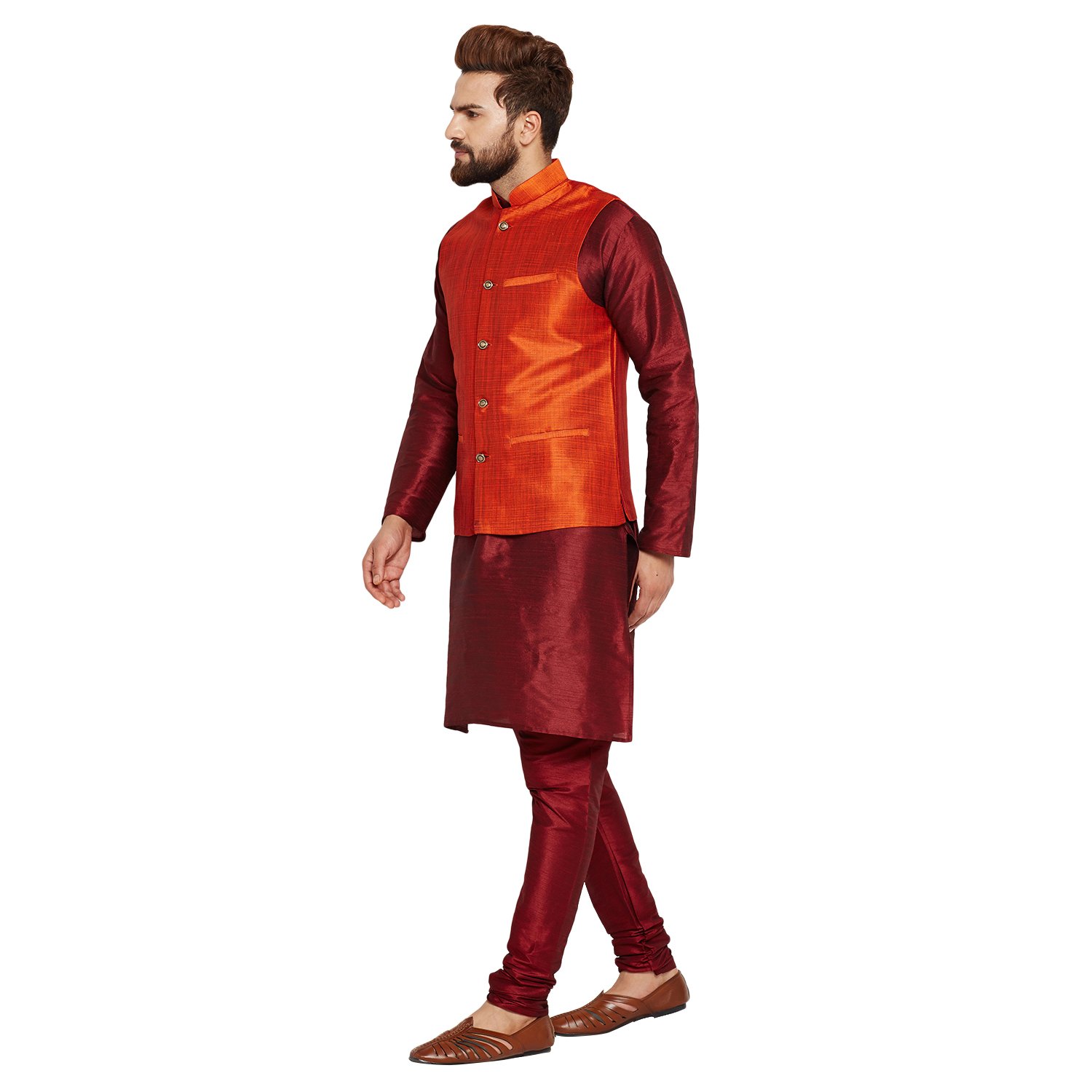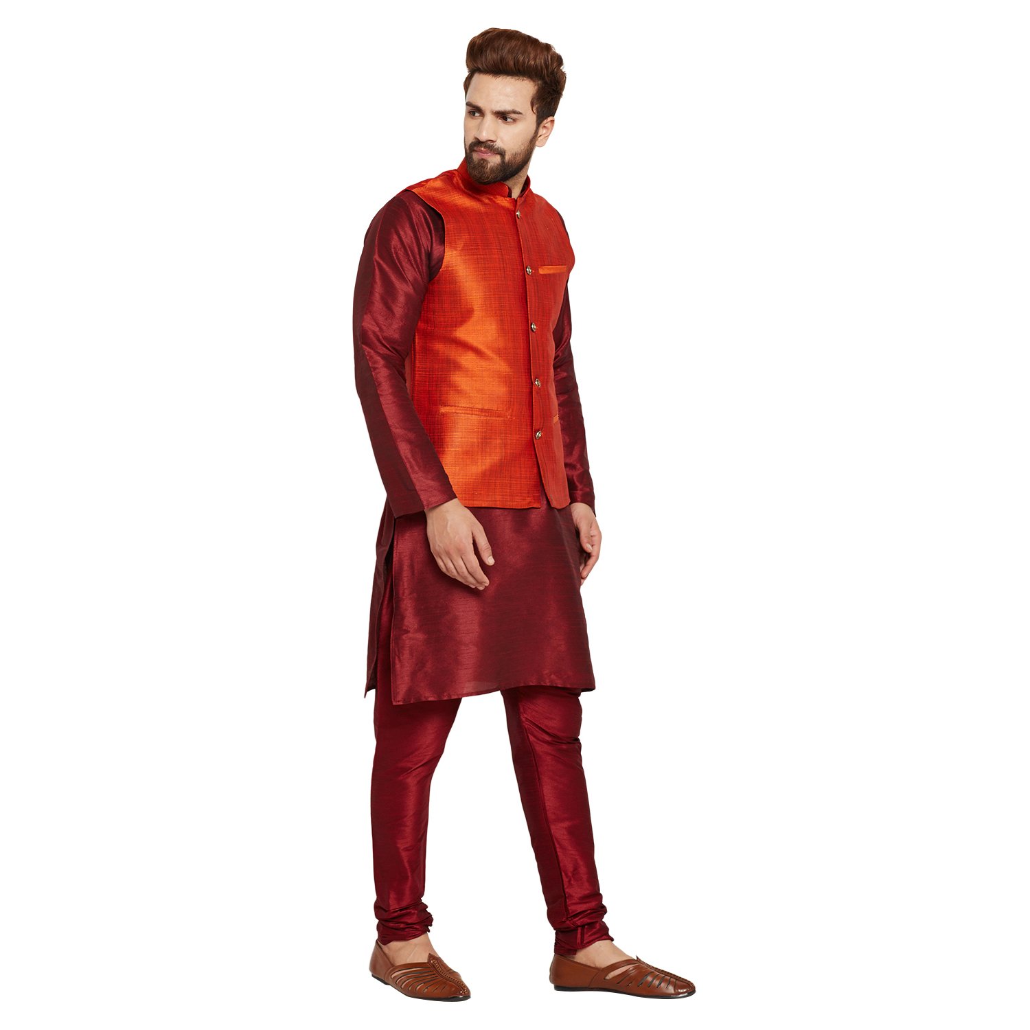 SOJANYA as a brand brings you quality and affordability. In market since 1958, we take pride in our commitment to maintain quality standards in each piece manufactured by us. A true epitome of class, this kurta Pyjama and Nehru Jacket Combo will surely reflect your impeccable taste in fashion. Made from banarsi dupion silk fabric, this set will surely make you the cynosure of all eyes. Team this Kurta Pyjama Nehru jacket set with a pair of mojris or kolhapuri chappals to give a classy touch to your ethnic look. The Kurta Pyjama is made of Maroon Color Dupion Silk fabric and With Orange Color Dupion Silk Nehru Jacket Set. |