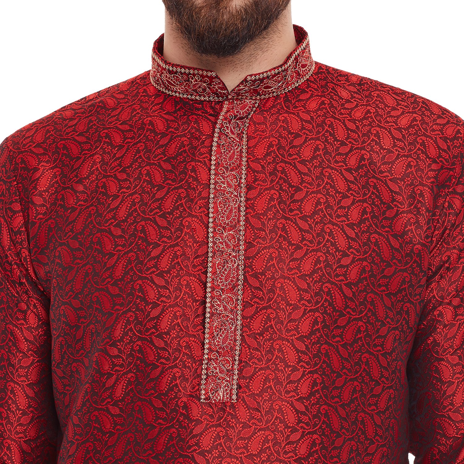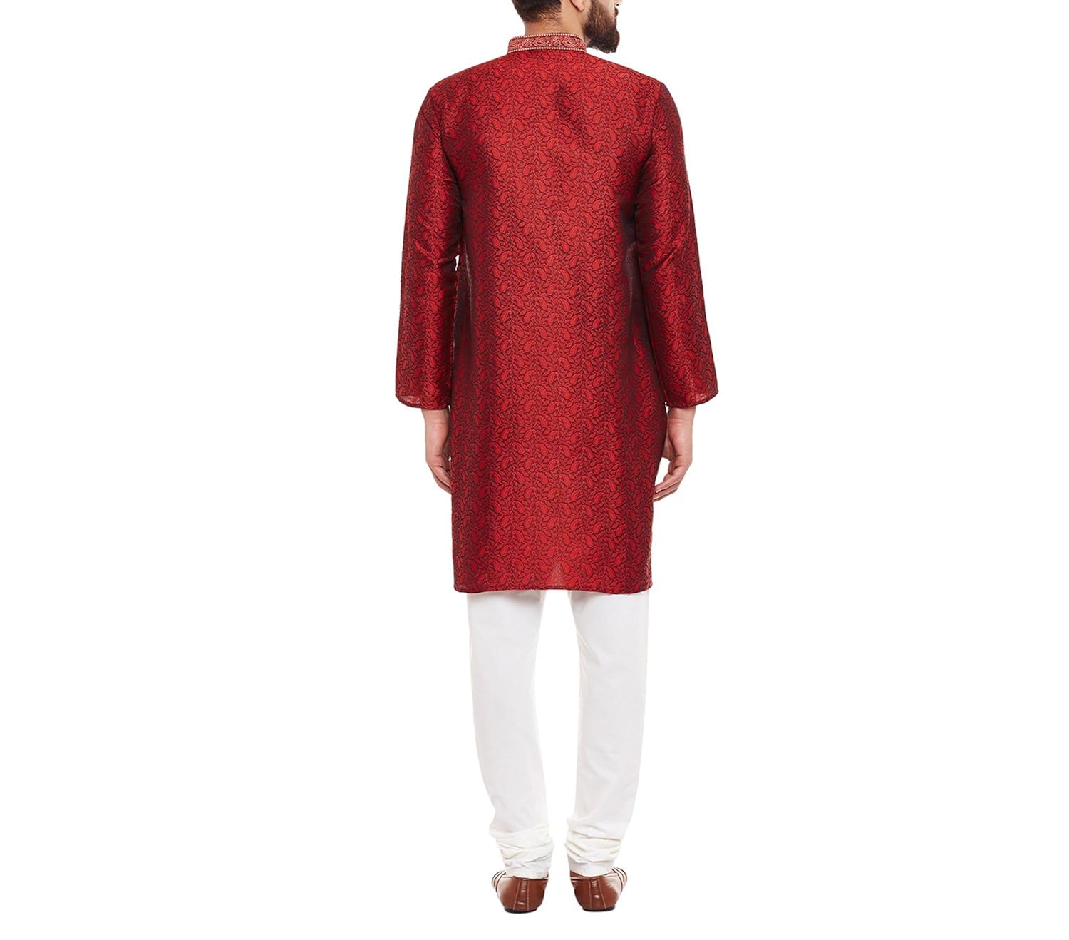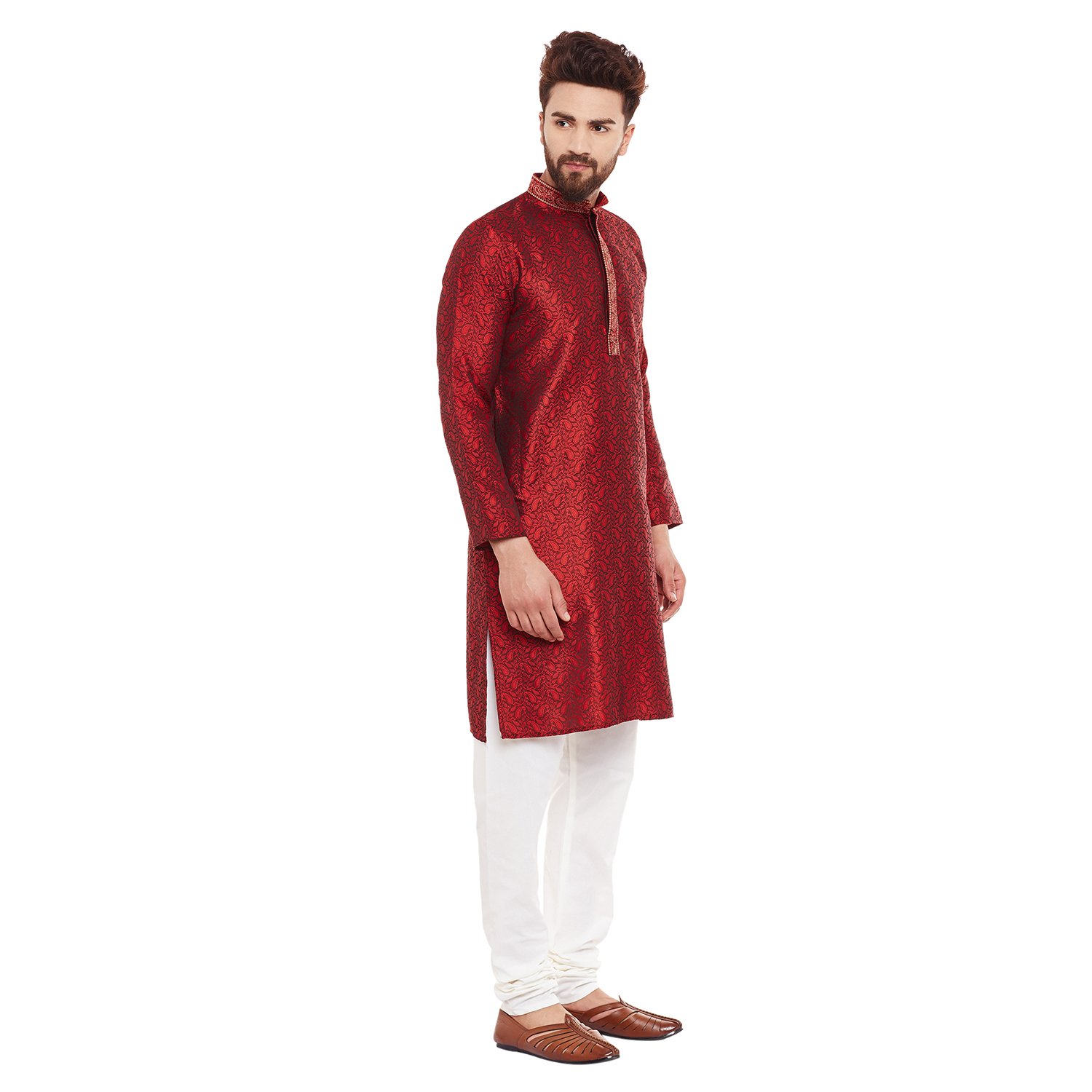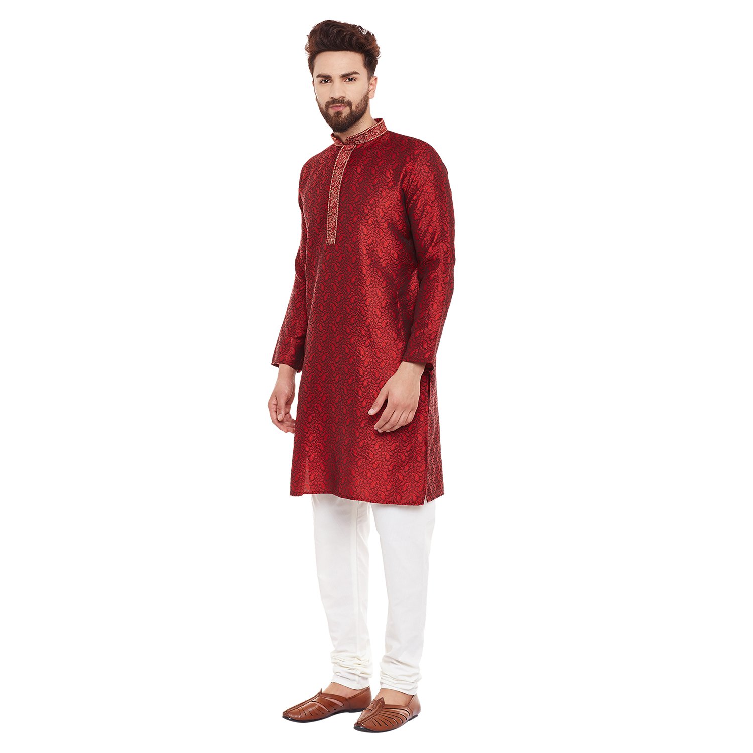 SOJANYA as a brand brings you quality and affordability. In market since 1958, we take pride in our commitment to maintain quality standards in each piece manufactured by us. Look your ethnic best wearing this Maroon kurta and White pyjama . Made of Jacquard silk, this regular-fit kurta pyjama set comprises a full-sleeved kurta with self design & embroidery on neck and a pajama. Team this outifit with mojris and look apart on special occasions. |