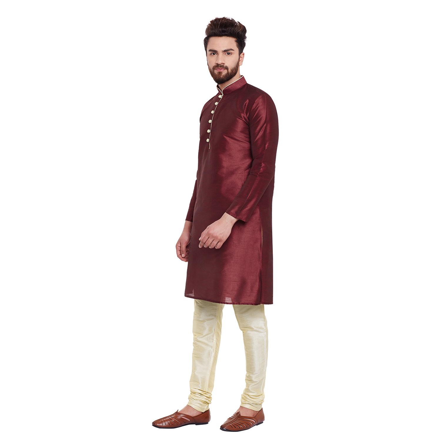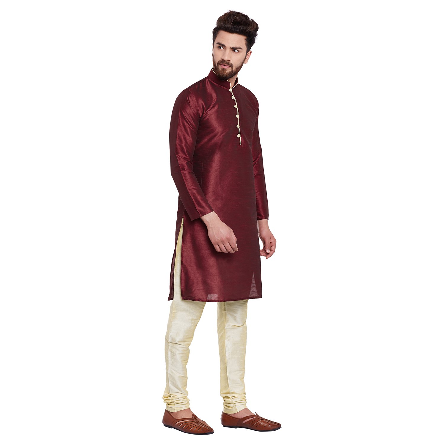 SOJANYA as a brand brings you quality and affordability. In market since 1958, we take pride in our commitment to maintain quality standards in each piece manufactured by us. Look your ethnic best wearing this Mehroon kurta and Mehroon pyjama . Made of Dupuion silk, this regular-fit kurta pyjama set comprises a full-sleeved kurta with golden colored detailing & front buttoned placket and a pajama. Team this outifit with mojris and look apart on special occasions. |