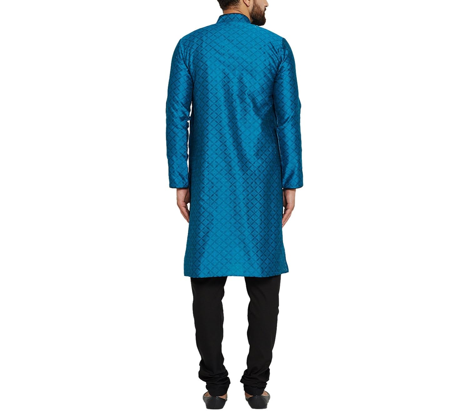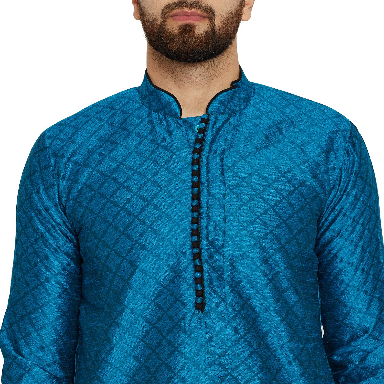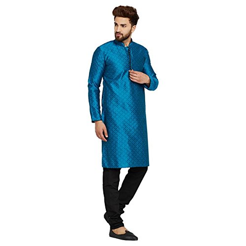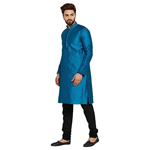 SOJANYA as a brand brings you quality and affordability. In market since 1958, we take pride in our commitment to maintain quality standards in each piece manufactured by us. Look your ethnic best wearing this Blue colored Kurta Pyjama set. Made of Dupion Silk, this regular-fit kurta pyjama set comprises a full-sleeved blue colored kurta with self design and classic buttoned front placket and Black churidaar pyjama. Team this outifit with mojris and look apart on special occasions. |