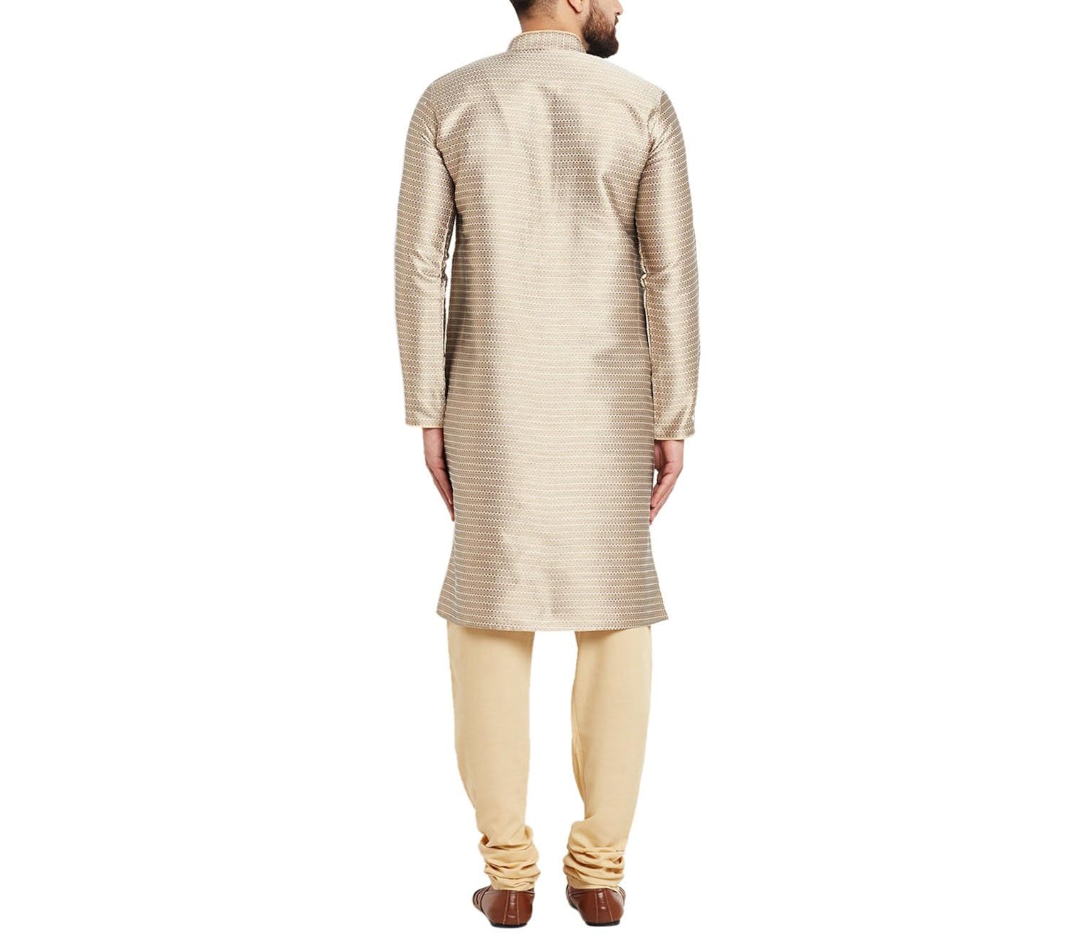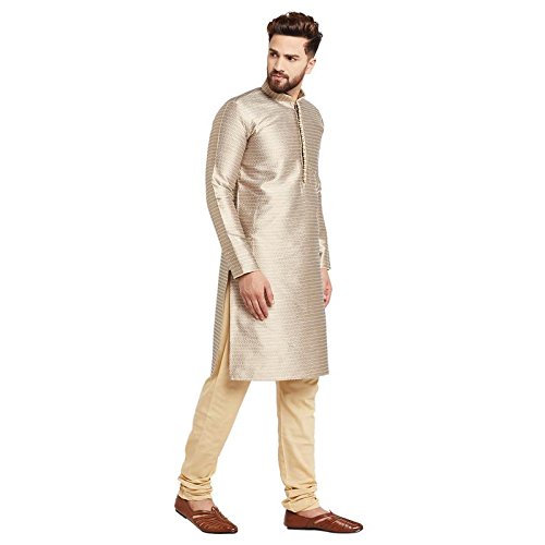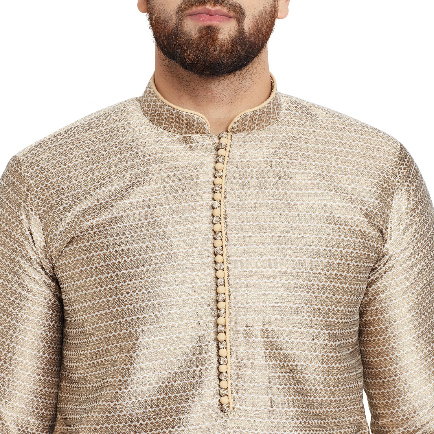 SOJANYA as a brand brings you quality and affordability. In market since 1958, we take pride in our commitment to maintain quality standards in each piece manufactured by us. Look your ethnic best wearing this Copper colored Kurta Pyjama set. Made of Jacquard Silk, this regular-fit kurta pyjama set comprises a full-sleeved Copper colored kurta with golden colored self design and detailing on neck and sleeves and Beige churidaar pyjama. Team this outifit with mojris and look apart on special occasions. |