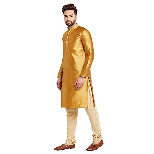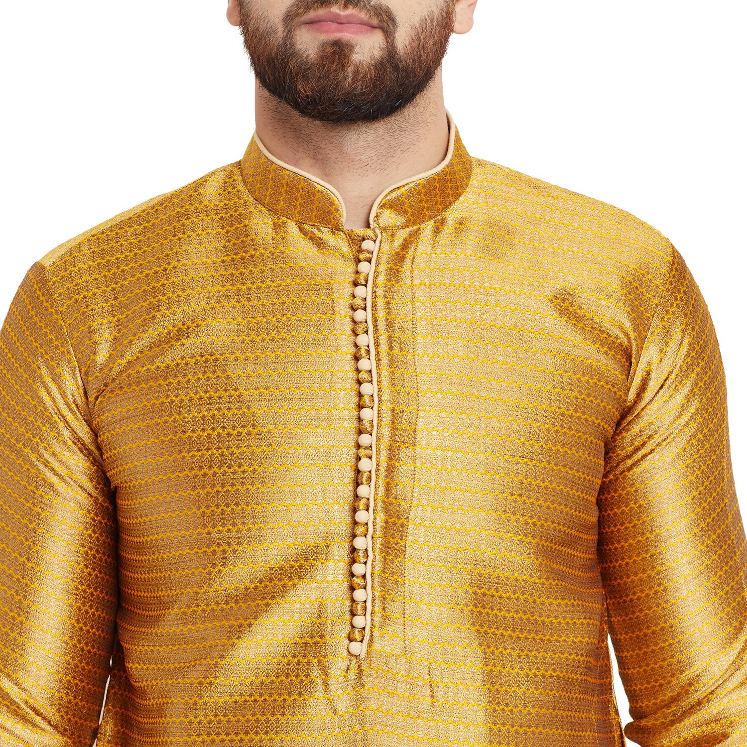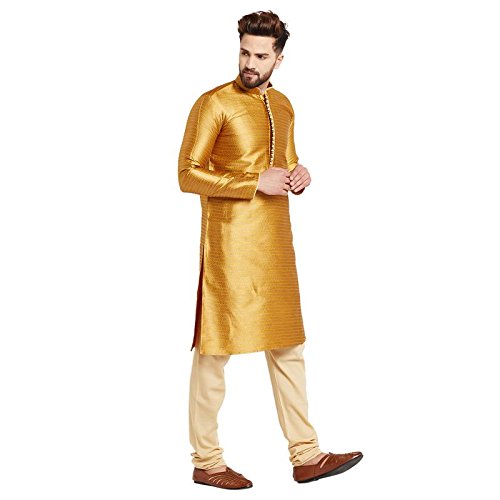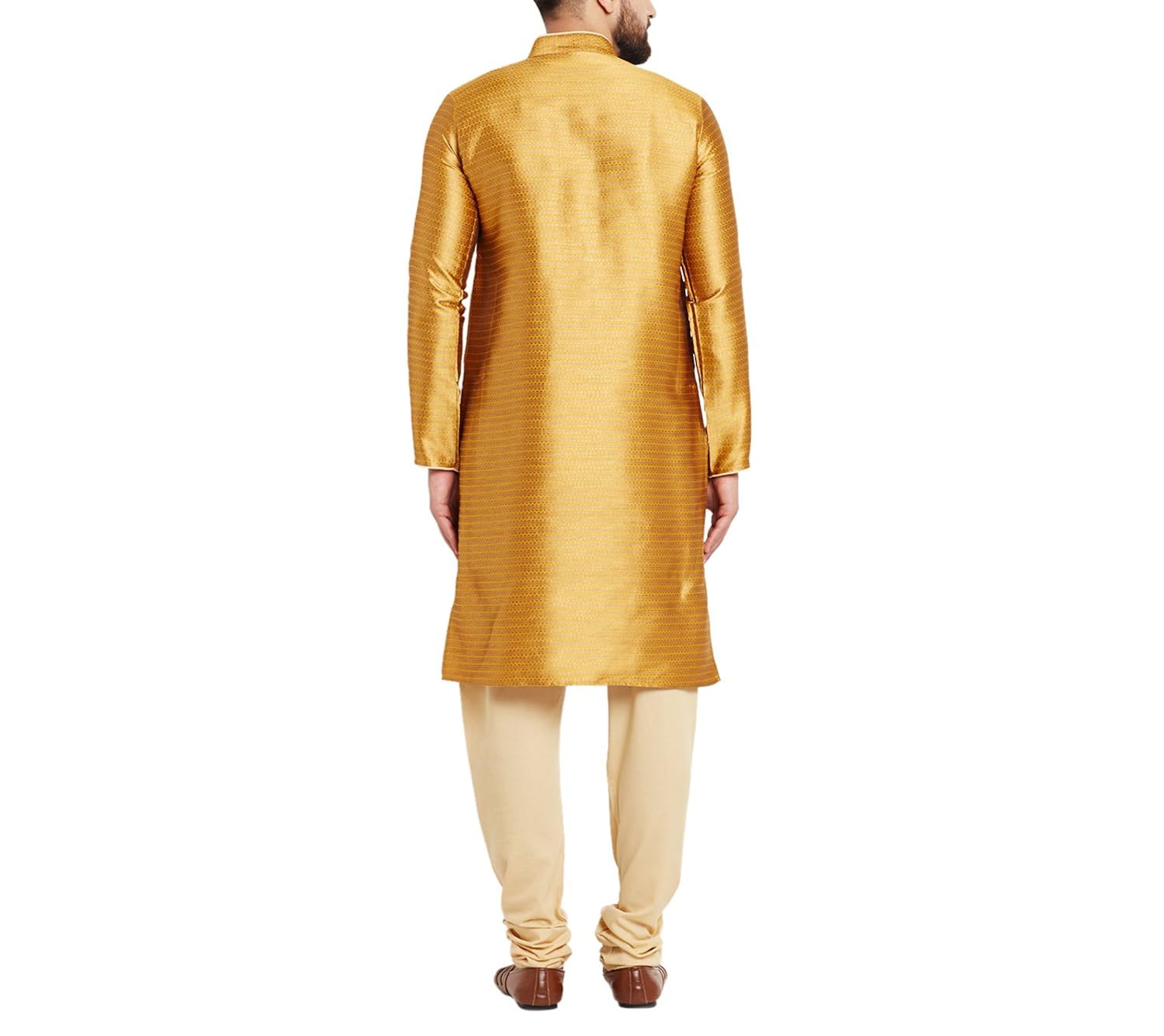 SOJANYA as a brand brings you quality and affordability. In market since 1958, we take pride in our commitment to maintain quality standards in each piece manufactured by us. Look your ethnic best wearing this Gold Yellow colored Kurta Pyjama set. Made of Jacquard Silk, this regular-fit kurta pyjama set comprises a full-sleeved Gold Yellow colored kurta with golden colored self design and detailing on neck and sleeves and Beige churidaar pyjama. Team this outifit with mojris and look apart on special occasions. |