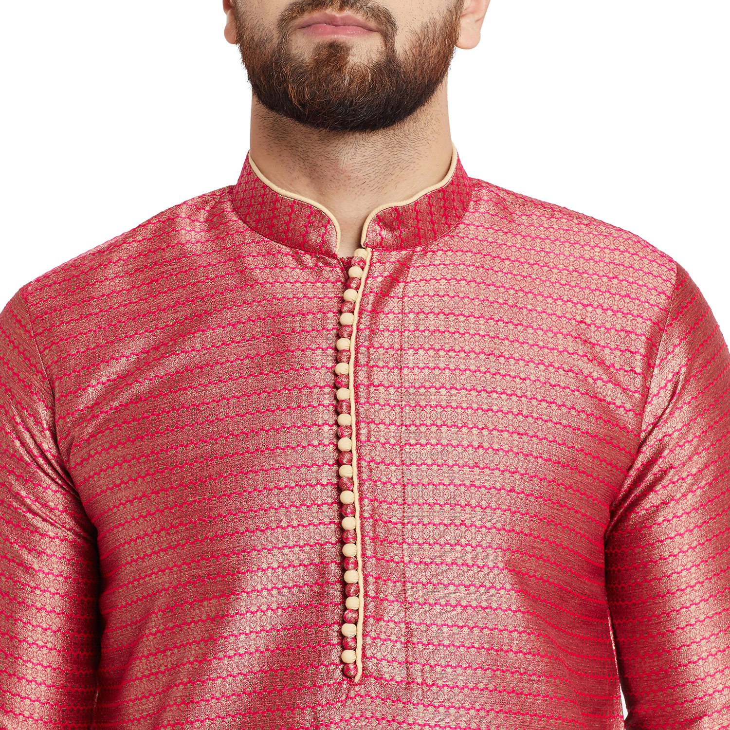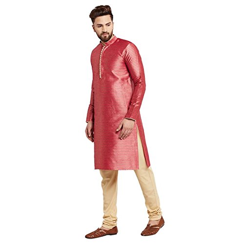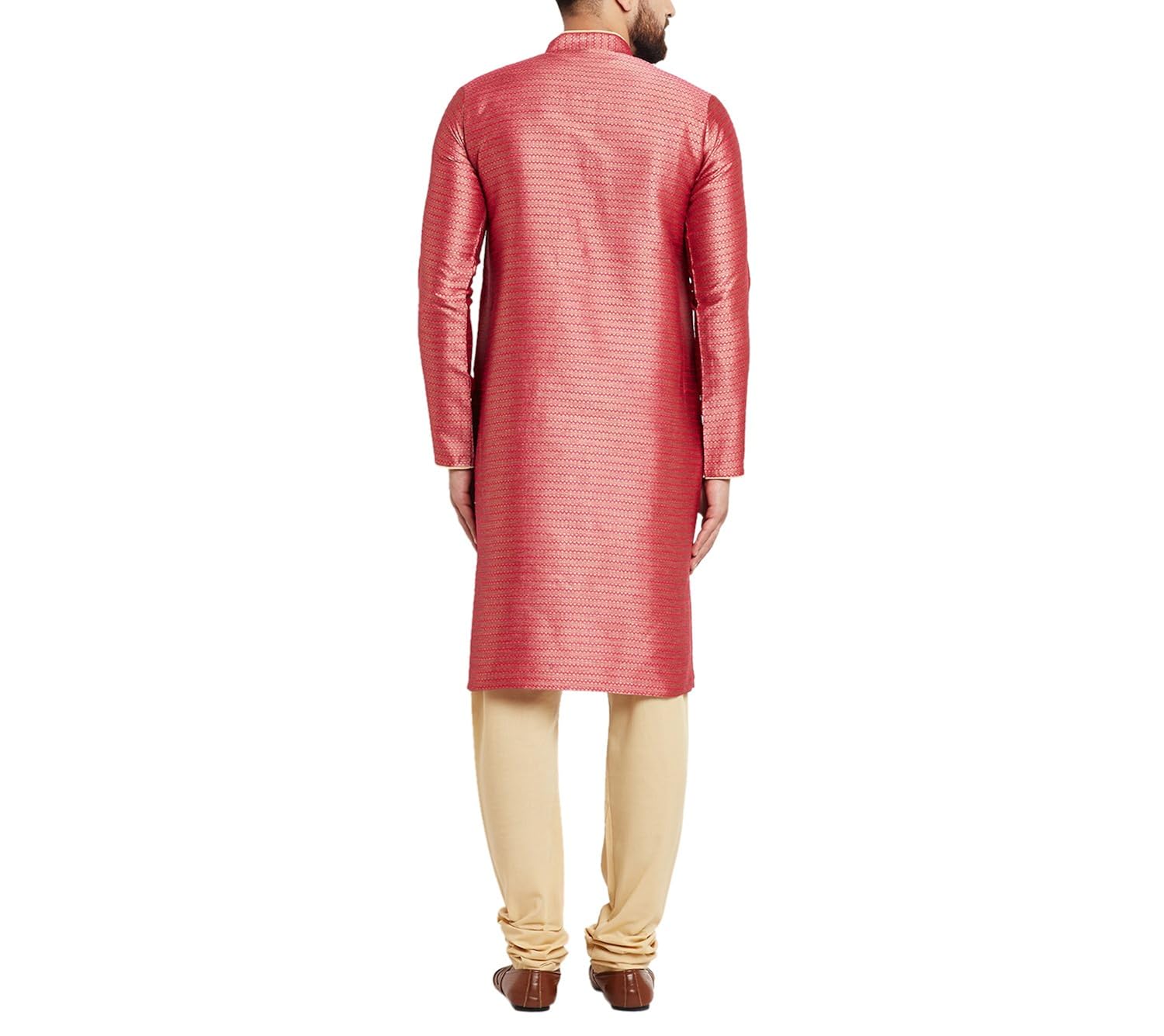 SOJANYA as a brand brings you quality and affordability. In market since 1958, we take pride in our commitment to maintain quality standards in each piece manufactured by us. Look your ethnic best wearing this Pink colored Kurta Pyjama set. Made of Jacquard Silk, this regular-fit kurta pyjama set comprises a full-sleeved Pink colored kurta with golden colored self design and detailing on neck and sleeves and Beige churidaar pyjama. Team this outifit with mojris and look apart on special occasions. |