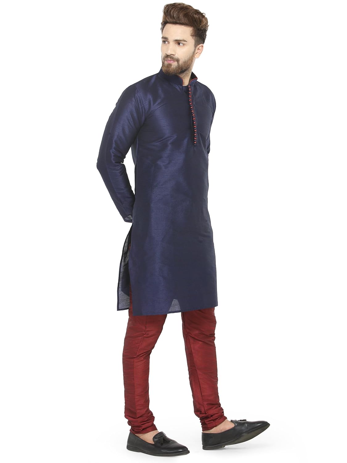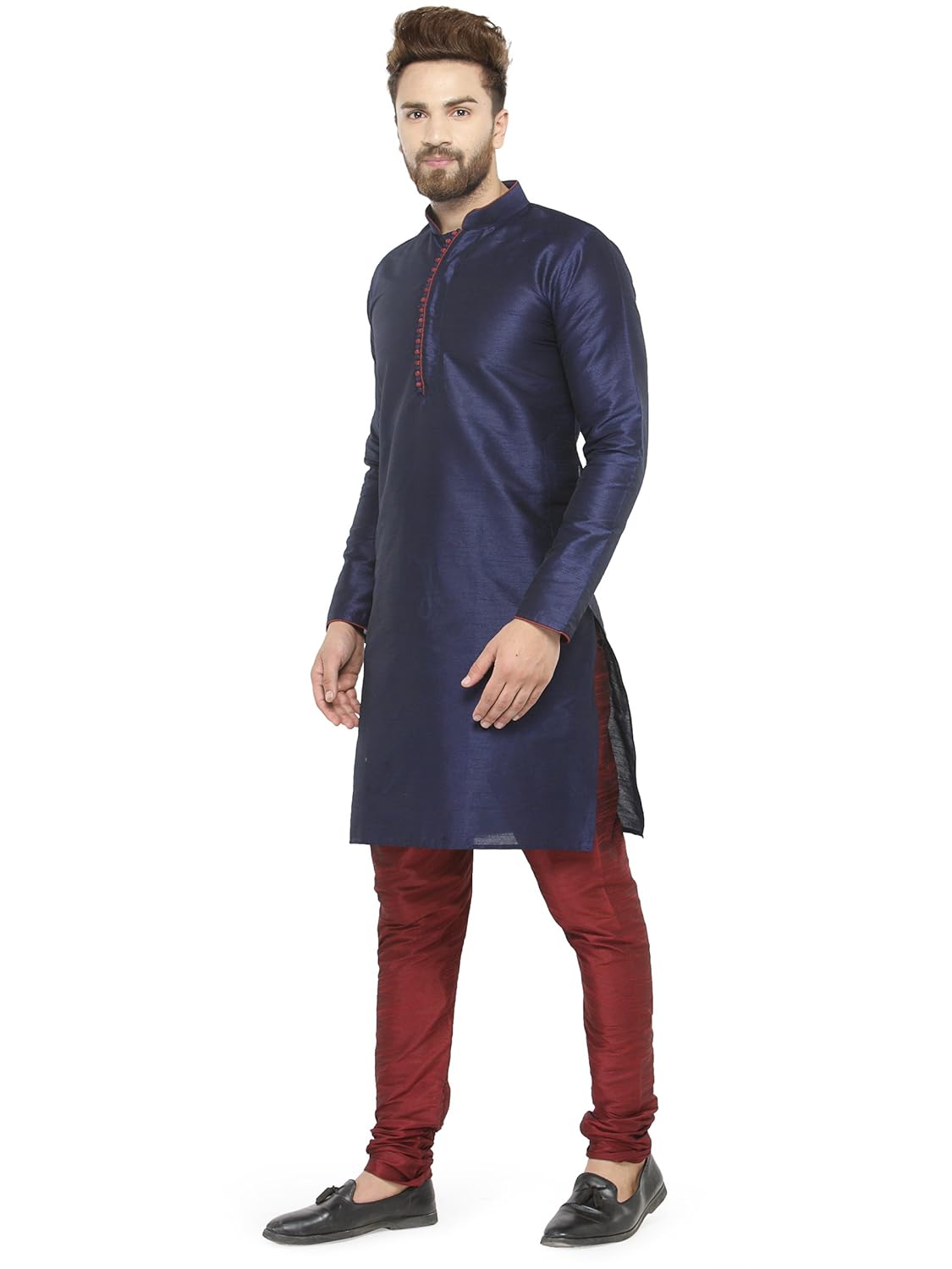 SOJANYA as a brand brings you quality and affordability. In market since 1958, we take pride in our commitment to maintain quality standards in each piece manufactured by us. Look your ethnic best wearing this Blue Dupion Silk kurta and pyjama . Made of (70% Silk and 30% Cotton) fabric, this regular-fit kurta pyjama set comprises a full-sleeved dupion kurta and churidaar pyjama. Team this outifit with embroidered mojris and look apart on special occasions. |