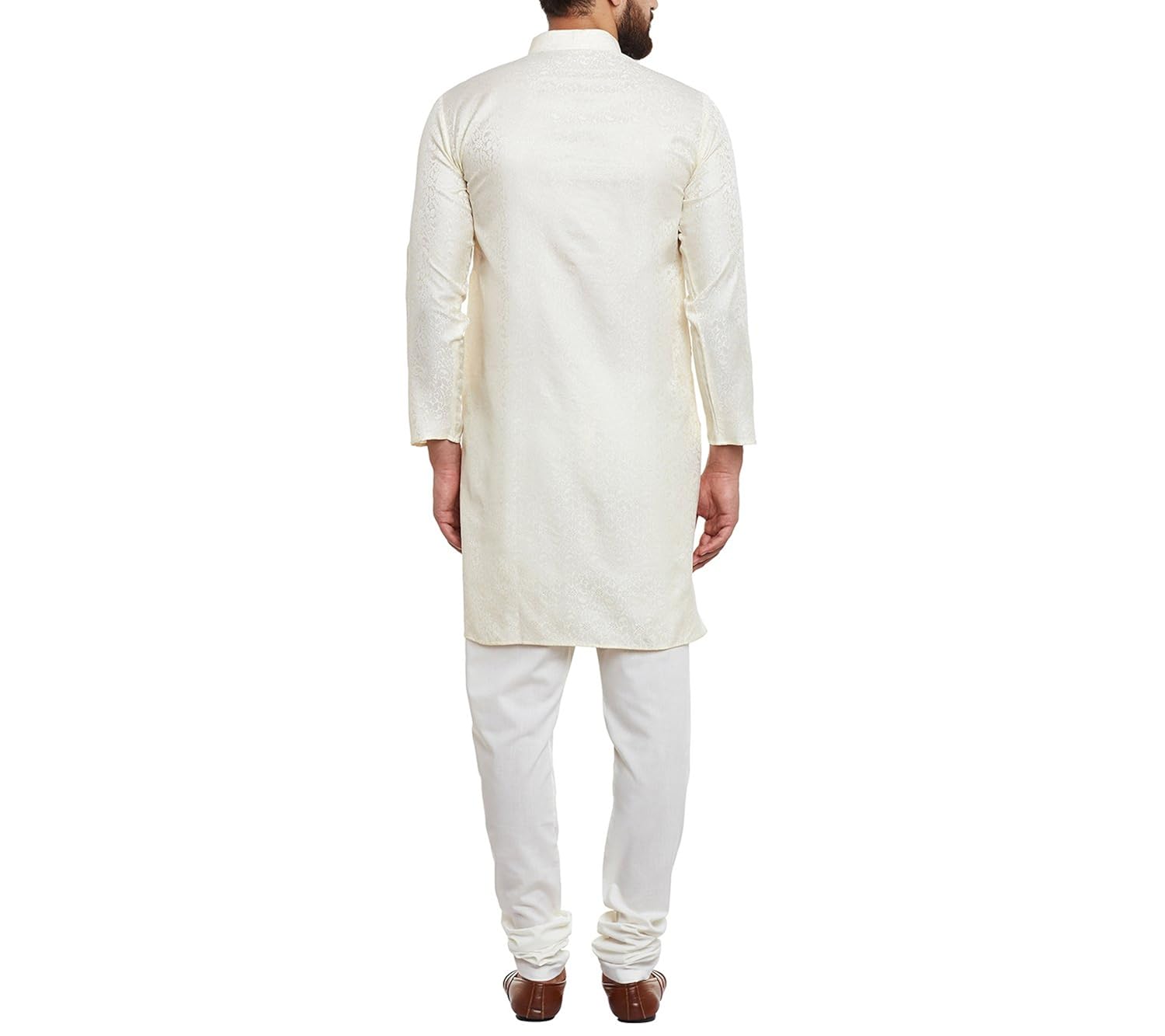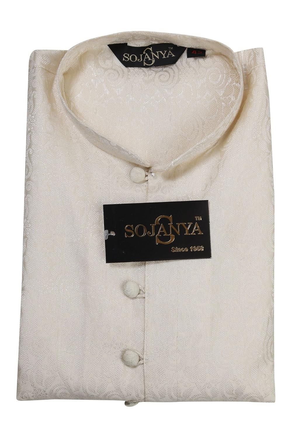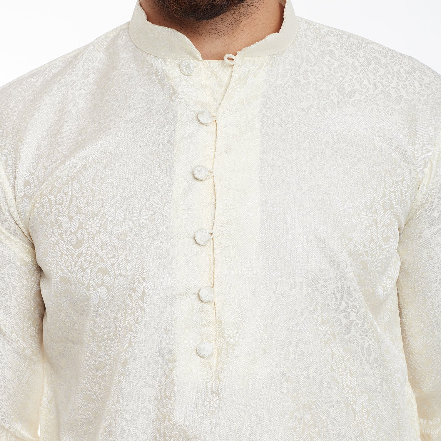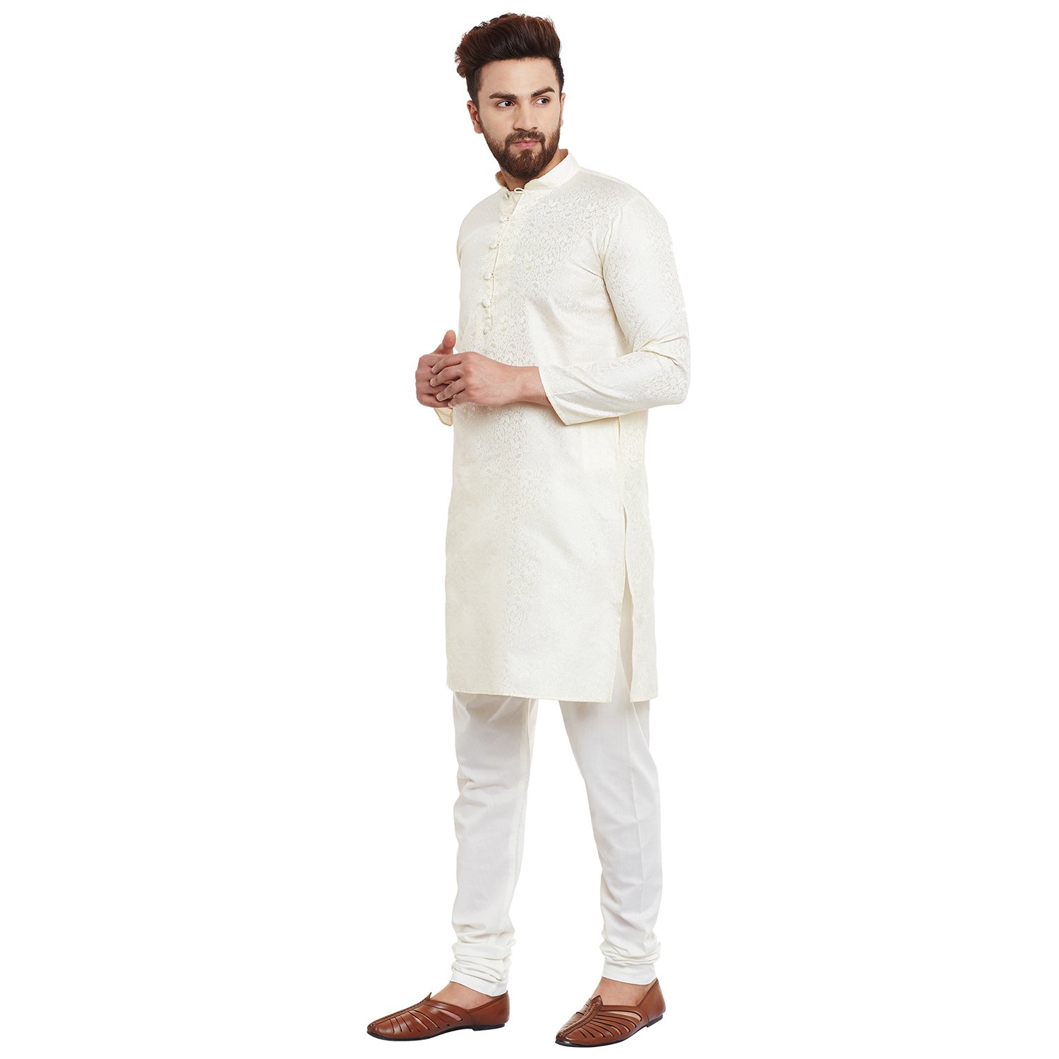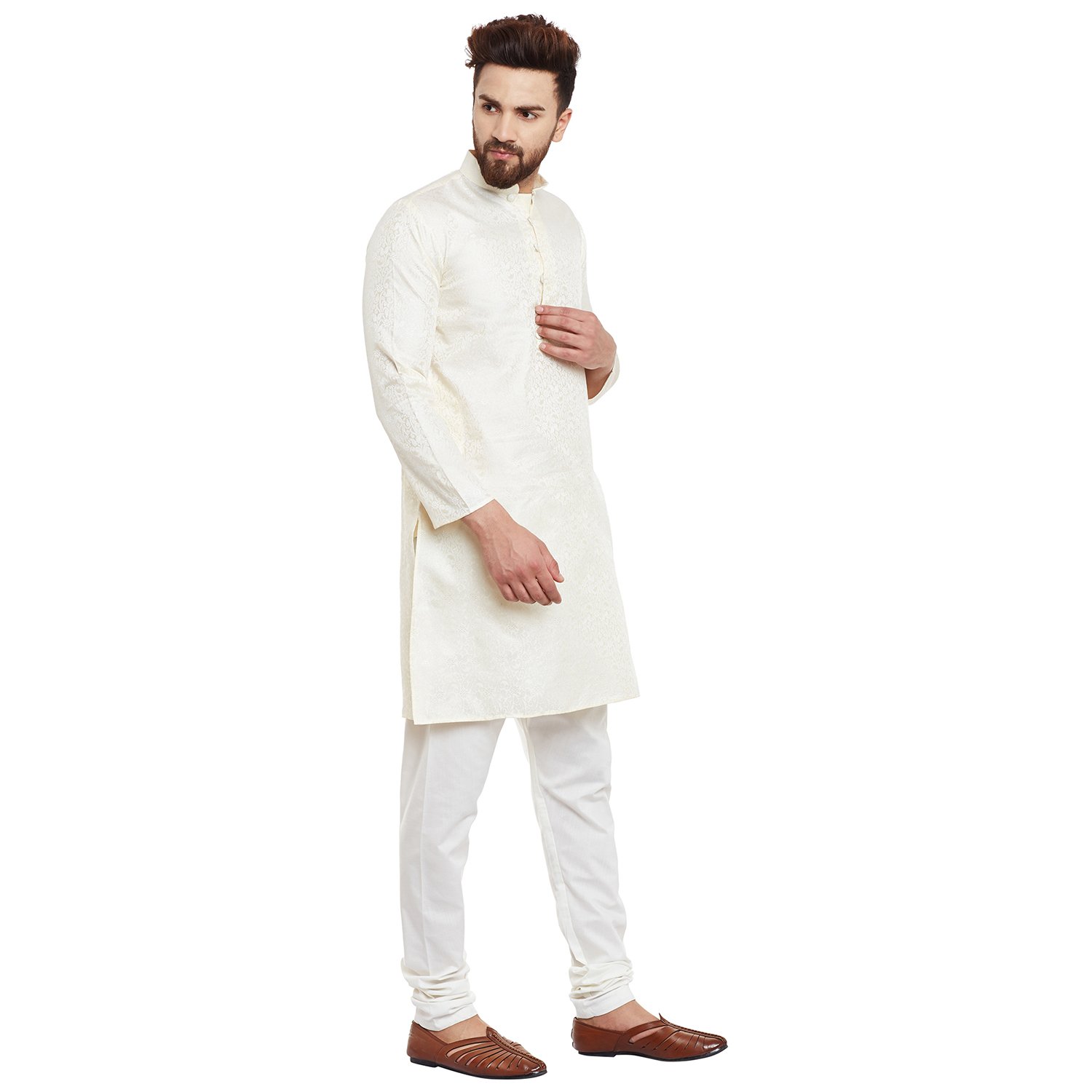 SOJANYA as a brand brings you quality and affordability. In market since 1958, we take pride in our commitment to maintain quality standards in each piece manufactured by us. Look your ethnic best wearing this Off-White kurta and White pyjama . Made of cotton silk, this regular-fit kurta pyjama set comprises a full-sleeved kurta with self floral motifs and pyjama. Team this outifit with mojris and look apart on special occasions. |
