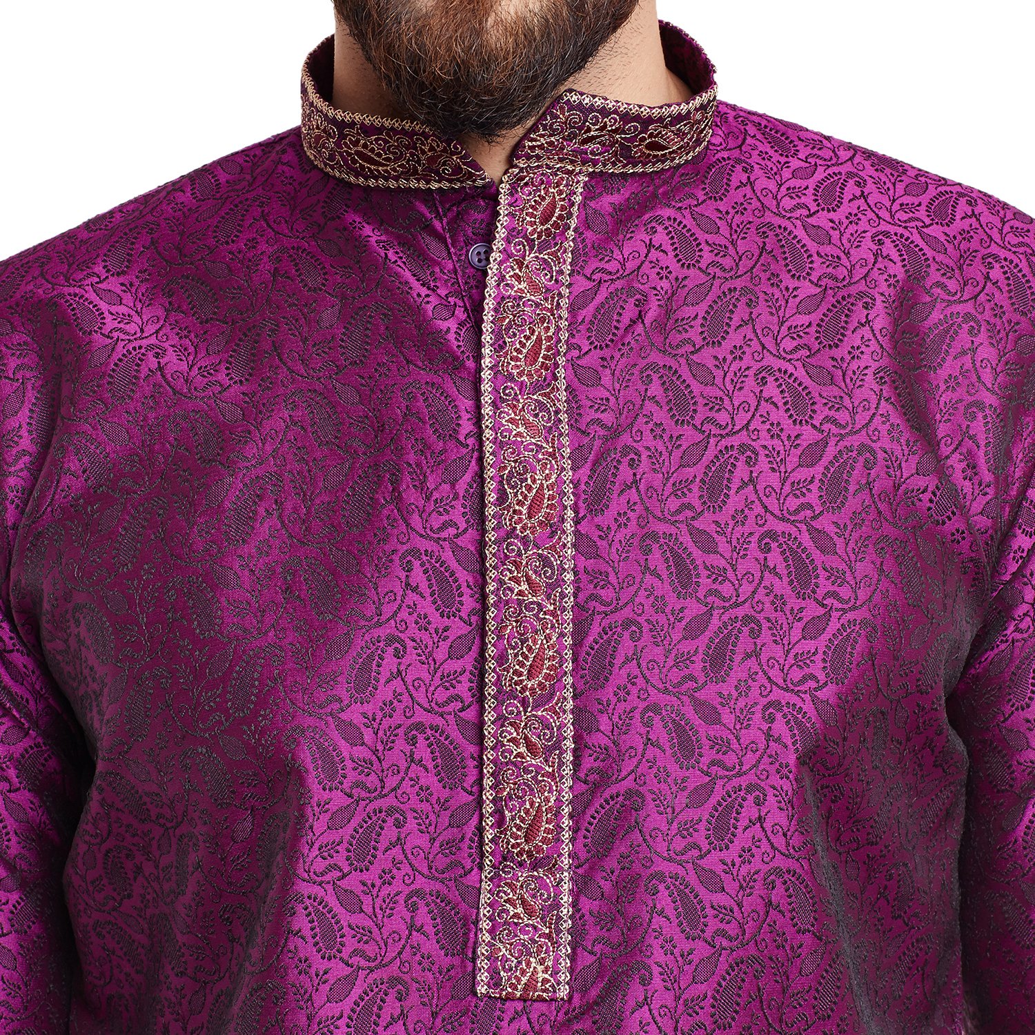 SOJANYA as a brand brings you quality and affordability. In market since 1958, we take pride in our commitment to maintain quality standards in each piece manufactured by us. Look your ethnic best wearing this Purple kurta and White pyjama . Made of Jacquard silk, this regular-fit kurta pyjama set comprises a full-sleeved kurta with self design & embroidery on neck and a pajama. Team this outifit with mojris and look apart on special occasions. |