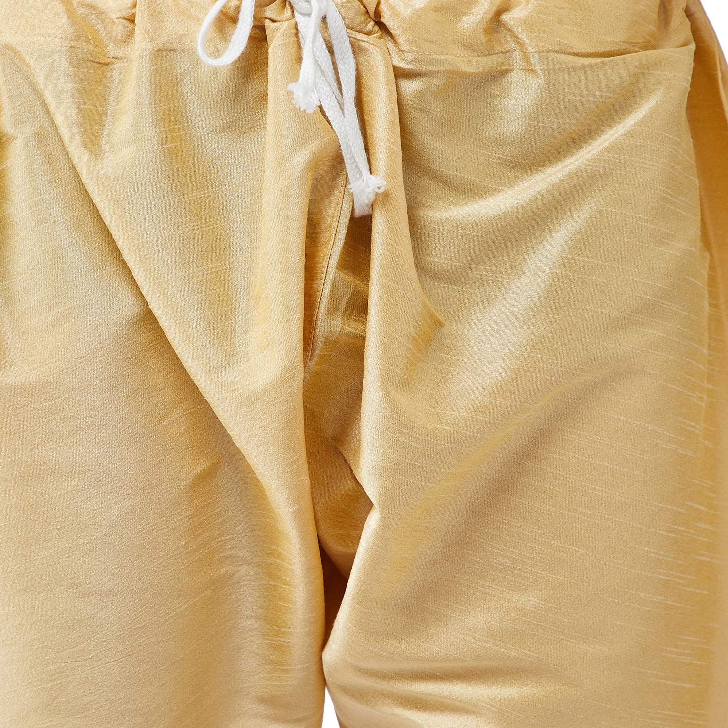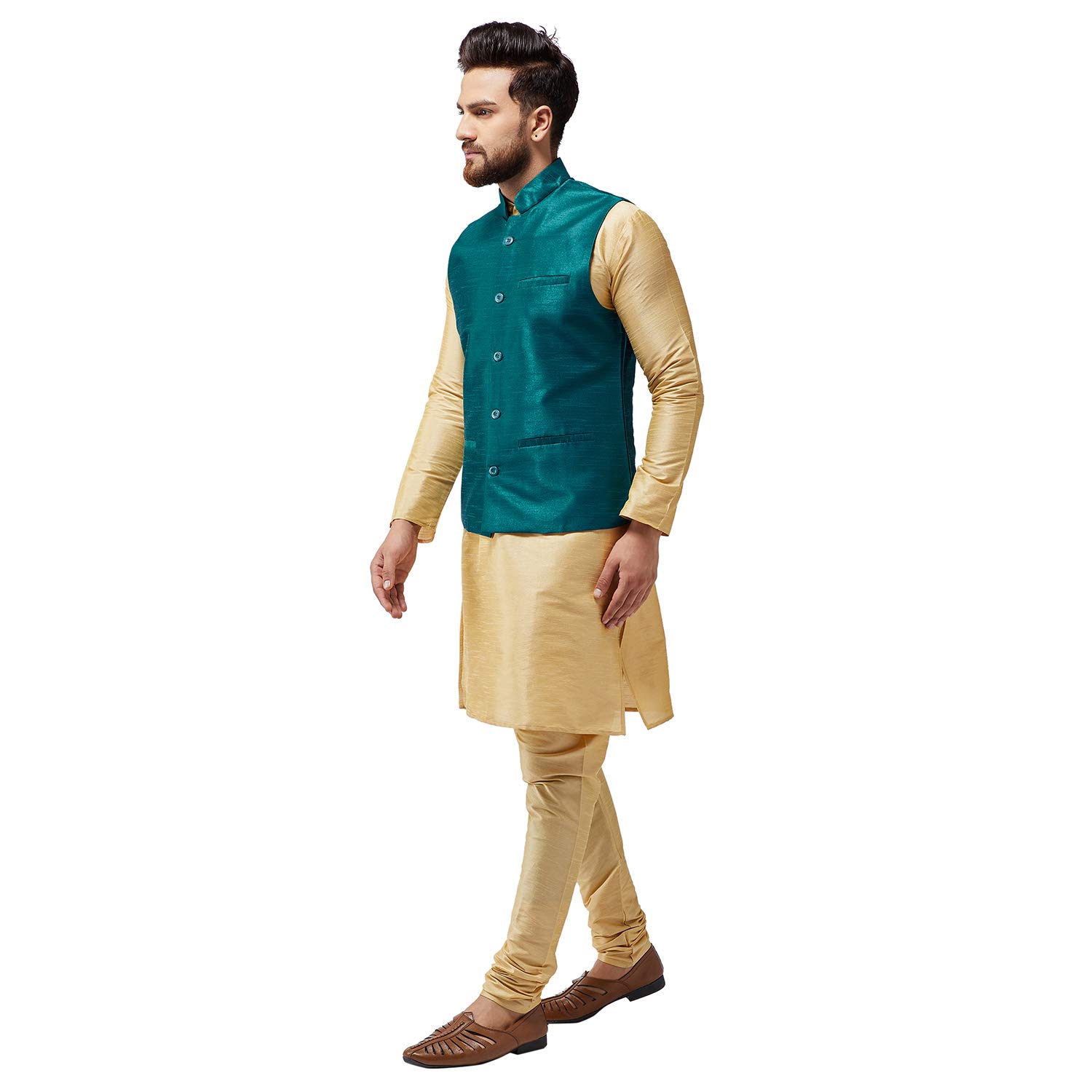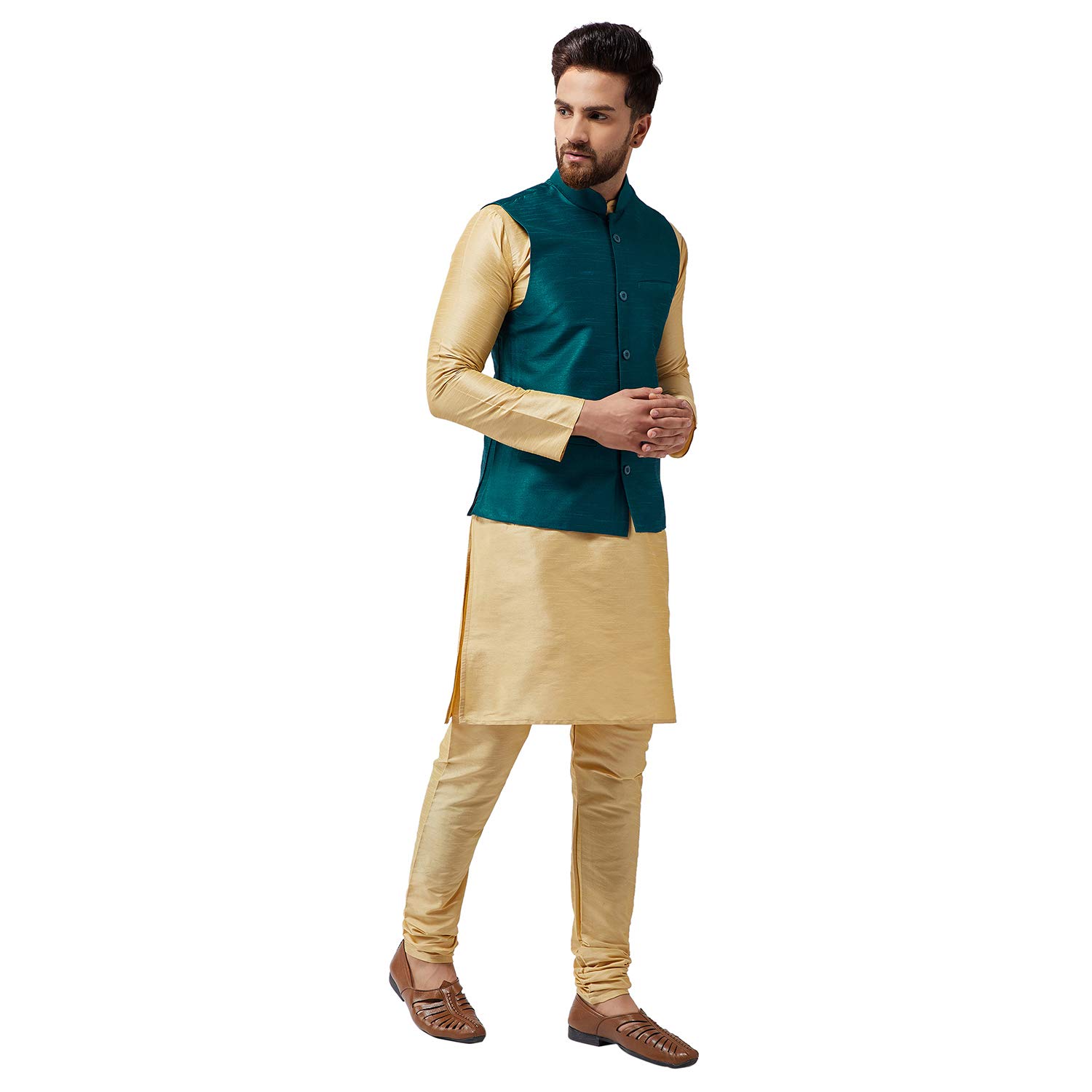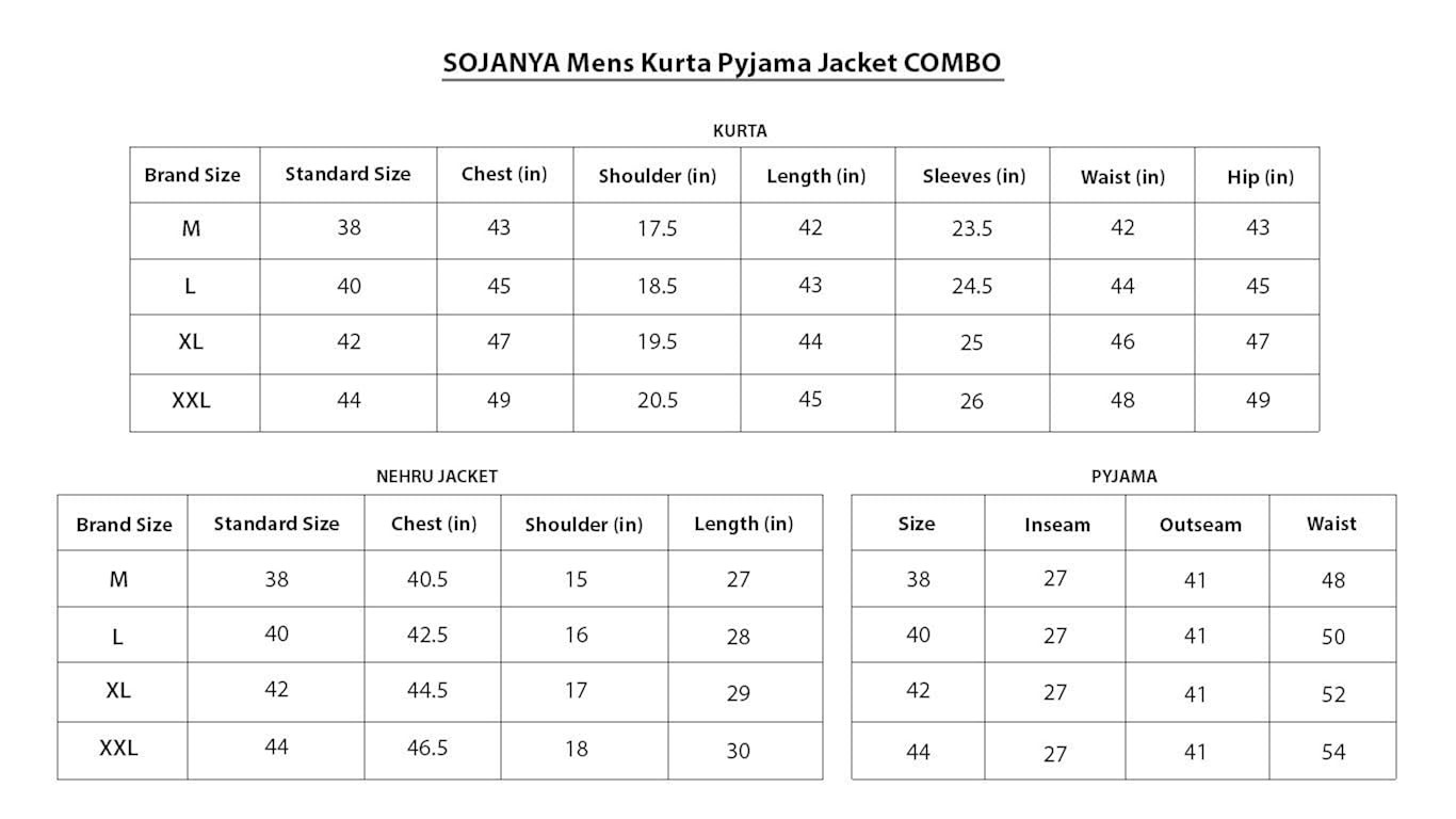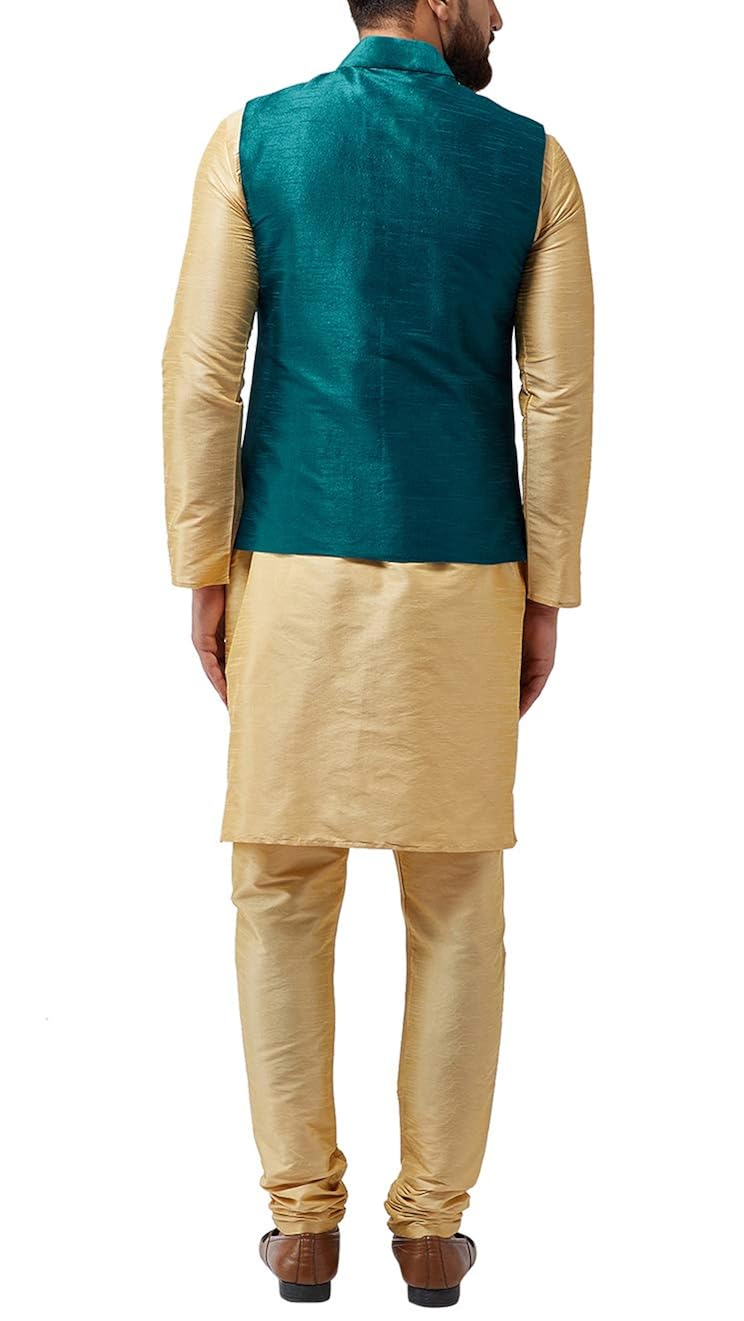 SOJANYA as a brand brings you quality and affordability. In market since 1958, we take pride in our commitment to maintain quality standards in each piece manufactured by us. A true epitome of class, this kurta With Pyjama and Solid Nehru Jacket COMBO will surely reflect your impeccable taste in fashion. Made from banarsi silk fabric, this set will surely make you the cynosure of all eyes. The Kurta & Pyjama is made of Gold Color Silk Blend fabric while the Nehru Jacket Set is of Silk Blend fabric and Navy Blue in color. Team this SET with a pair of mojris or kolhapuri chappals to give a classy touch to your ethnic look. |