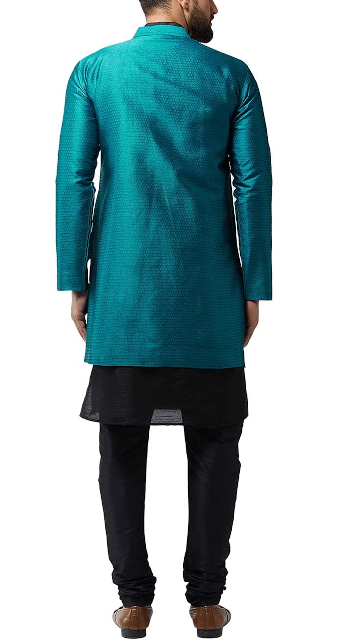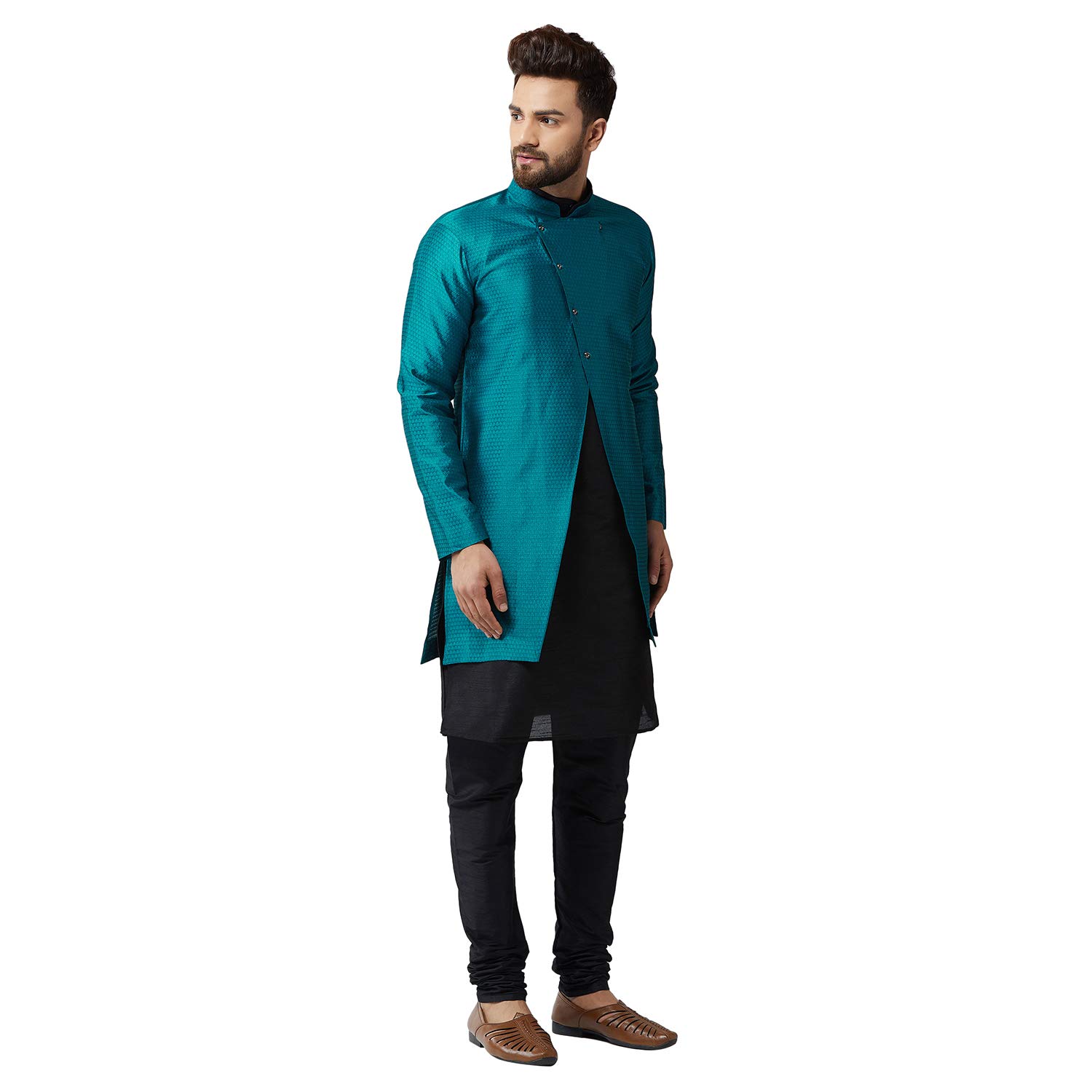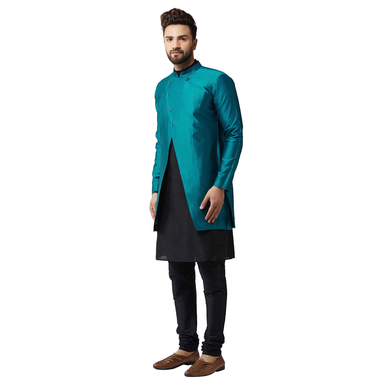 SOJANYA as a brand brings you quality and affordability. In market since 1958, we take pride in our commitment to maintain quality standards in each piece manufactured by us. A true epitome of class, this Black kurta Pyjama and designer Green Side Buttoned stylish Jacket will surely grace your presece on speacial occasions. Made from premium banarsi silk fabric, this set will surely make you the cynosure of all eyes. Team this outfit with a pair of mojris to give a classy touch to your ethnic look. |
