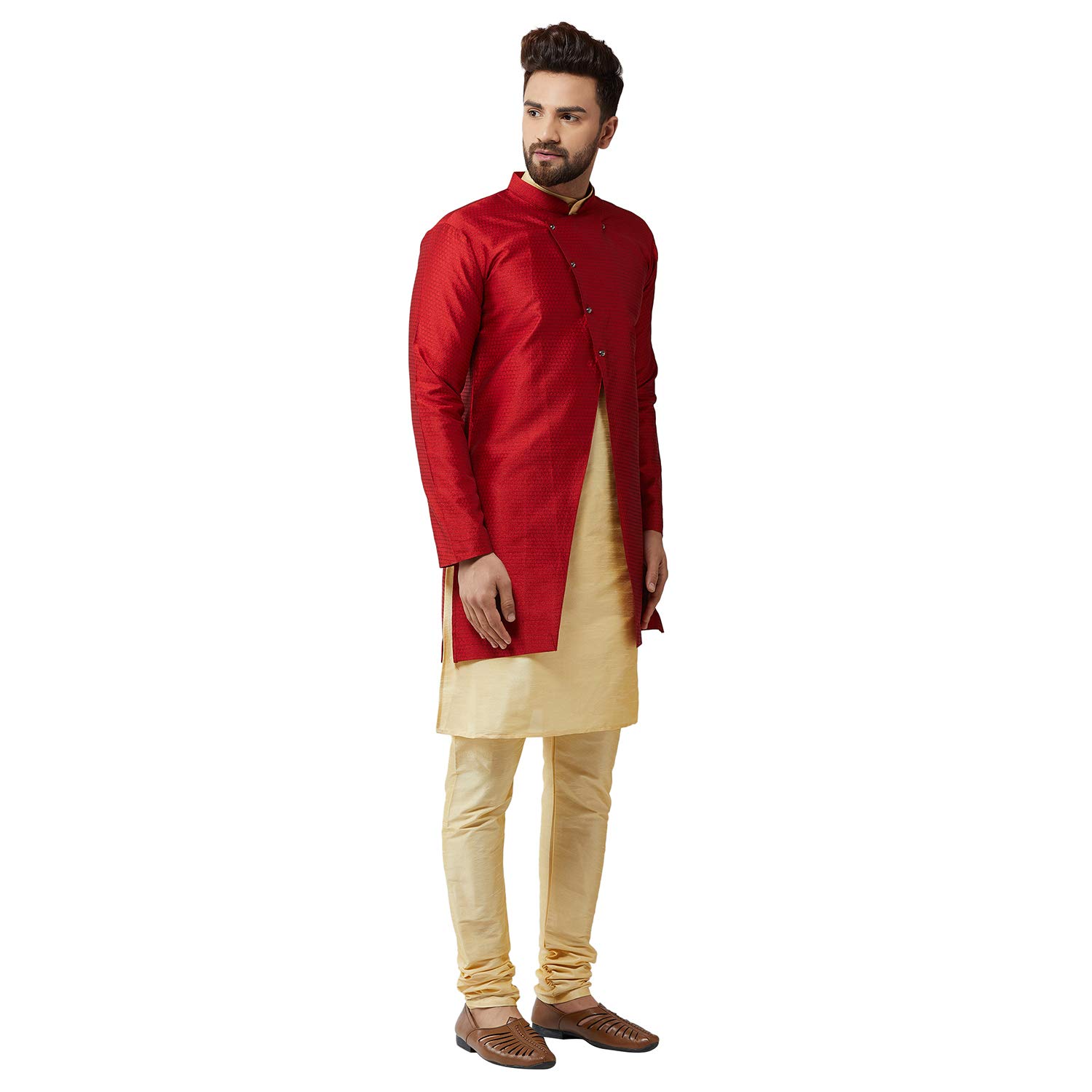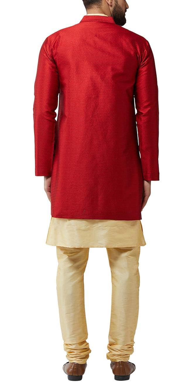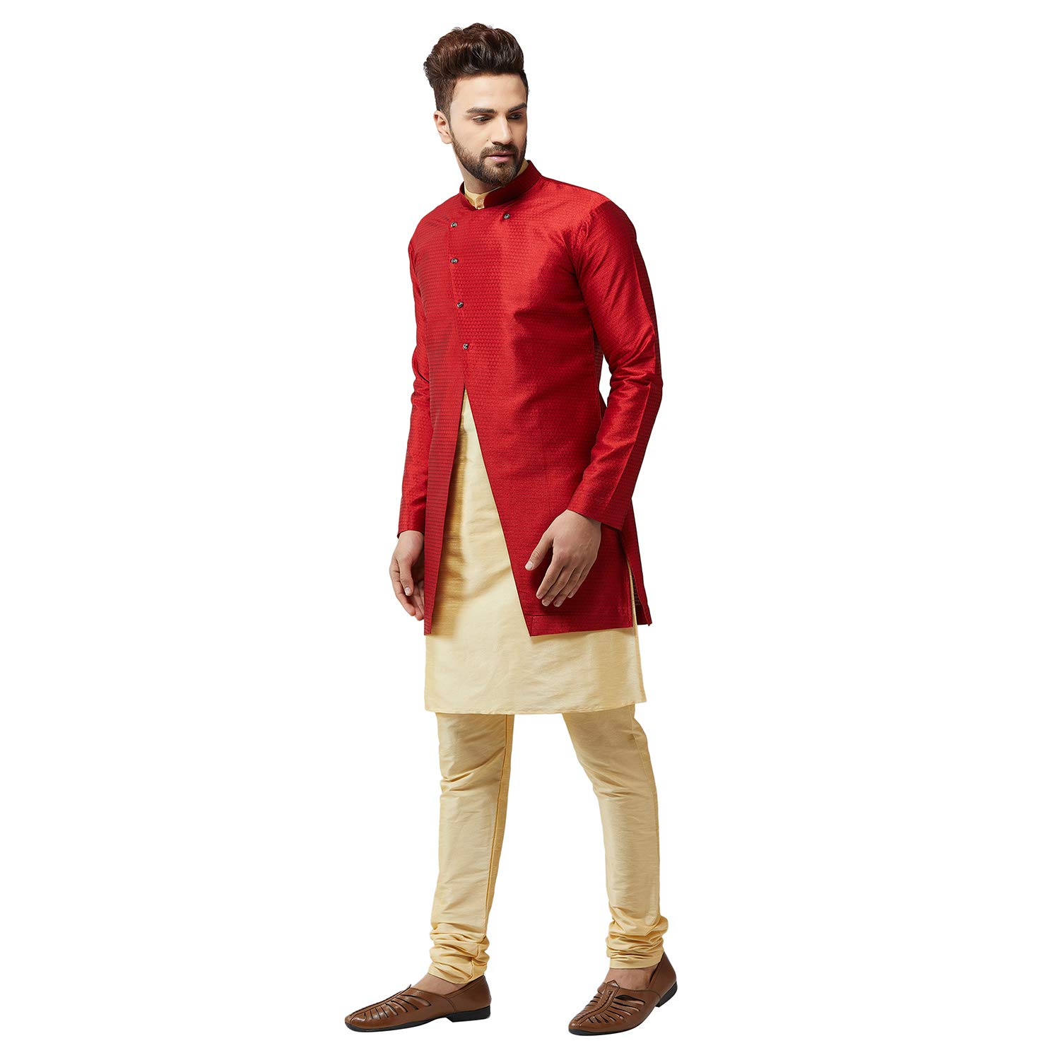 SOJANYA as a brand brings you quality and affordability. In market since 1958, we take pride in our commitment to maintain quality standards in each piece manufactured by us. A true epitome of class, this Gold kurta Pyjama and designer Royal Blue Side Buttoned stylish Jacket will surely grace your presece on speacial occasions. Made from premium banarsi silk fabric, this set will surely make you the cynosure of all eyes. Team this outfit with a pair of mojris to give a classy touch to your ethnic look. |