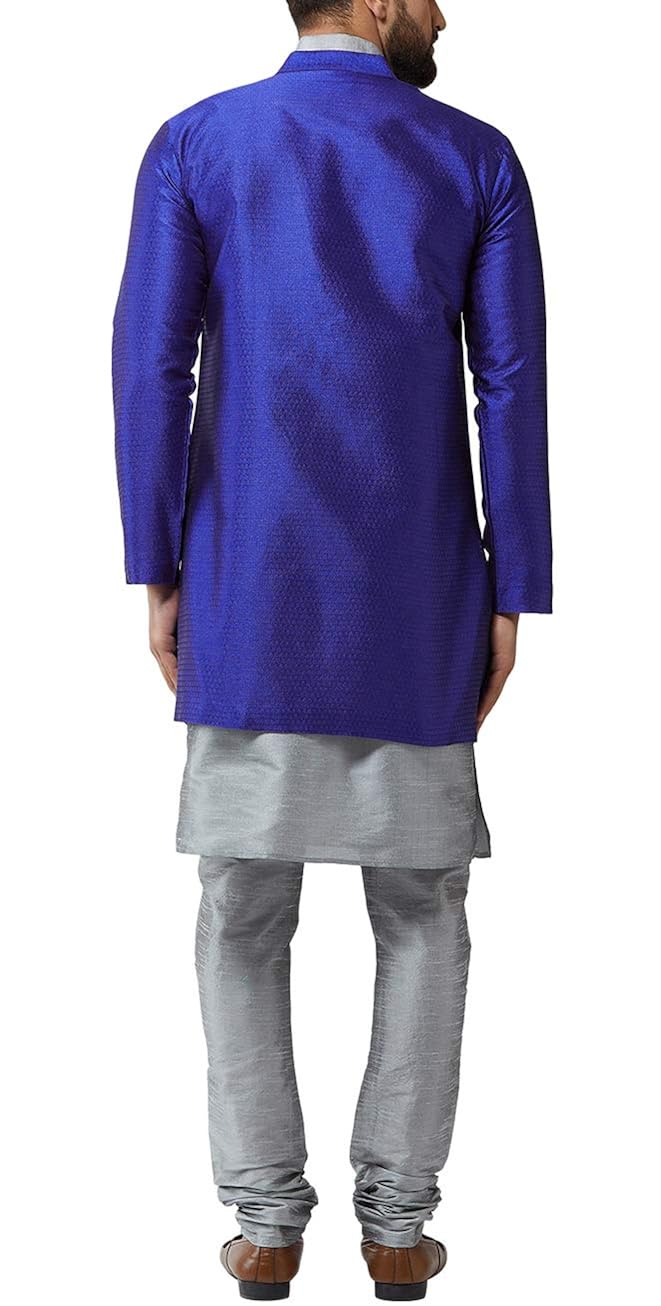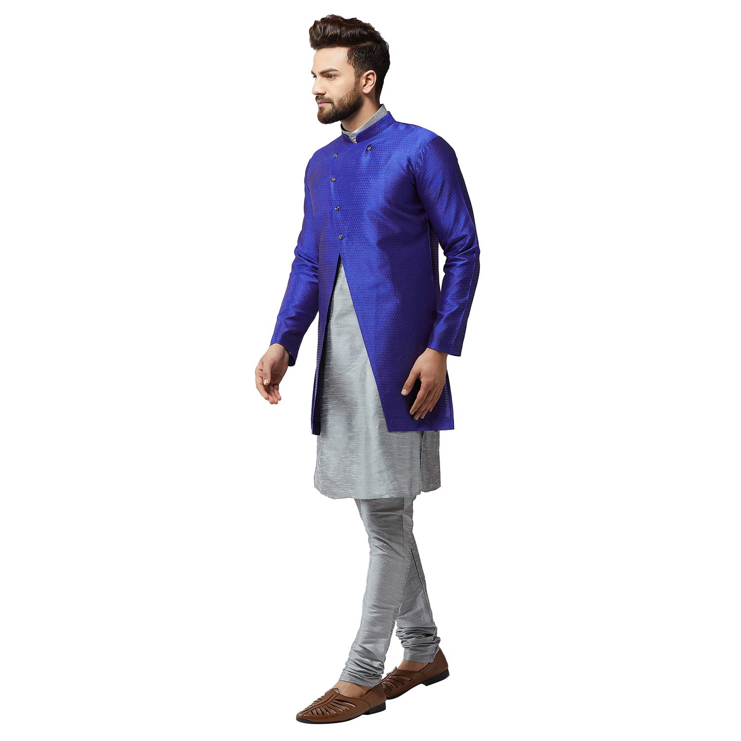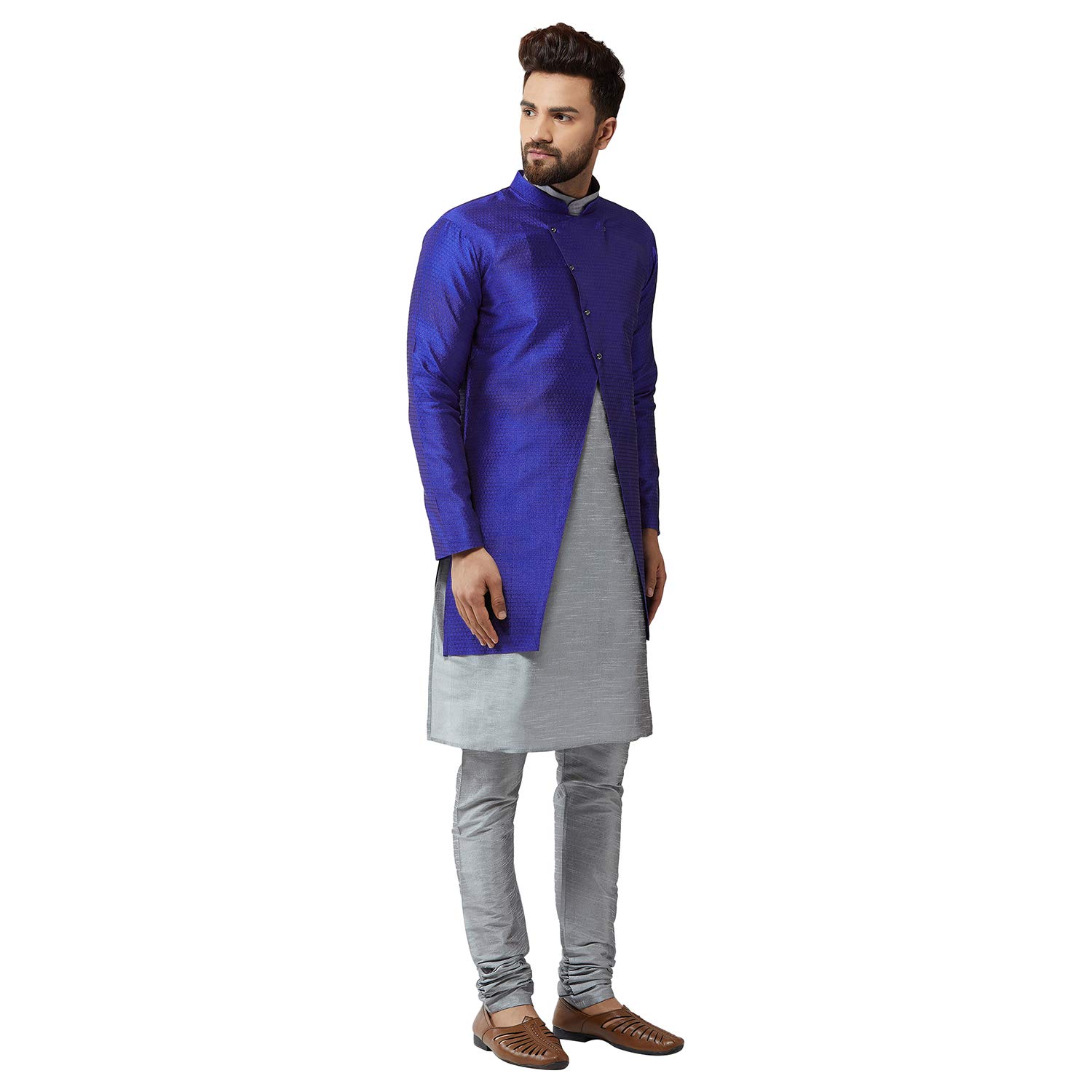 SOJANYA as a brand brings you quality and affordability. In market since 1958, we take pride in our commitment to maintain quality standards in each piece manufactured by us. A true epitome of class, this Grey kurta Pyjama and designer Black Side Buttoned stylish Jacket will surely grace your presece on speacial occasions. Made from premium banarsi silk fabric, this set will surely make you the cynosure of all eyes. Team this outfit with a pair of mojris to give a classy touch to your ethnic look. |