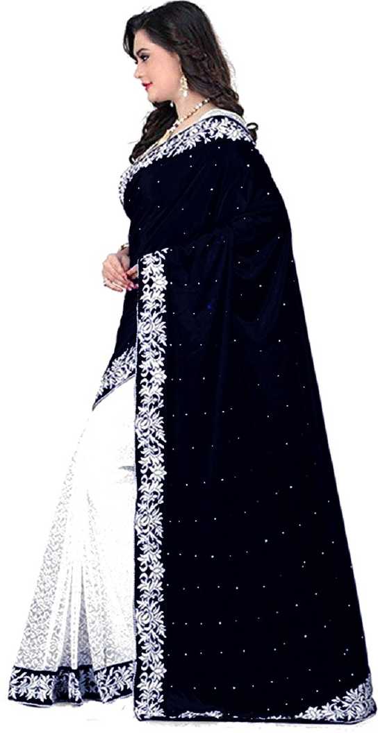 The length of the saree is 6.30 meters including the blouse piece. This is a Embroidered Georgette Velvet Half Half Saree., The pallu of the saree is Blue and it contains Embroidered Lase., The Blue fabric of pallu contains diamonds also., The other part of the saree is White colored & it contains Embroidered Lase., The Georgette fabric is anti allergy fabric, it is very smooth and comfortable to wear., The saree contains an Art Silk un-stitched blouse piece also. |