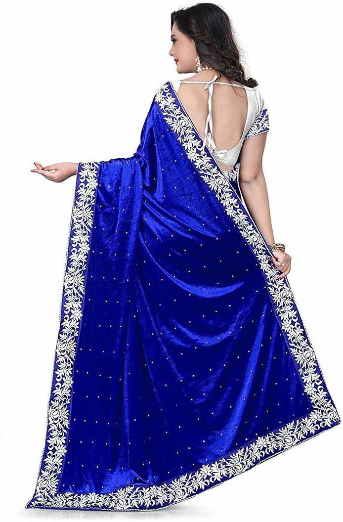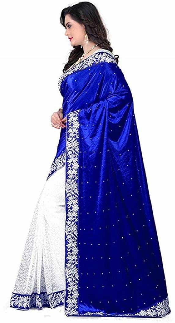 The length of the saree is 6.30 meters including the blouse piece. This is a Embroidered Georgette Velvet Half Half Saree., The pallu of the saree is Blue and it contains Embroidered Lase., The Blue fabric of pallu contains diamonds also., The other part of the saree is White colored & it contains Embroidered Lase., The Georgette fabric is anti allergy fabric, it is very smooth and comfortable to wear., The saree contains an Art Silk un-stitched blouse piece also. |