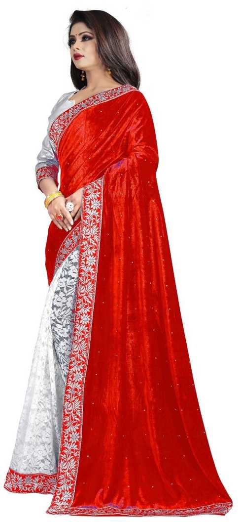 The length of the saree is 6.30 meters including the blouse piece. This is a Embroidered Georgette Velvet Half Half Saree., The pallu of the saree is Blue and it contains Embroidered Lase., The Blue fabric of pallu contains diamonds also., The other part of the saree is White colored & it contains Embroidered Lase., The Georgette fabric is anti allergy fabric, it is very smooth and comfortable to wear., The saree contains an Art Silk un-stitched blouse piece also. |