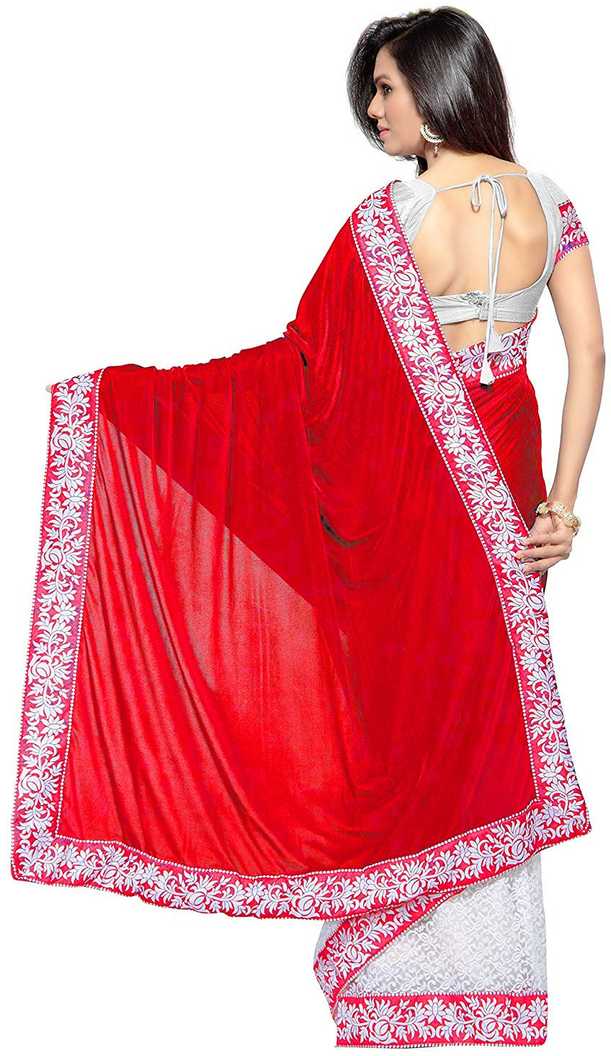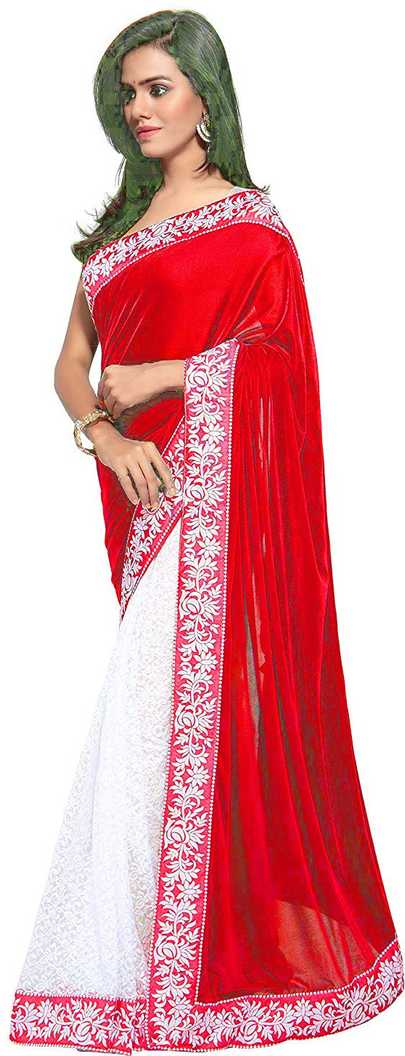 The length of the saree is 6.30 meters including the blouse piece. This is a Embroidered Georgette Velvet Half Half Saree., The pallu of the saree is Blue and it contains Embroidered Lase., The fabric of pallu contains diamonds also., The other part of the saree is White colored & it contains Embroidered Lase., The Georgette fabric is anti allergy fabric, it is very smooth and comfortable to wear., The saree contains an Art Silk un-stitched blouse piece also. |