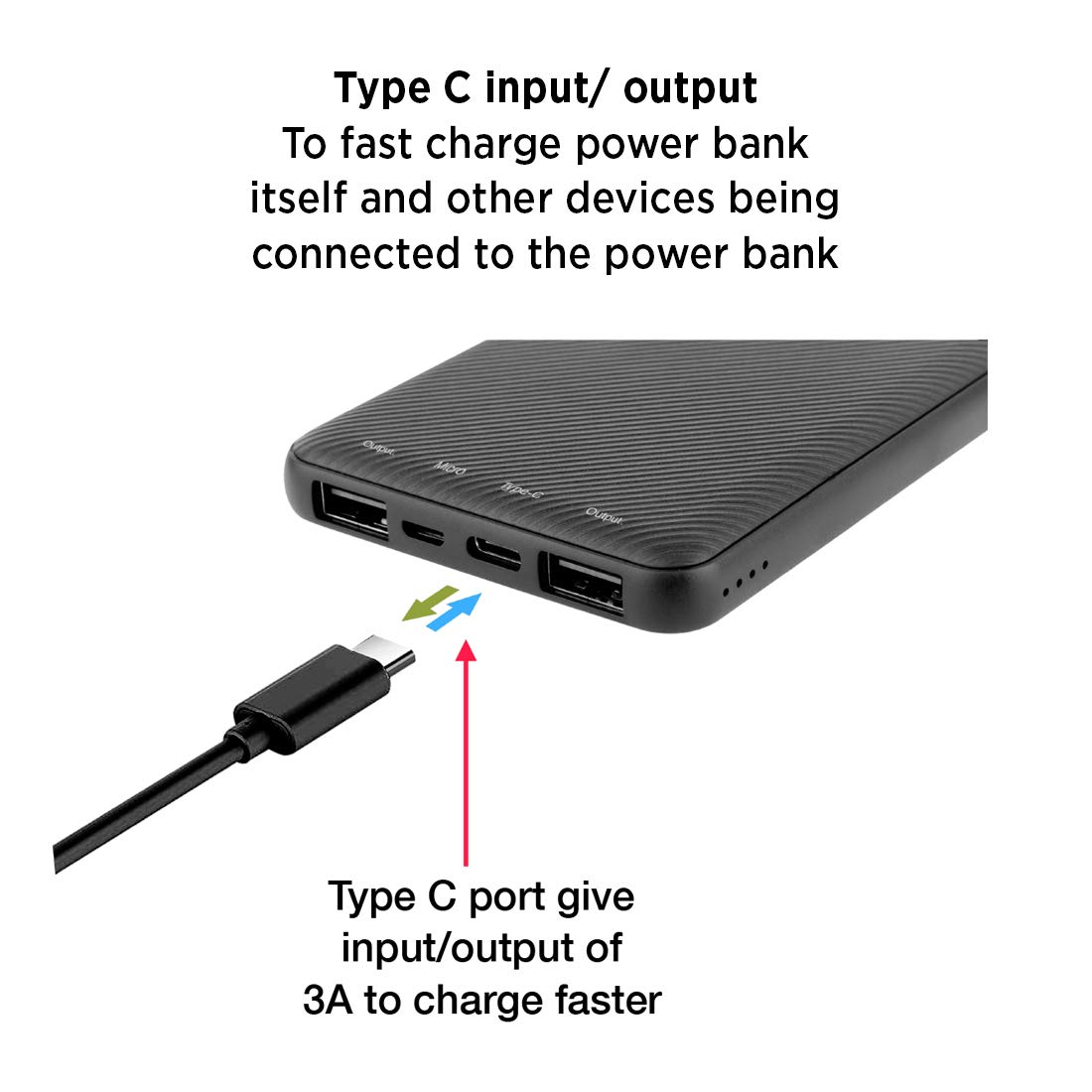 • Type C 3A input/output - For charging your devices and the power bank rapidly. 'll charge your Pixel 3 using a USB C-C cabe in 1 hour 40 minutes from 0-100%. The power bank also get completely charged in less than 5 hours using a Type C charger with USB C-C cable.