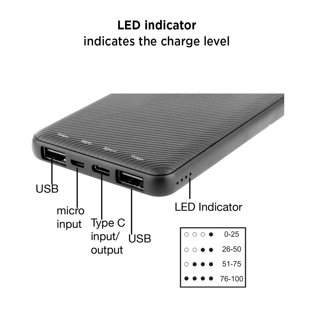 • Light weight and slim design - Textured plastic housing has made the powerbank light weight and gives good grip to carry along with ease. LED indicator - Indicates the functionality and battery level of the power bank.