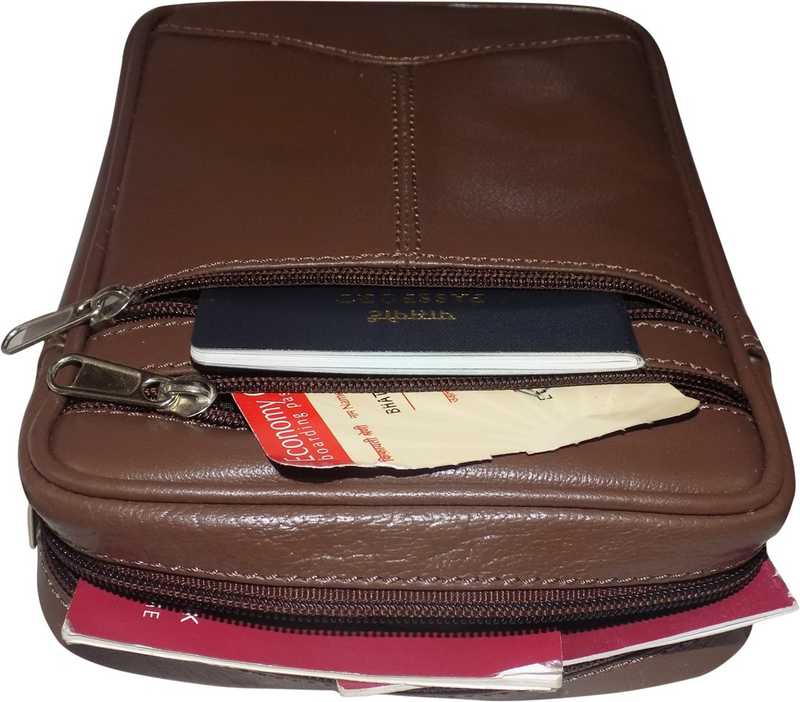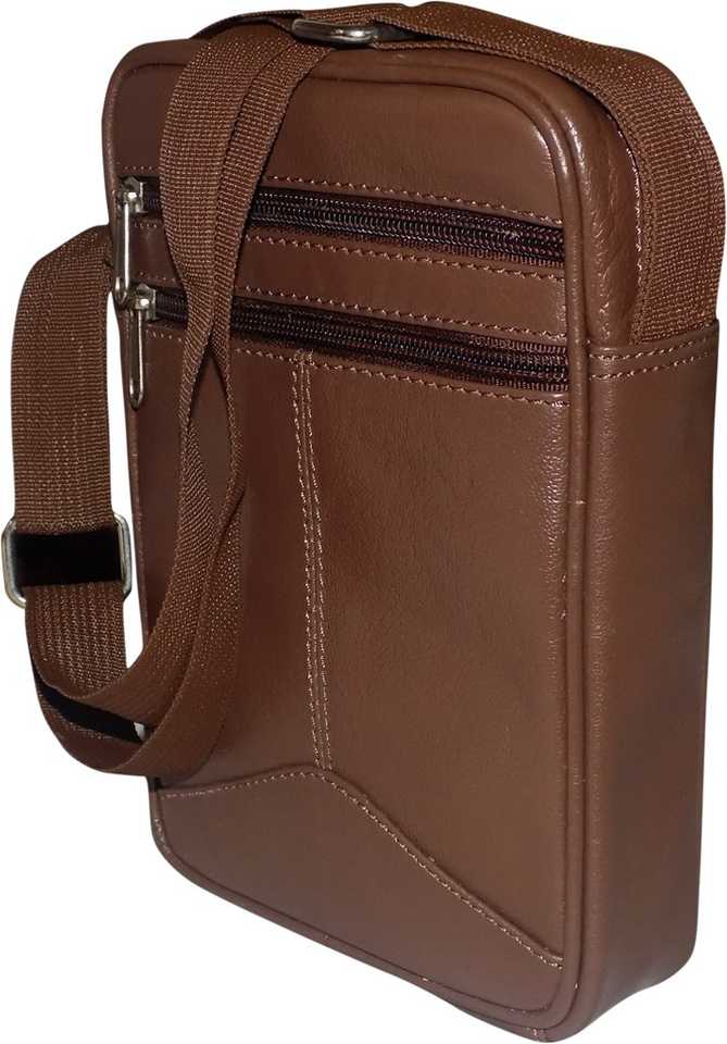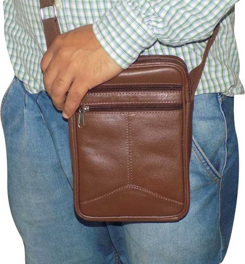 Style 98 Presents Brown sling bag designed to carry Money, Passport, Card holders and other valuables. This is made up of Milled Leather. This bag has 4 pockets with zipper closure. This bag has 4 compartments with zipper closure. This bag has a pocket in the back side. This bag is ideal for men and women.