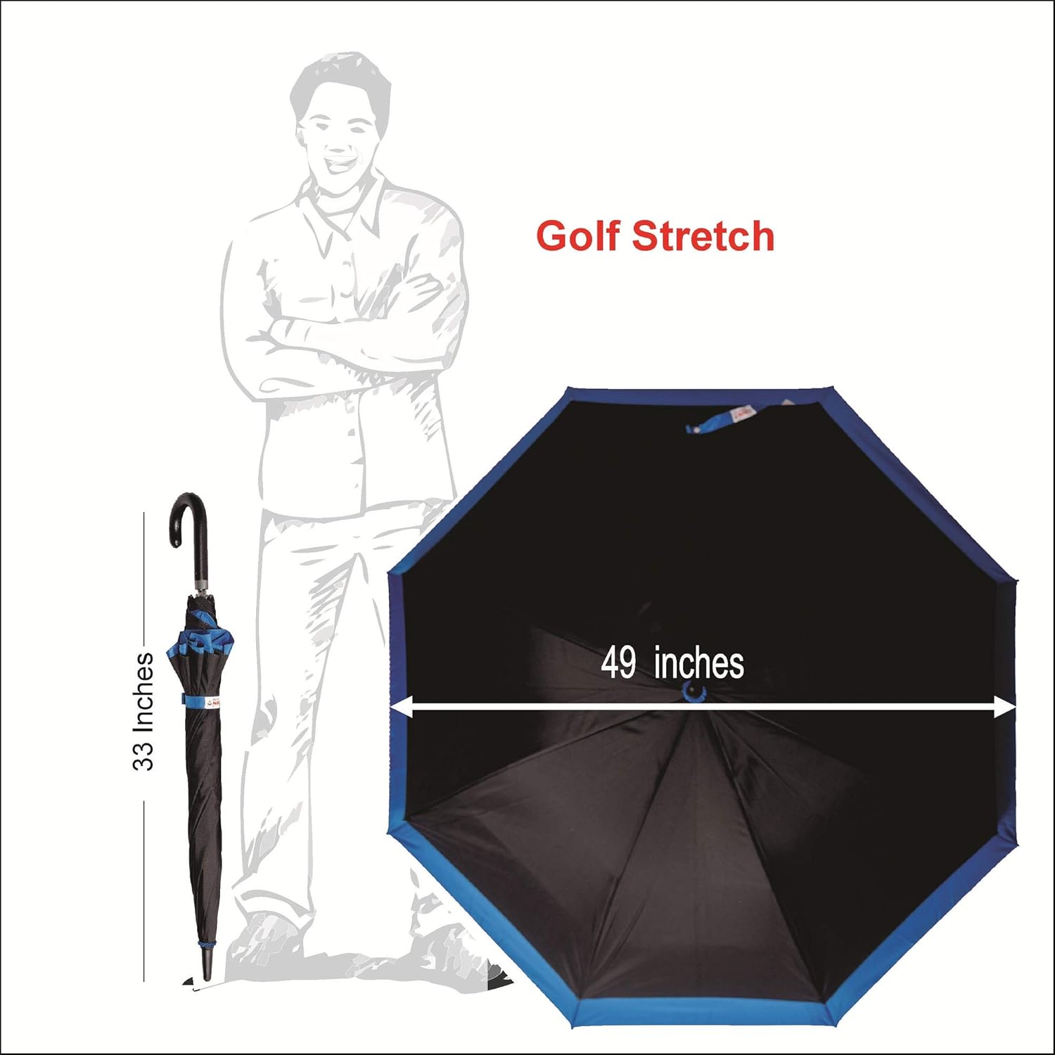 New Launch from the House of Sun Brand Umbrella - Golf 360 degree Stretch. Convenient automatic function for quick opening, high-quality sturdy system for maximum frame flexibility in stormy conditions, flexible fibreglass ribs, Imitation Leather dotted crook handle with integrated push-button, higher corrosion protection due to black galvanization of the steel shaft. The open size of the umbrella is huge and can accommodate 2 people easily under the umbrella. The thicker spoke and shaft sections, superior fabric canopies and the use of fresh granules in molding all the plastic components guarantee that your 'Sun' Brand umbrella will last many seasons. Umbrella Care - 1. Always open the umbrella pointing towards the sky 2. Always leave the umbrella to dry after use and before closing. Comes with a protective transparent cover. |