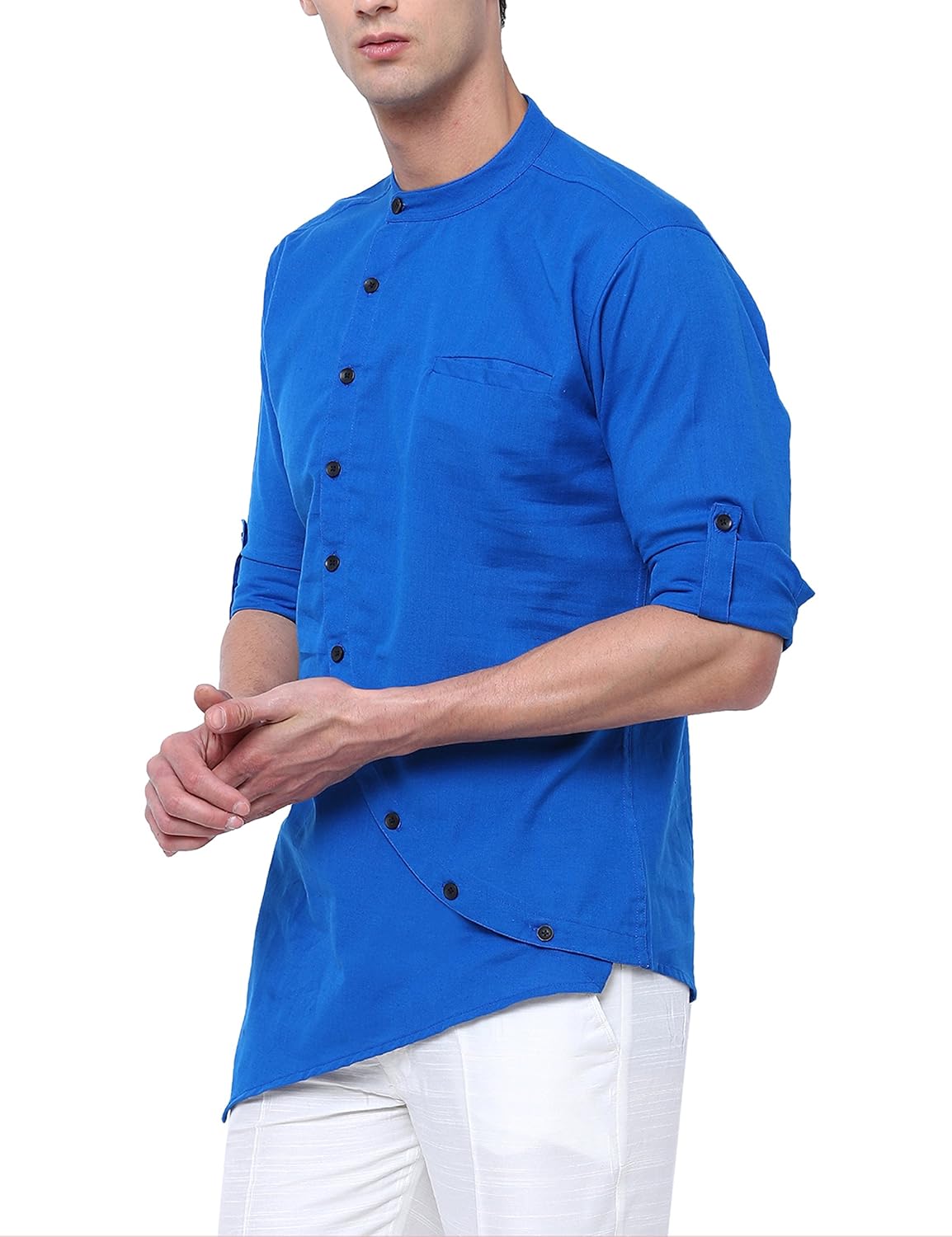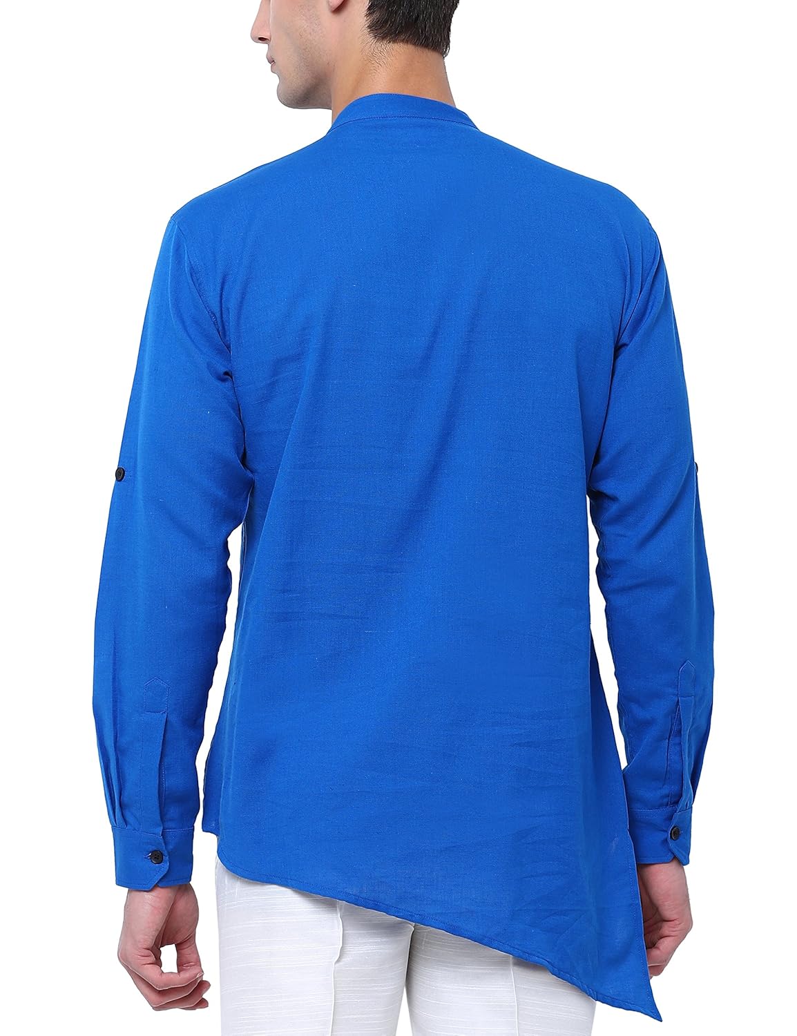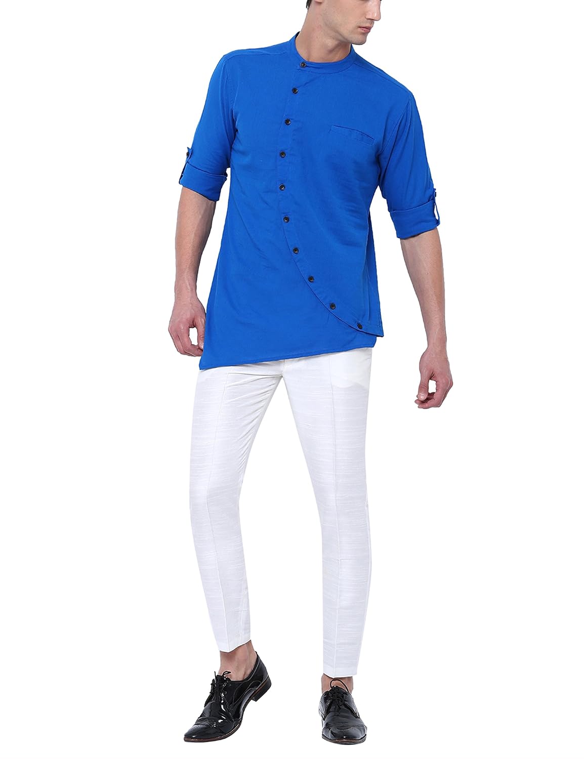 Svanik Assymetrical Short Kurta has a diagonal button closure and an assymetrical hem.It has a mandarin collar and roll up sleeves |
