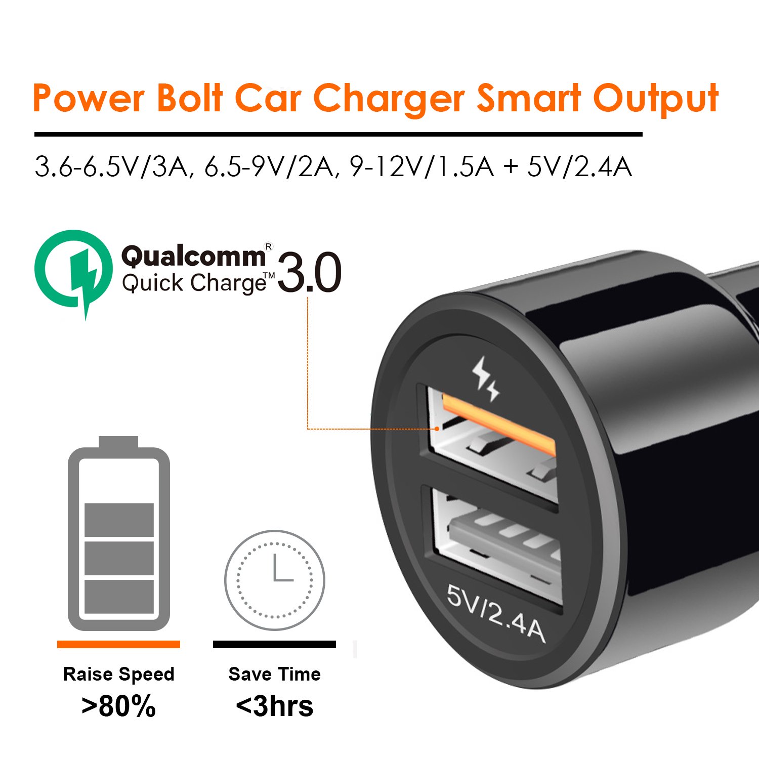 Universal fast charging - backwards compatible with qualcomm quick charge versions 1.0, 2.0 and 3.0, we ensure that even non-quick charge devices get the fastest charge possible, power bolt charges all non-quick charge 2.0 phones and tablets at their normal speed (up to 5 volts/2.4a max) with our adaptive charging technology, for example iphones and one plus 3 will be charged at max 2.4 amperes which is 2.4 times normal charging