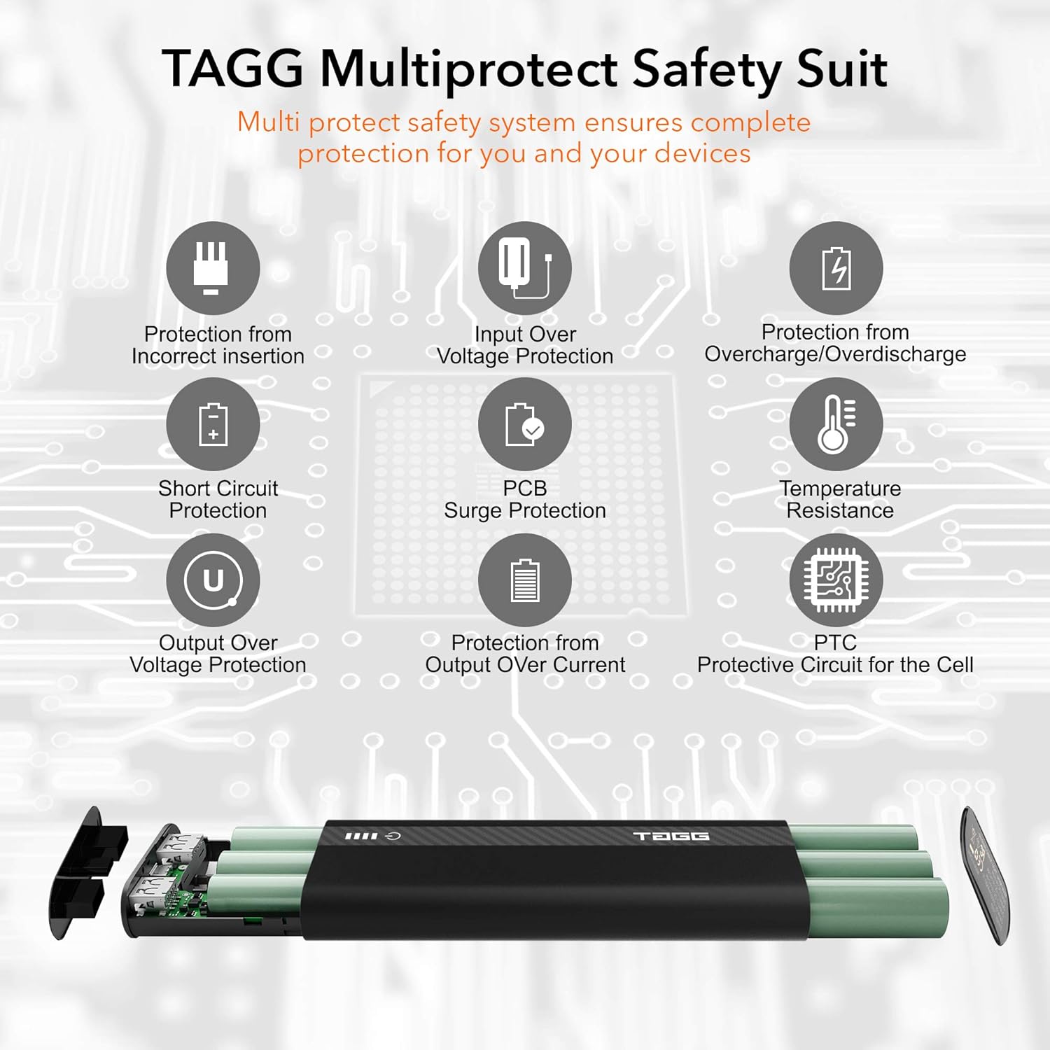 TAGG Turbo 20000, the all-new high capacity powerbank from the house of TAGG is powered with advanced technology and redefines faster and safer charging. Powered with high capacity 6x3350 mAh powerful cells along with 2.4A+2.4A fast charging output ports TAGG Turbo enables fast and stable dual device charging. The 2A input charging port charges it without any hassle and the super sturdy armored laser cut shell not only provides durability but also enhances the convenience of portability |