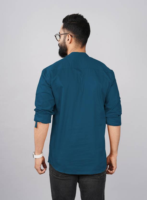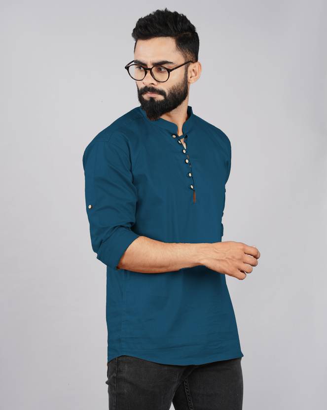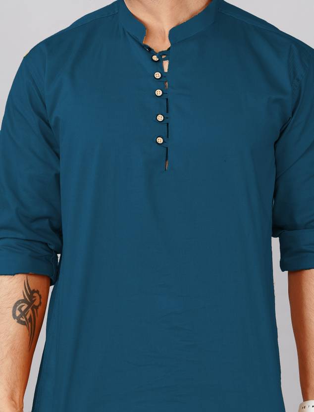 Tap in Men Solid Cotton Blend Straight Kurta (Blue)