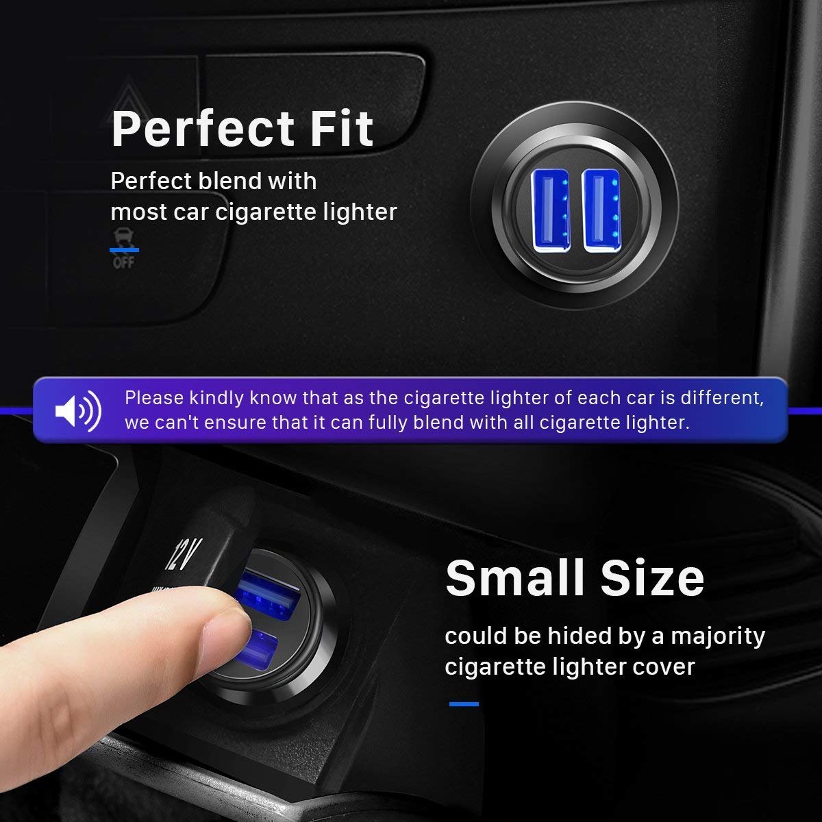 [Smallest Car Charger] Mini Size, Mega Performance. With tiny thumb-sized body, it perfectly blends with most car cigarette lighter and sits comfortably with the edge of the outlet.