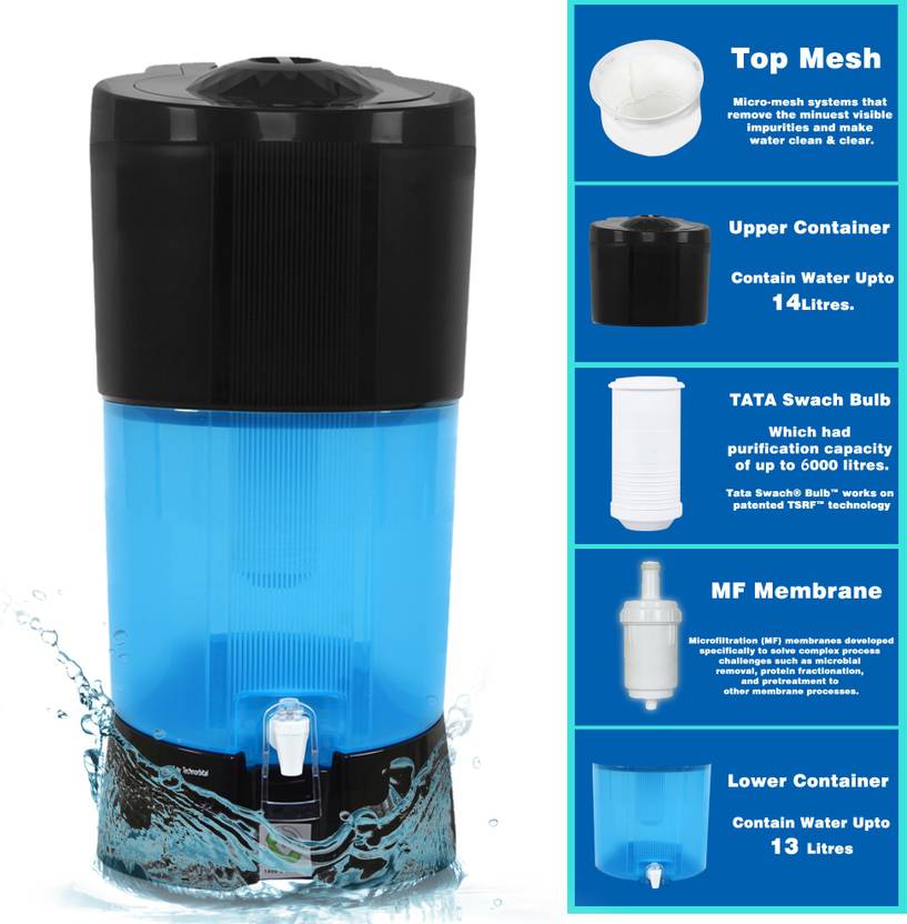 Fill your water bottles with pure and filtered water from this Tata Swach water purifier and use it for drinking, cooking and making ice. This purifier, with a 14L capacity, has an ergonomic design and an easy-to-use tap which can be used by both adults and kids. Silver Nanotechnology and MF Membrane Technology These purification technologies remove harmful bacteria, chemicals, cysts, viruses, fungi, metal particles, protozoa, algae and rust from the water to protect your family from waterborne diseases. The 14 L capacity ensures that you have access to clean water at all times. Automatic Off This purifier shuts off automatically once the filtration is done. It has a sturdy build and a sleek scratch-resistant body.