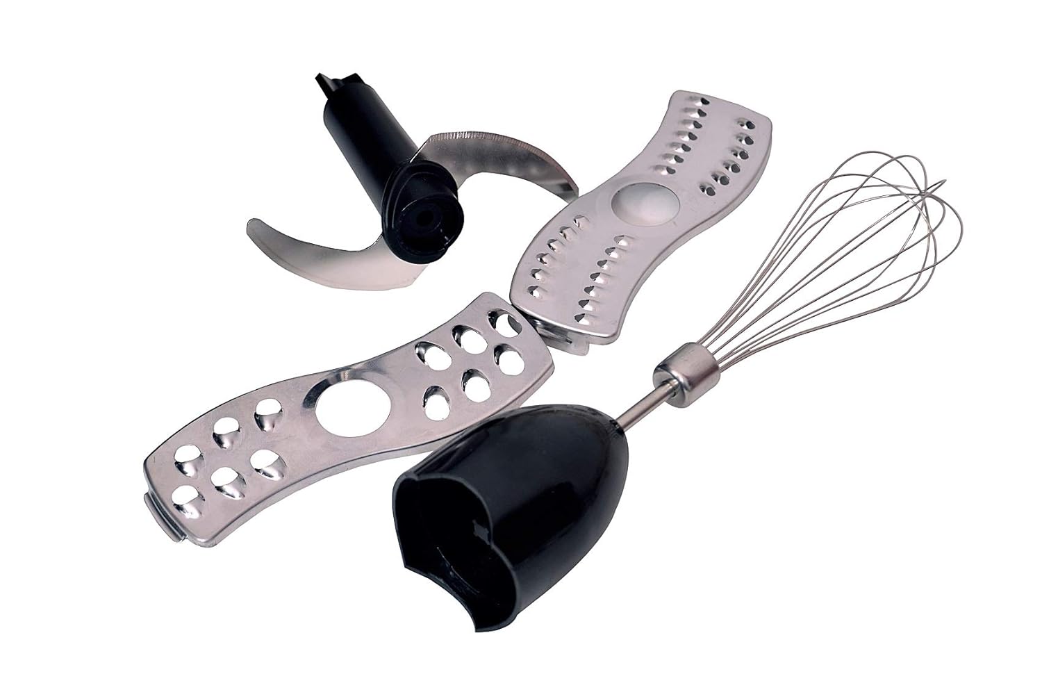 Stainless steel rod and blade, whisk, 1500ml chopper bowl, 600ml measure cup, plastic holder with s/s julienne, s/s slicer, s/s shredding blade