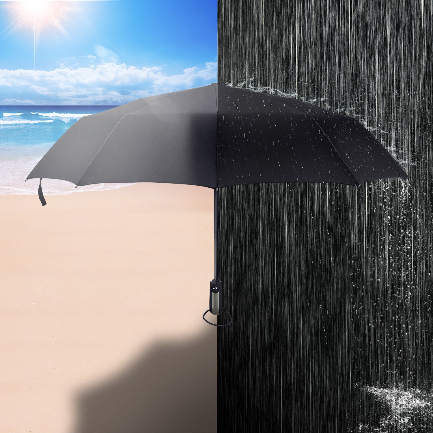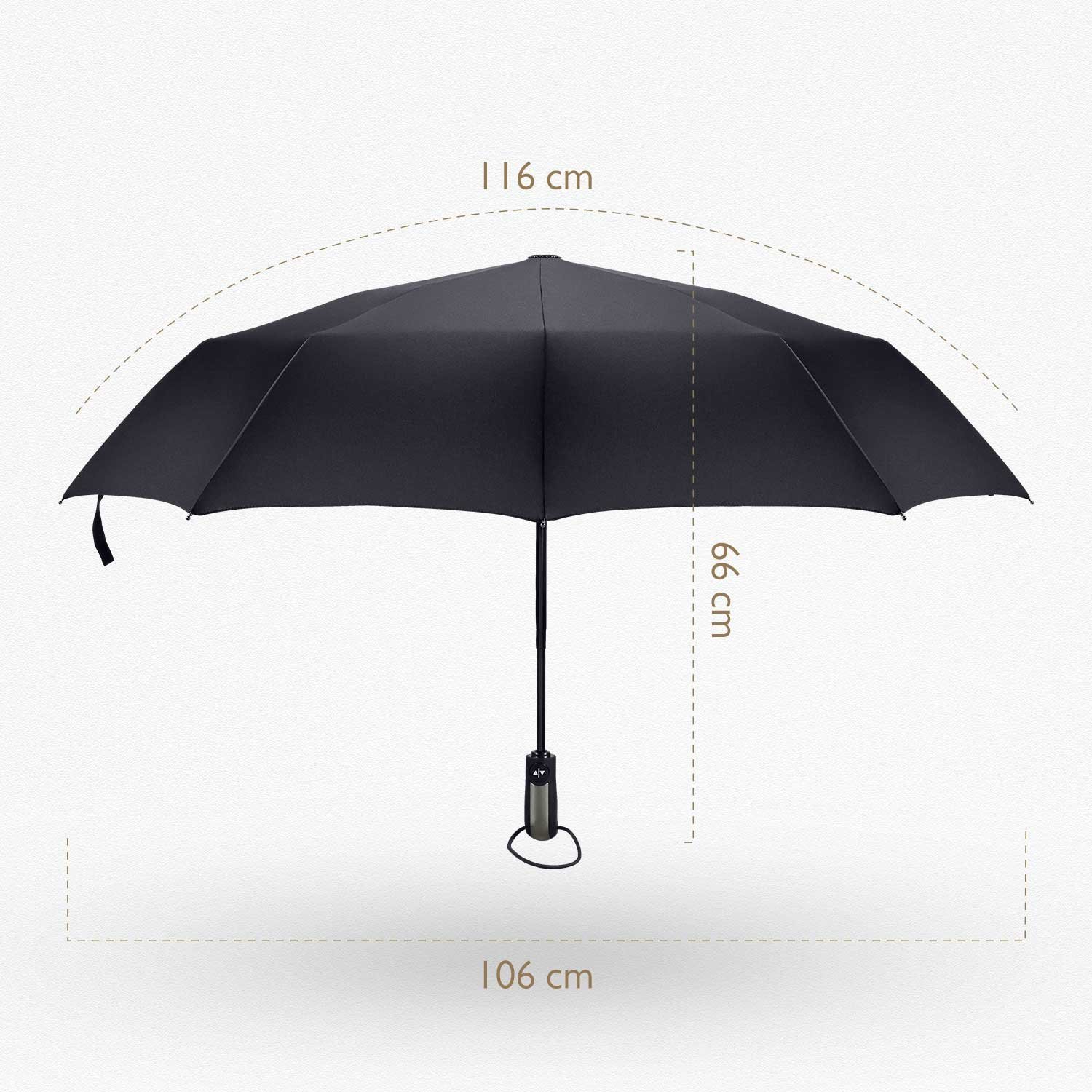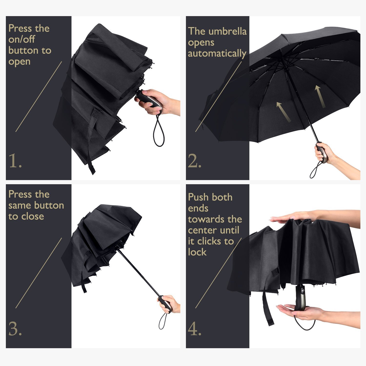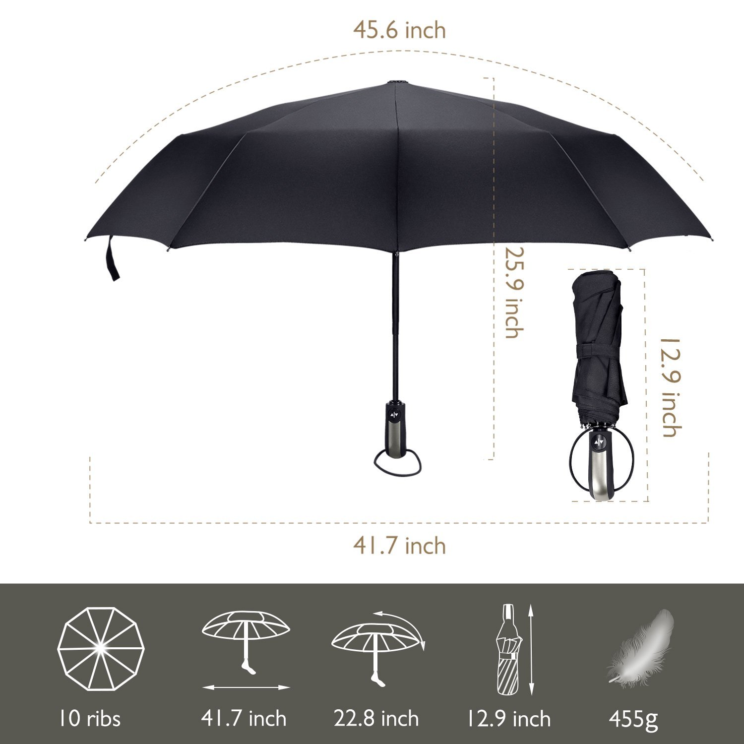 1.Automatic Open and Close: features one auto open&close button on the ergonomic handle, just one hand easy operation to expand or collapse this umbrella within a second, save your time and energy for getting in or out from your car, room, office, no matter the weather