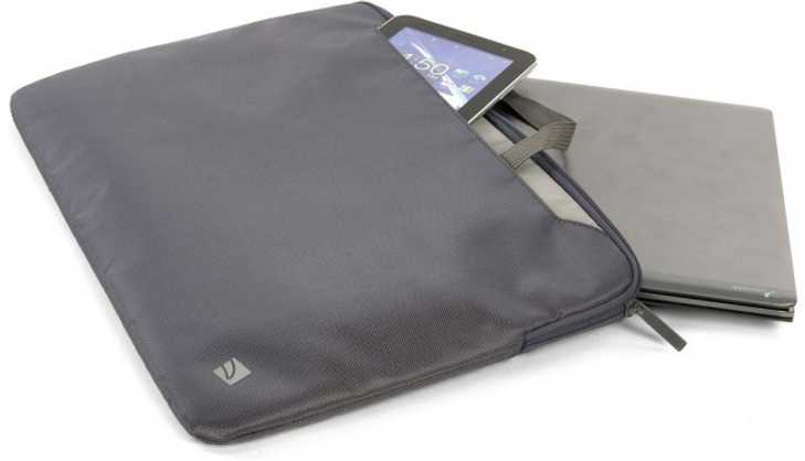 Lightweight sleeve with handles that offers simplicity and protection for 15" Ultrabooks and notebooks up to 15.6". MacBook Pro 15"/17" compatible. The exterior fabric protects the laptop from dust and scratches while the soft, scratchresistant lining guards against scuffs. The large exterior pocket provides storage for accessory items. The sleeve features two convenient, pull-out carrying handles for ease of transport.
