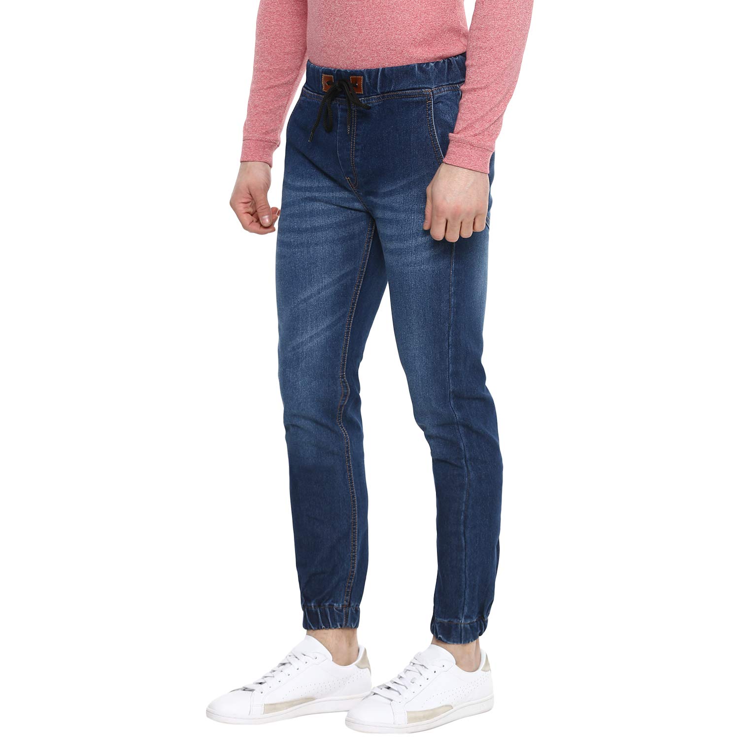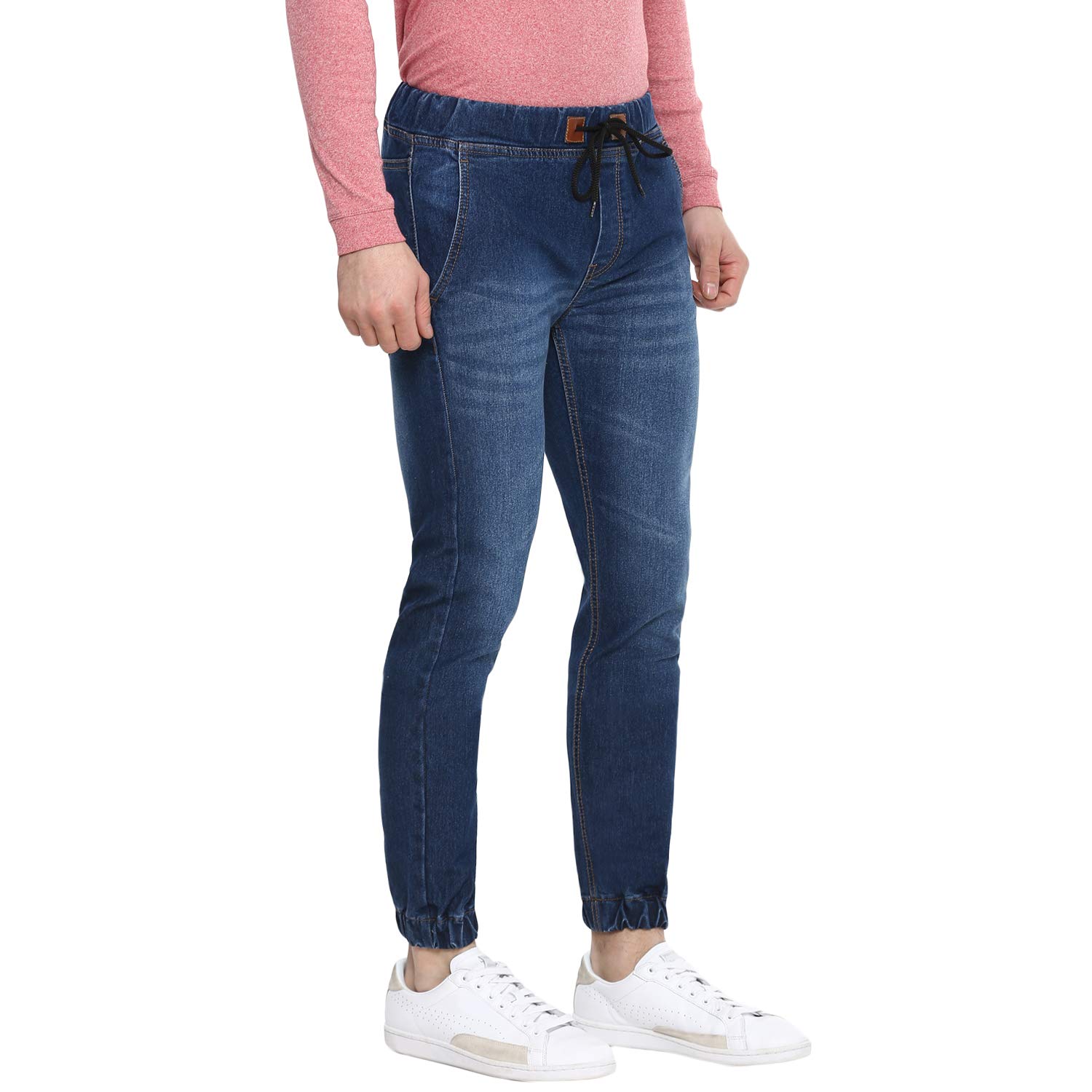 Stylish & Trendy Heavy Whisker Washed Blue Jogger Jeans - Elasticized Waistband with Drawstring & Elasticized Ankle Rib