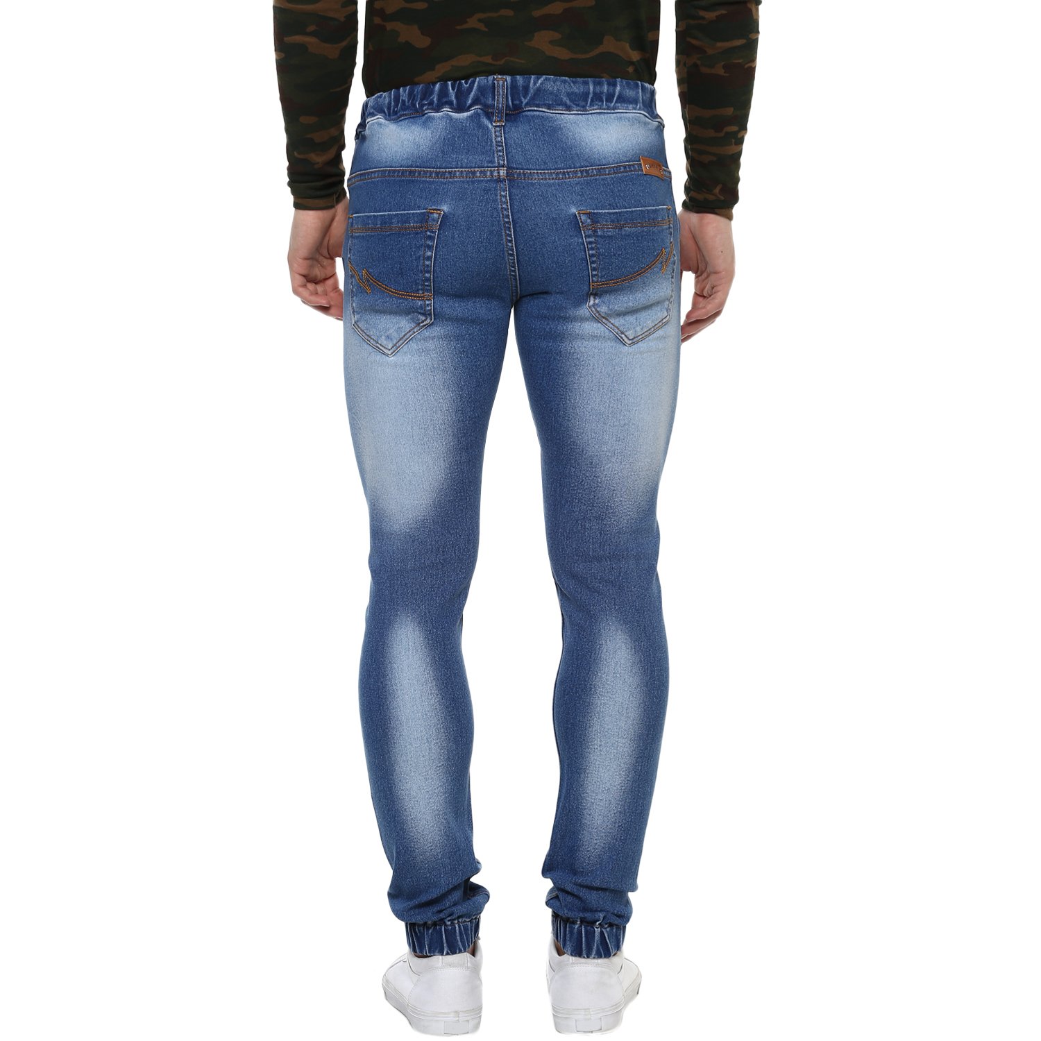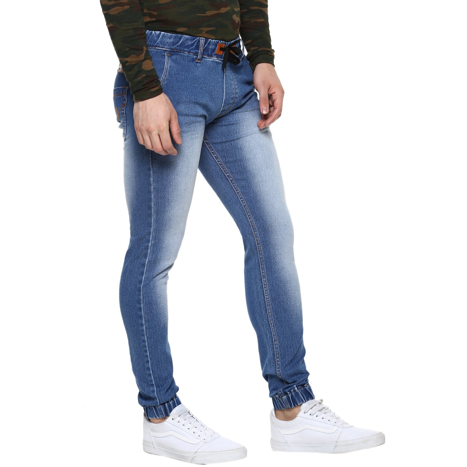Stylish Washed Blue Jogger Jeans - Elasticized Waistband with Drawstring and Elasticized Hem