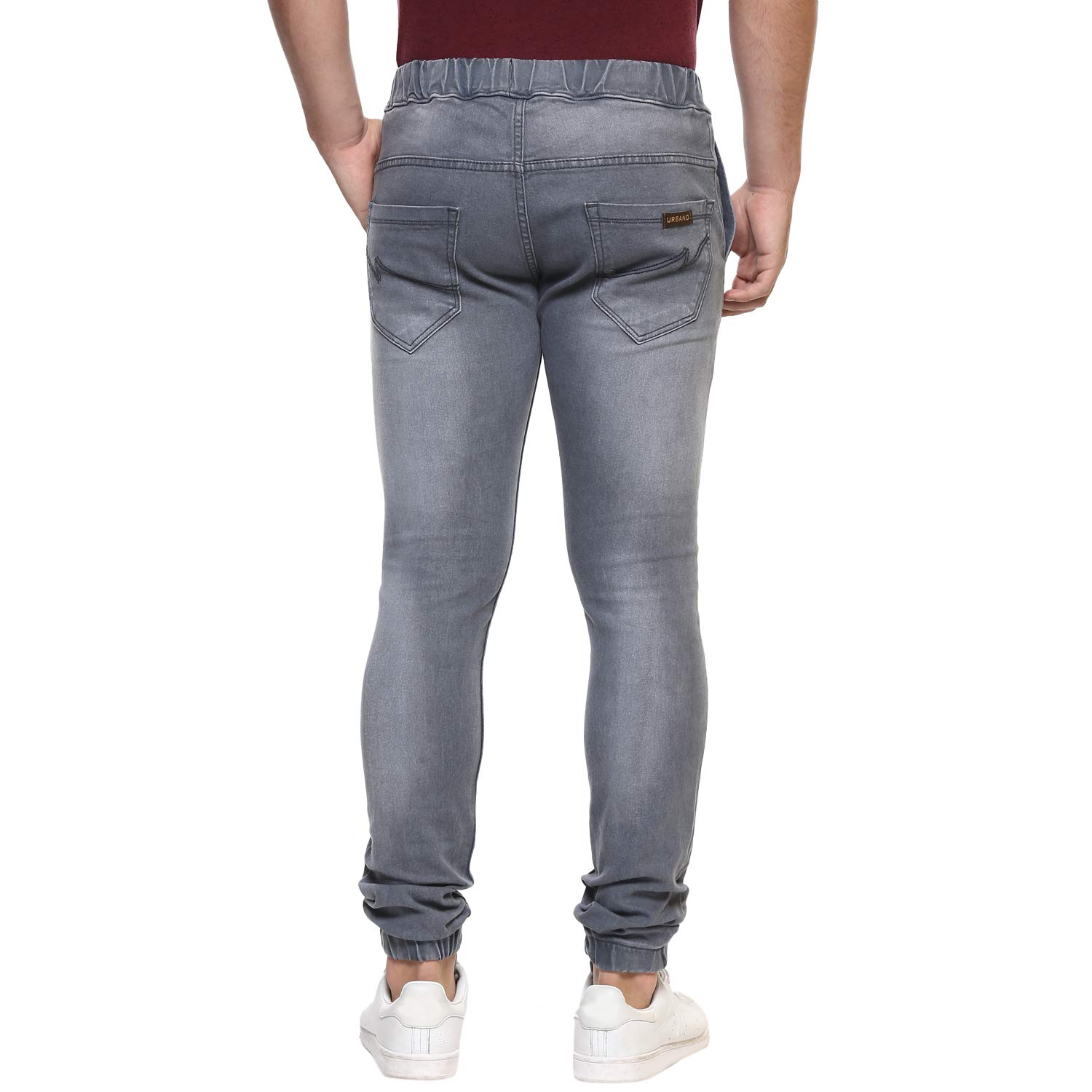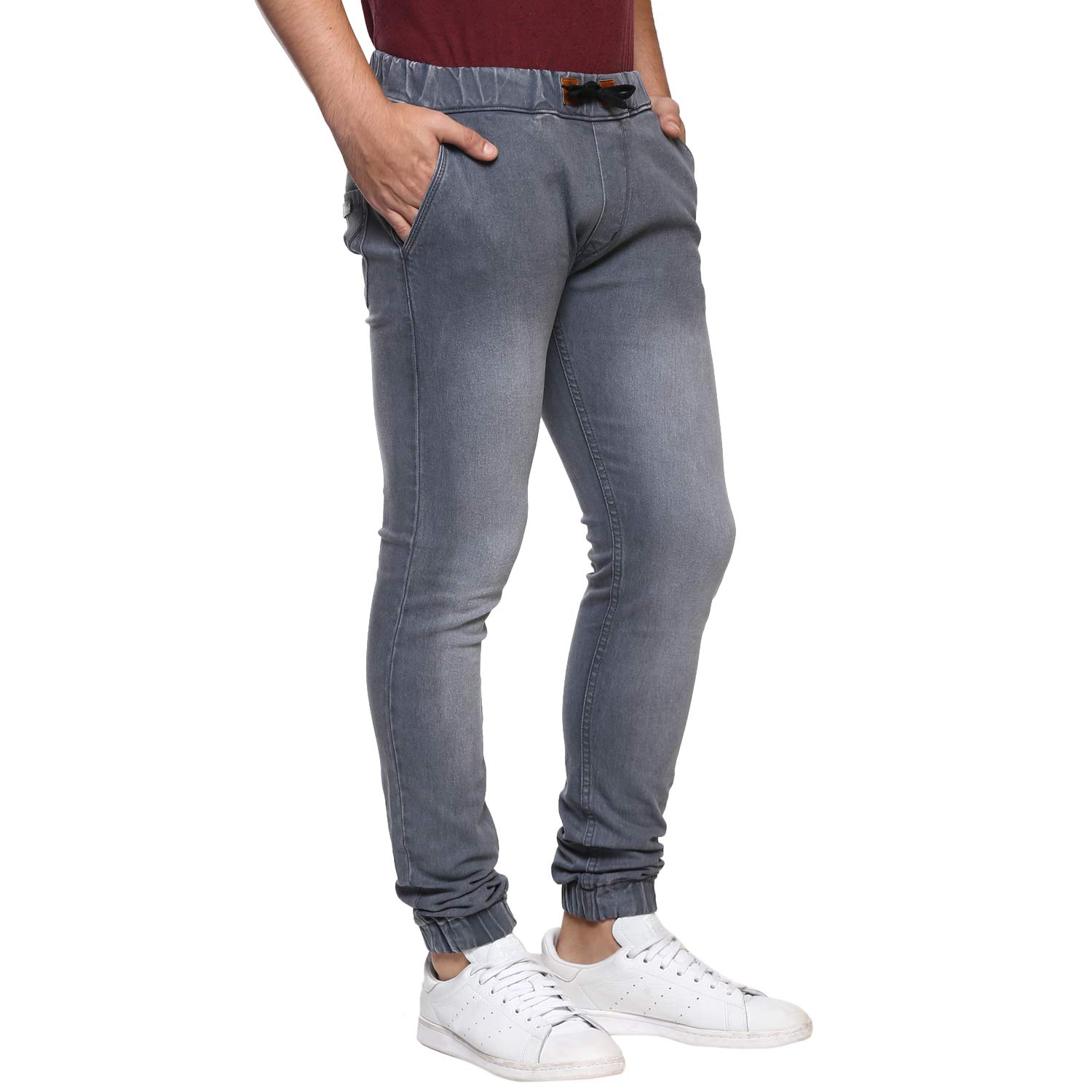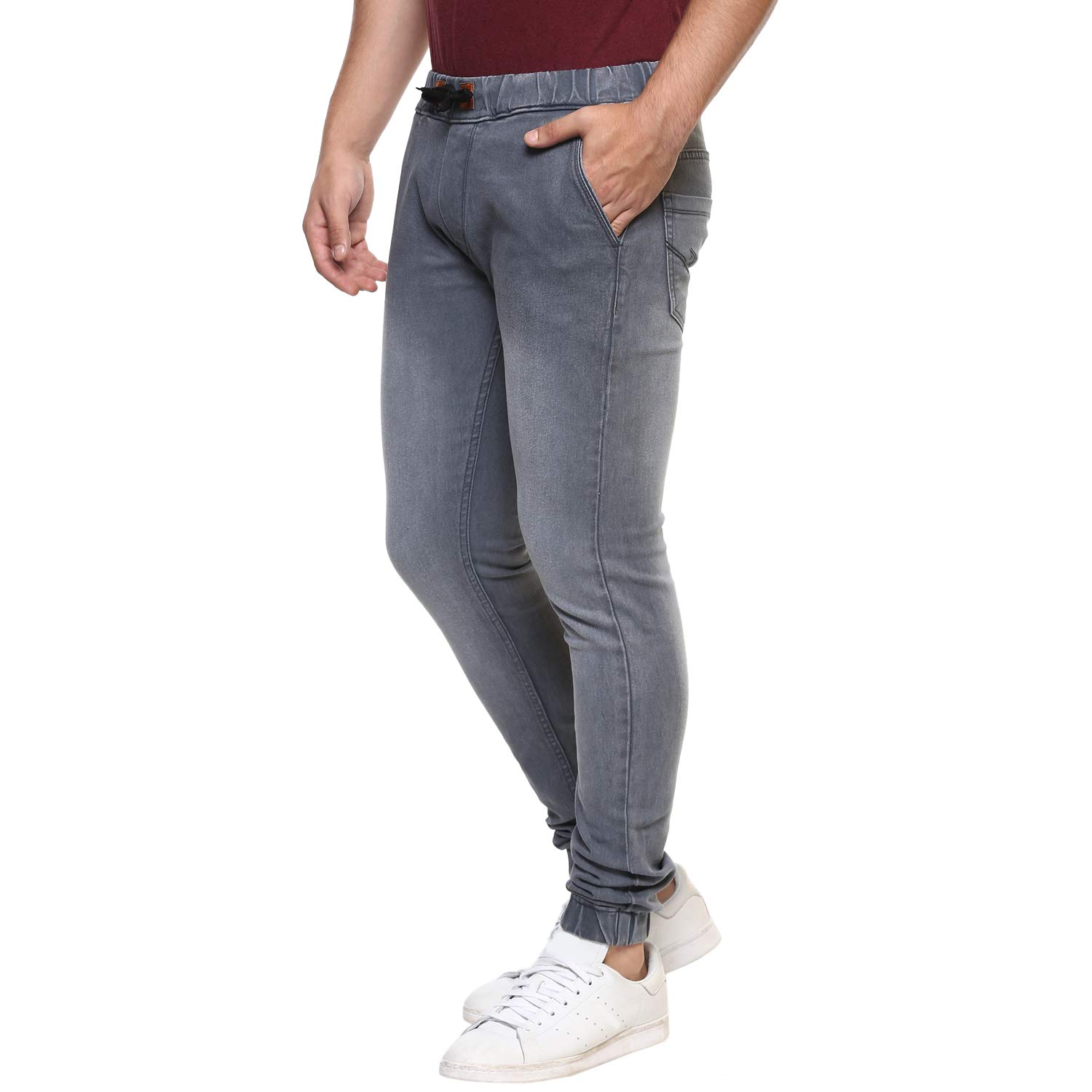 Stylish Washed Grey Jogger Jeans - Elasticized Waistband with Drawstring and Elasticized Hem