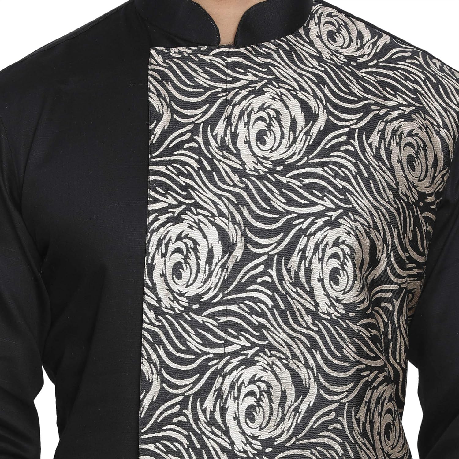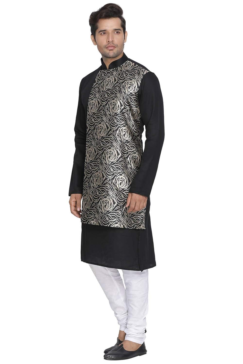 Vastramay brings to you this Stylish yet Comfortable Men Black and White A very atypical kurta with Banarasi Jaquard Drape. With Churidar Pyjama Set. Adorn it for a perfect Classy & Trendy look. Pair it with a juti or a mojari for the Royal feel. |