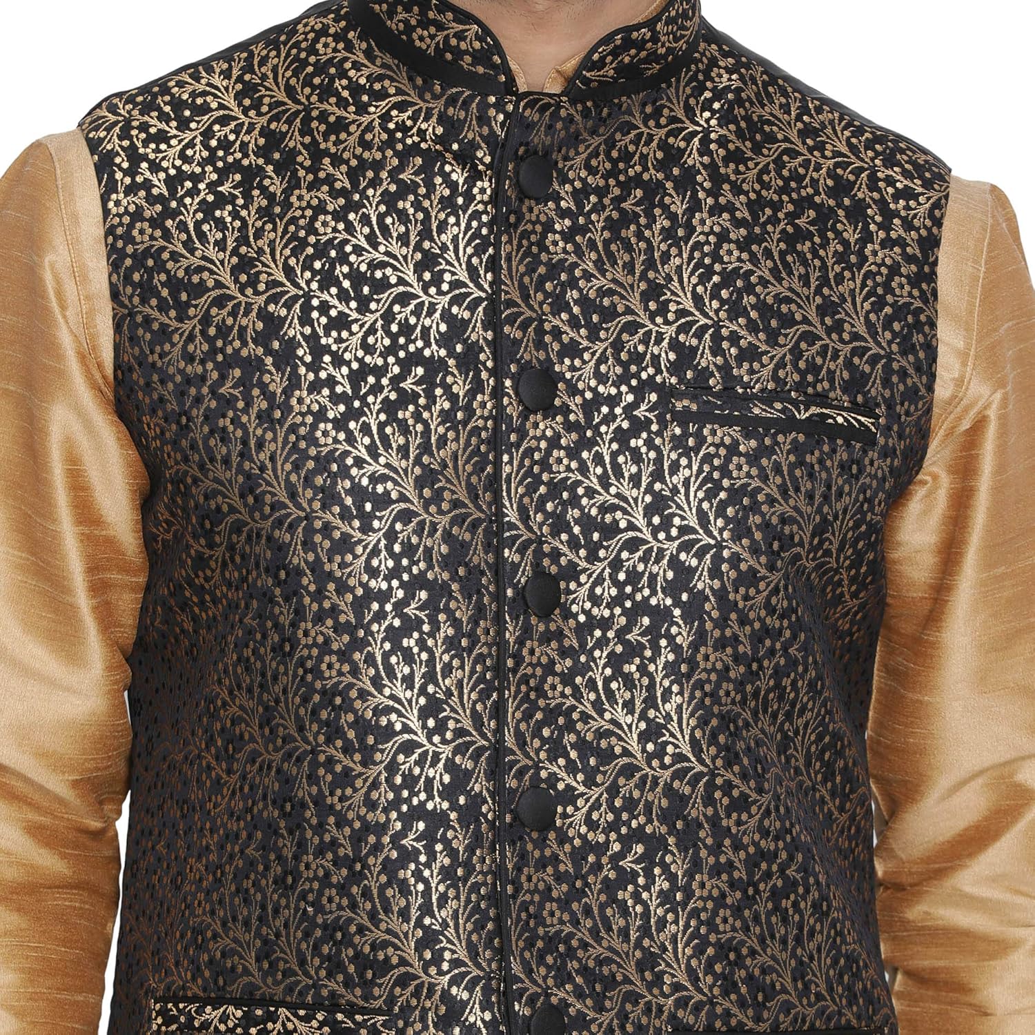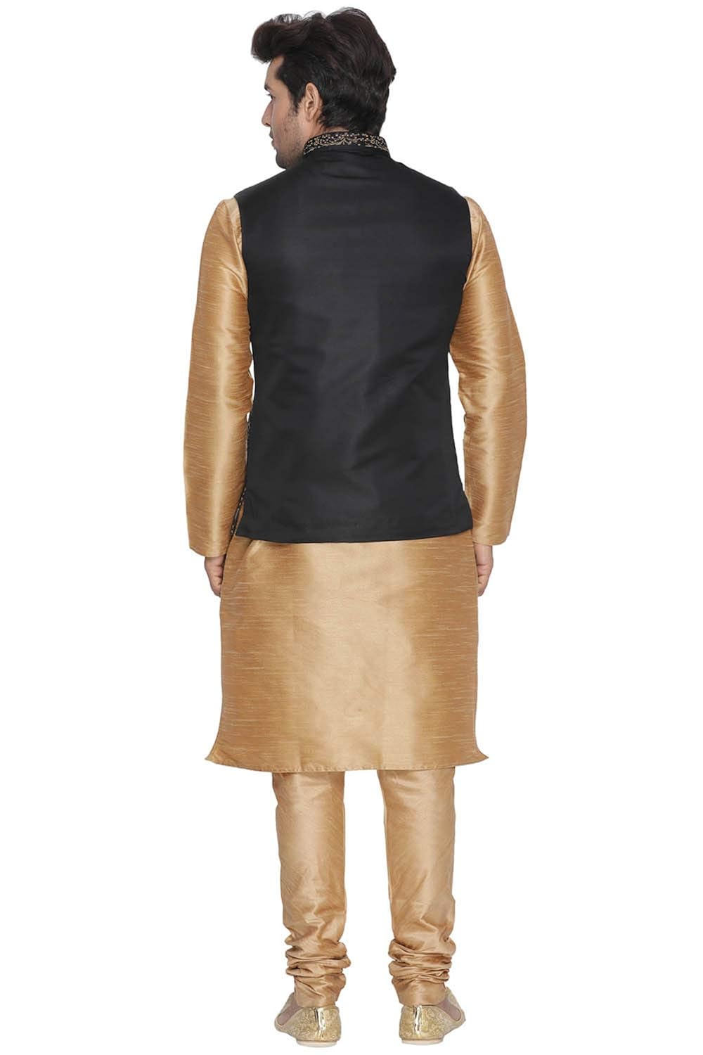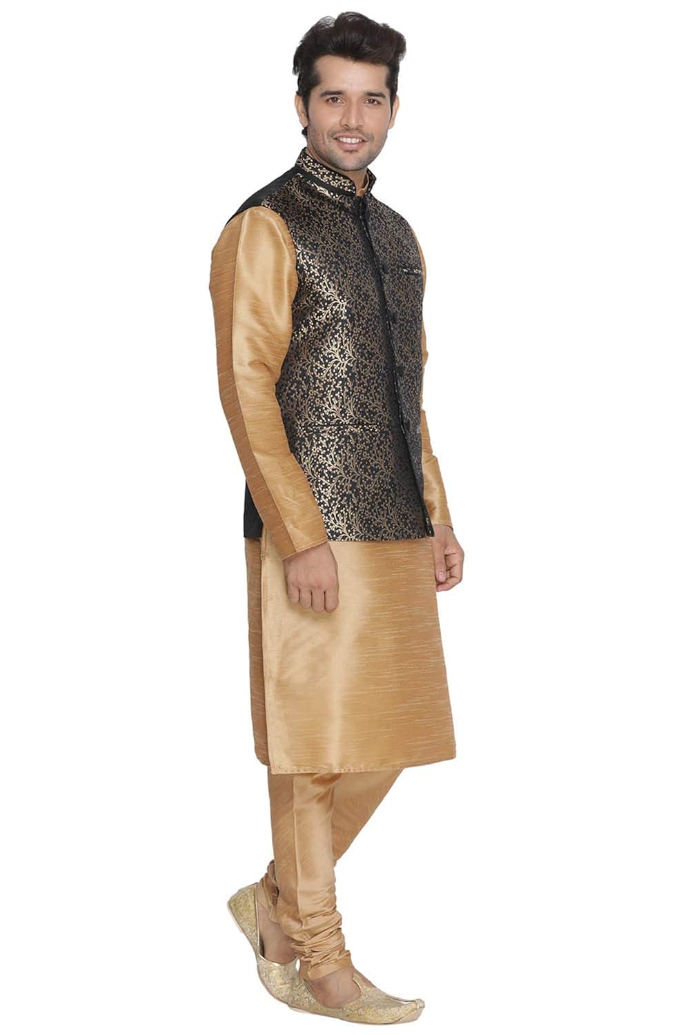 Vastramay brings to you this Stylish yet Comfortable Men Black and Rose Gold Banarasi Hand Woven Brocade Jacket With Kurta and Churidar Pyjama Set. Adorn it for a perfect Classy & Trendy look. Pair it with a juti or a mojari for the Royal feel. |